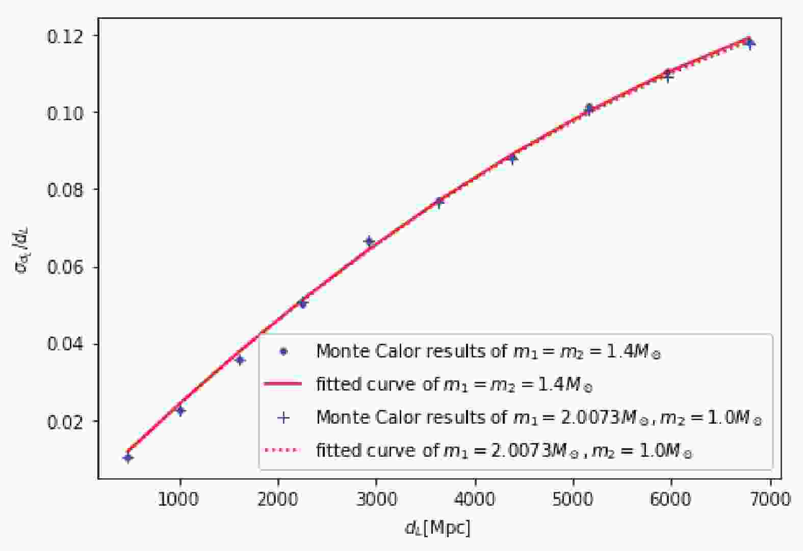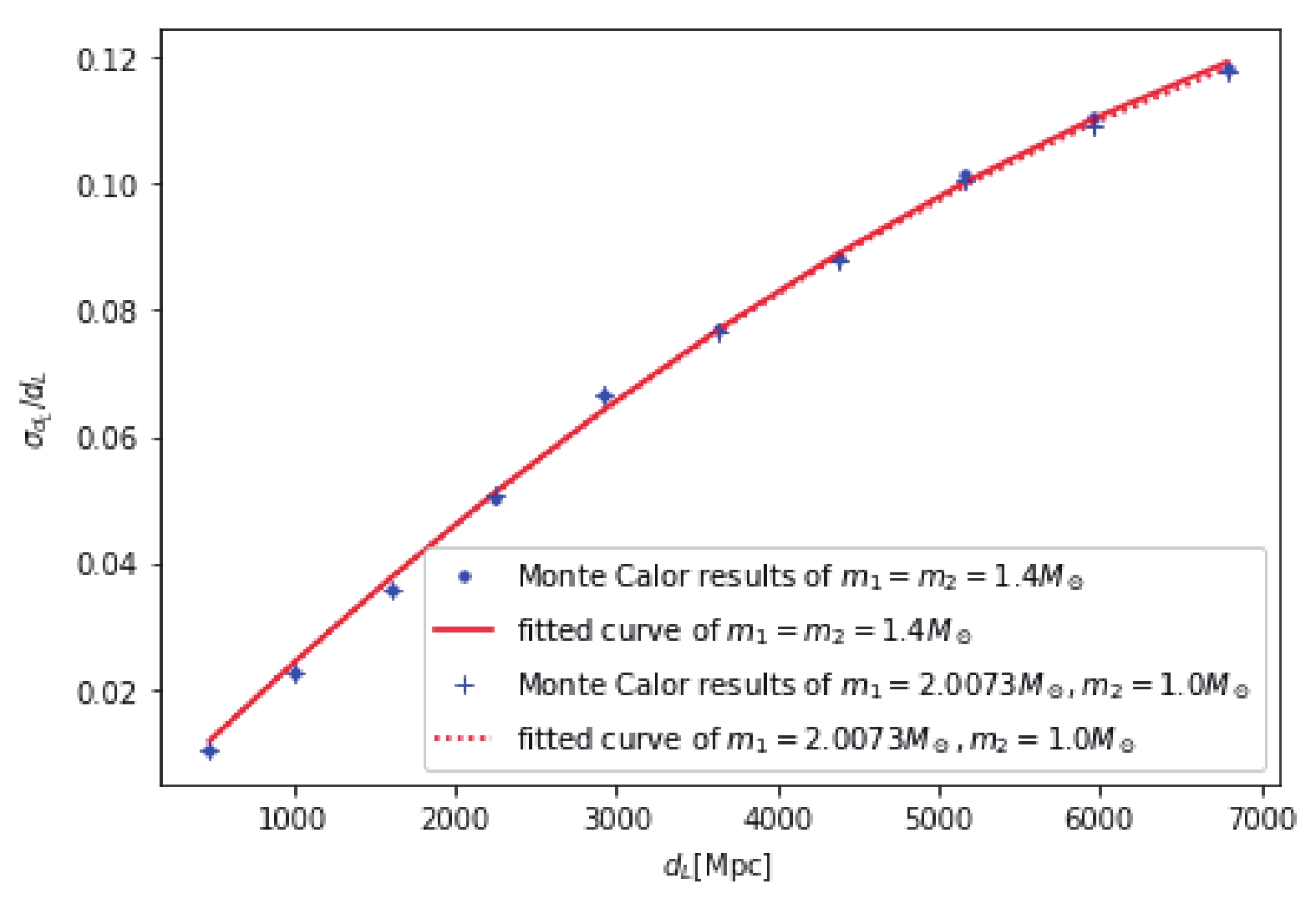 $\sigma_{d_L}/{d_L} $ as a function of redshift$d_L$ . The blue dots/pluses denote the results based on Monte Carlo sampling for the cases of equal mass and large mass ratio, respectively. The red solid curve denotes the fit (Eq. (2)) for the case of equal mass, and the red dashed line denotes the fit for the case of large mass ratio.In the simulations of the next section, the errors induced by weak lensing and peculiar velocity should also be considered. The total