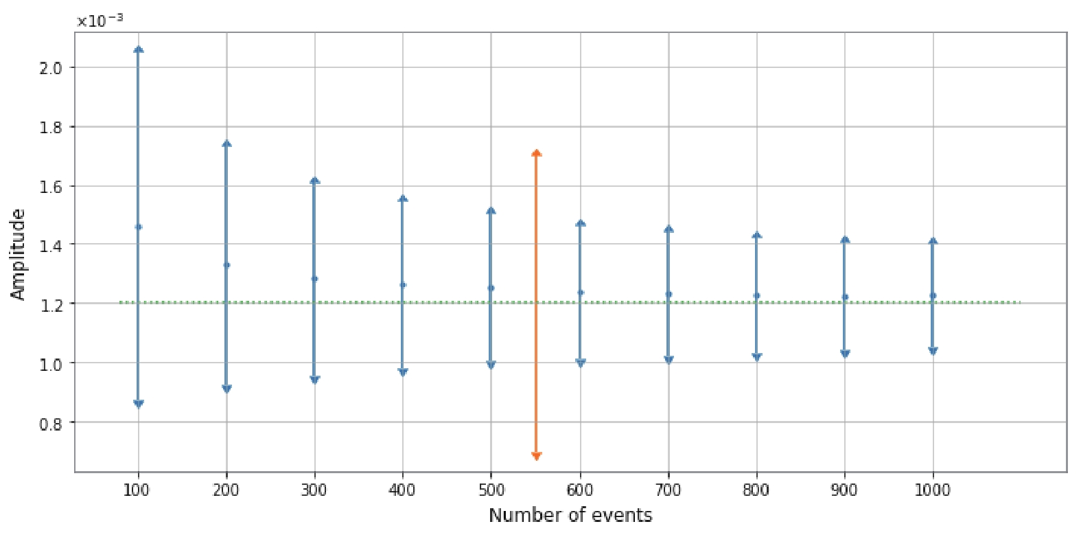 $1 \sigma$ error as a function of the number of BNS merging events observed by ET. The dashed line is the fiducial dipole amplitude. The yellow line is the dipole amplitude of Union2.1.