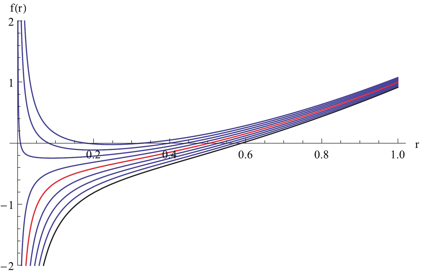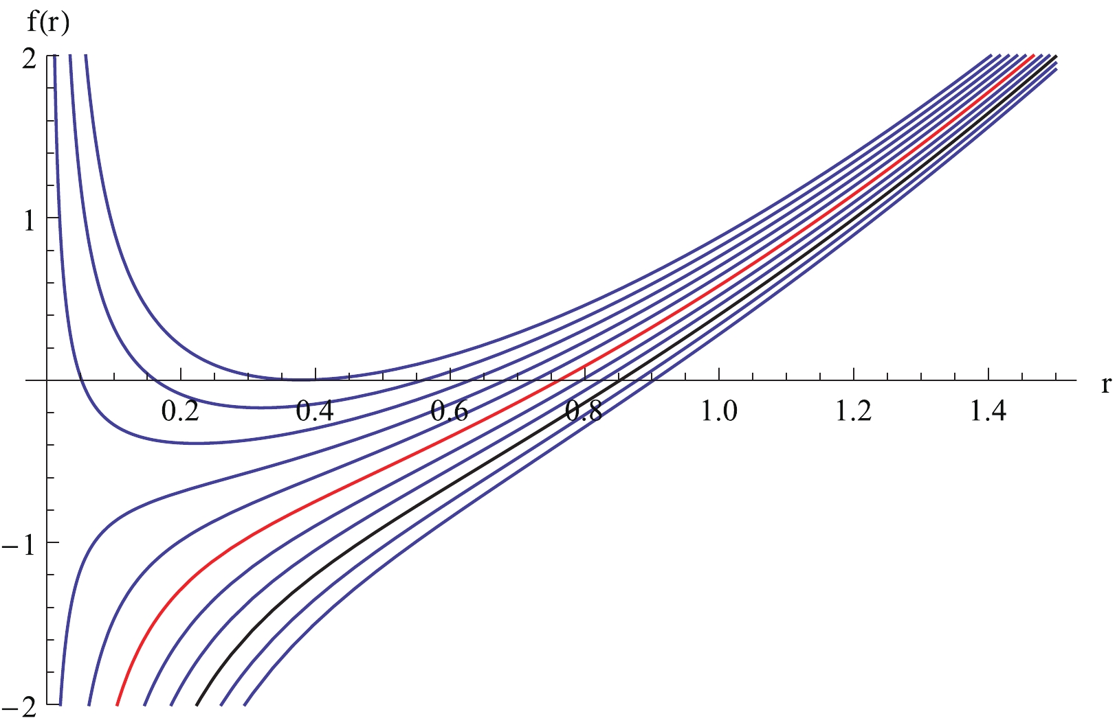 Figure 4.  (color online) Relation between $ f(r) $ and r for the case $ Q = 0.8, \;b = 0.8 $. Curves from top to bottom correspond to M varying from 0.77 to 0.85 with step 0.01.