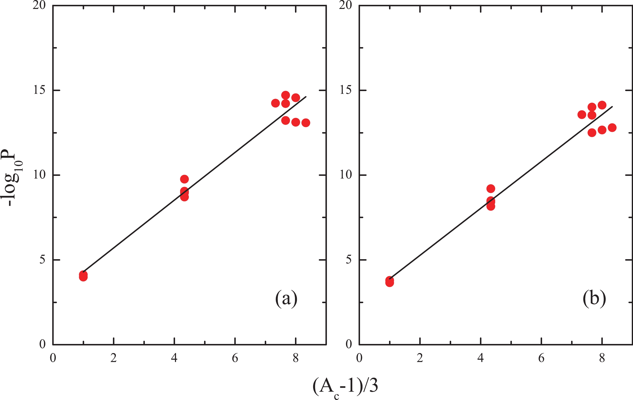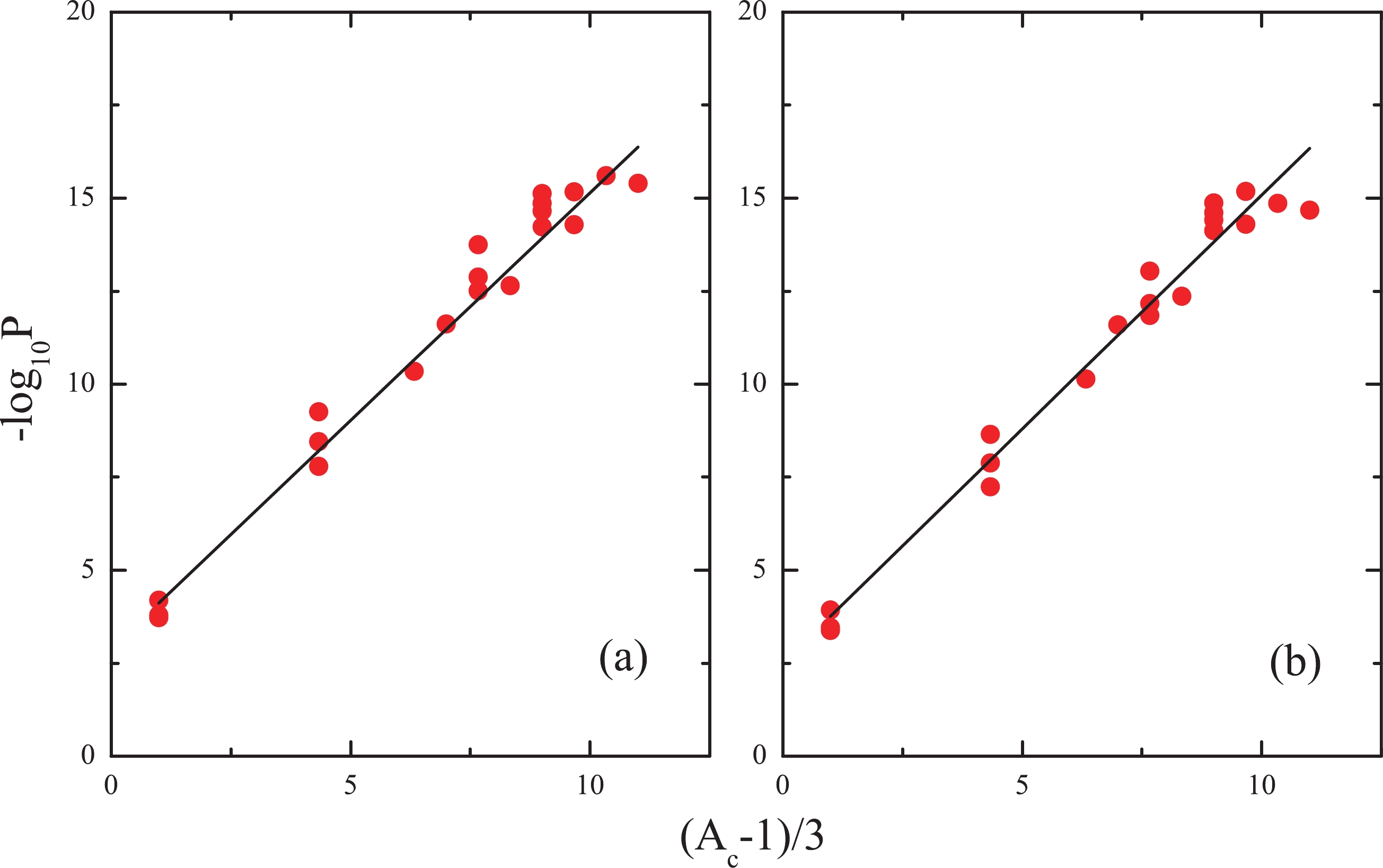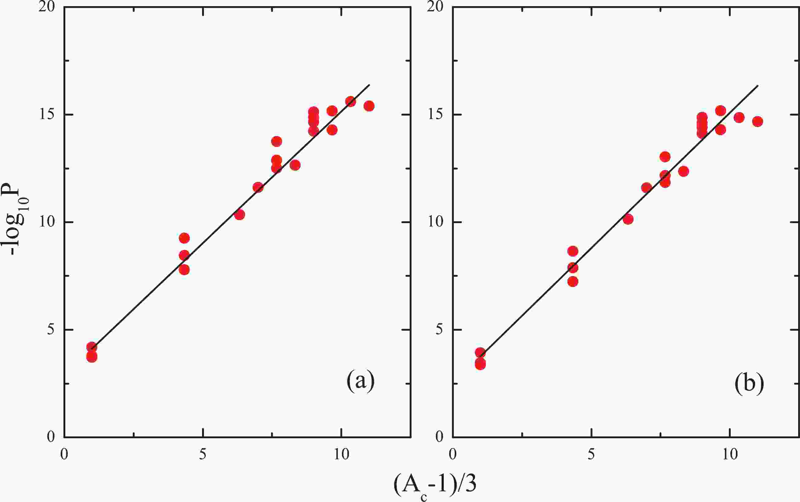 $P _{\alpha }^{(A_{c}-1)/3} $ [50], is usually adopted. Considering the model dependence, the analytic expression of P is slightly modified as$ \log _{10}P = \left( \frac{A_{c}-1}{3}\right) \log _{10}P_{\alpha }+c^{\prime }, $