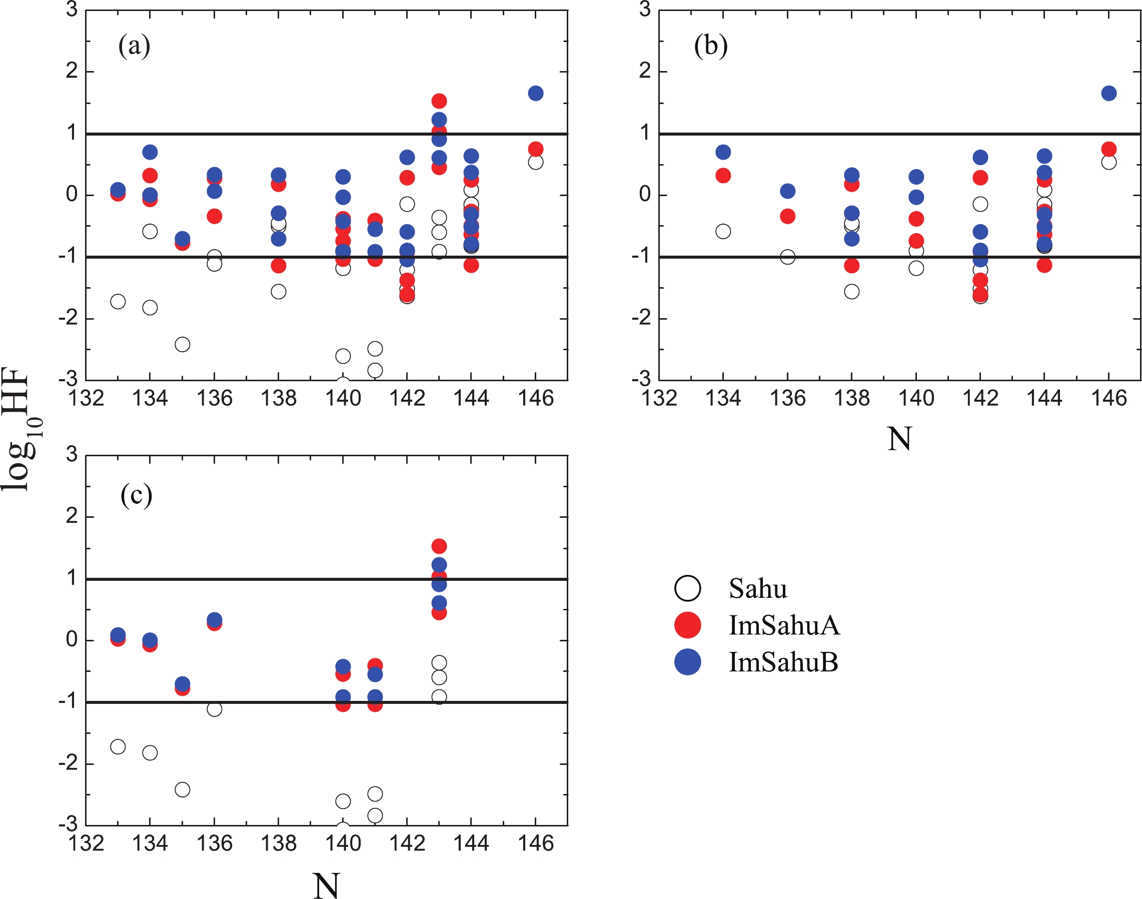 $N _{p} $ $N _{n} $ /($N _{p} $ +$N _{n} $ ). Here$N _{p} $ and$N _{n} $ represent the valence proton number and valence neutron number, respectively. The parameters are$ r_0 $ = 1.2262 fm,$ r_1 $ = 0.1473,$ r_2 $ = 1.9876, and$ r_2 $ = 0.3993. In this study, the ImSahu formula along with Eq. (14) (Eq. (15)) is named as ImSahuA (ImSahuB) relationship. -