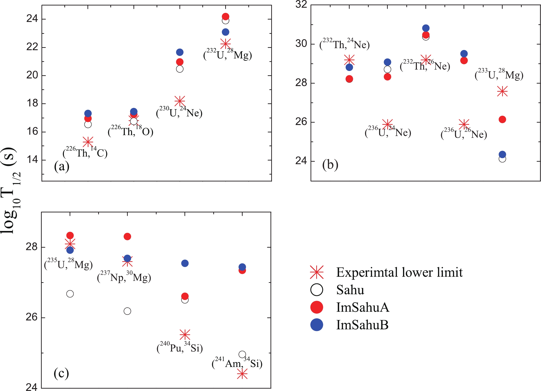 Finally, the cluster radioactivity half-lives of the trans-lead and trans-tin nuclei that are not experimentally available were predicted by the ImSahuA and ImSahuB formulas. This might be helpful for searching for new cluster emitters in the two regions in future experiments.