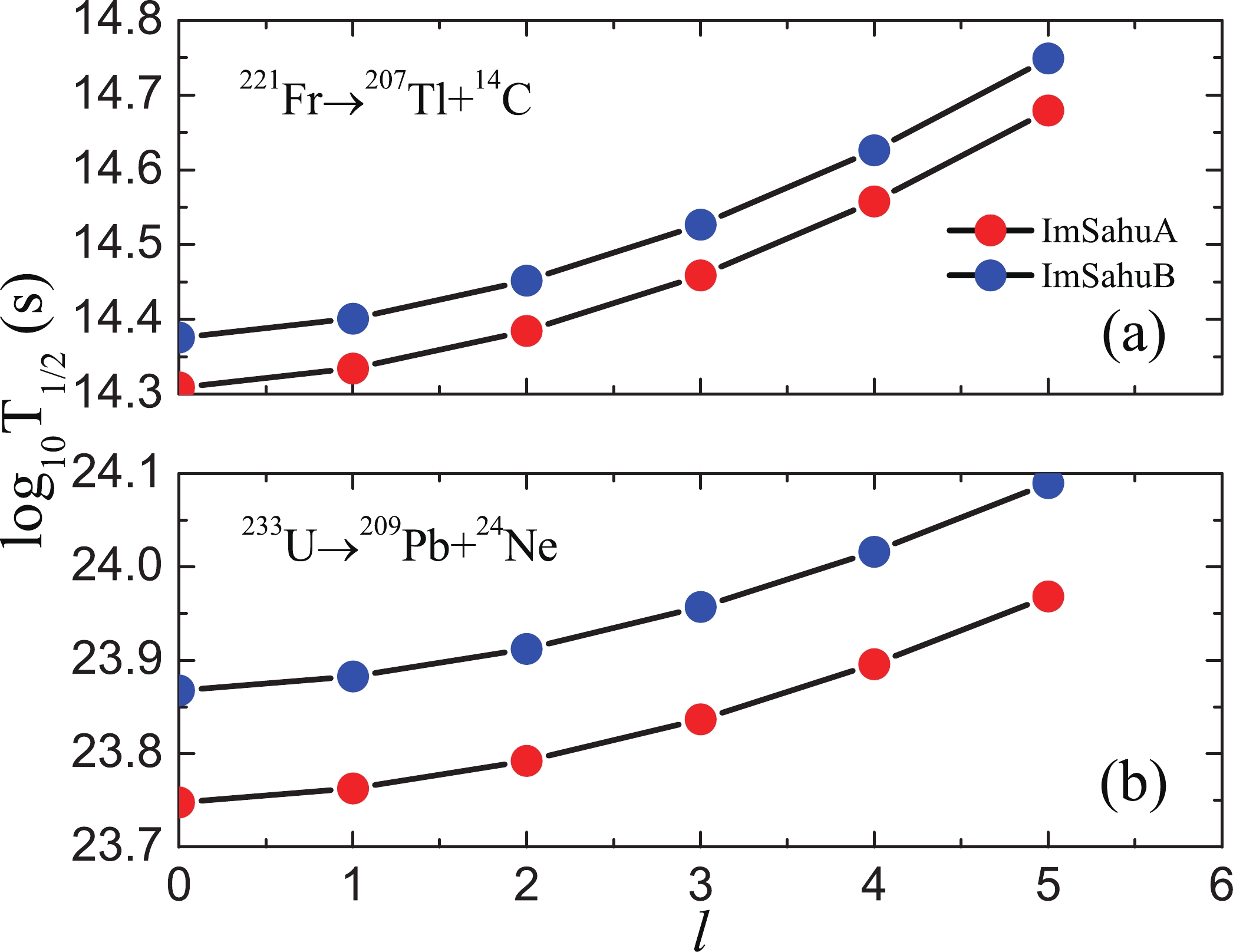 Recently, a semi-empirical relationship for charged particles and exotic cluster radioactivity was developed by Sahu et al. based on the basic phenomenon of resonances occurring in quantum scattering process under Coulomb-nuclear potential [42]. It is usually called the Sahu formula and its form is similar to the universal decay law (UDL) proposed by Qi et al. [33, 34]. Although the coefficients are obtained naturally and the angular momentum dependence is included in the Sahu formula, there exist some deviations between the calculated half-lives of the charged particles of the parent nuclei and the experimental values. For example, the calculated
