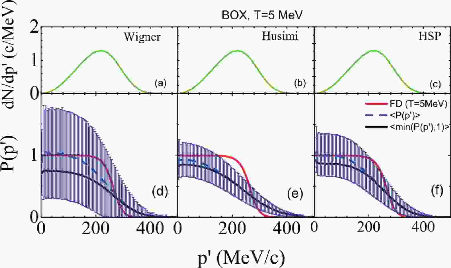 Figures 1(d), (e), and (f) show the occupation probability for the Pauli blocking algorithms of PB-Wigner, PB-Husimi, and PB-HSP, respectively. The mean values of the occupation probability, i.e.,