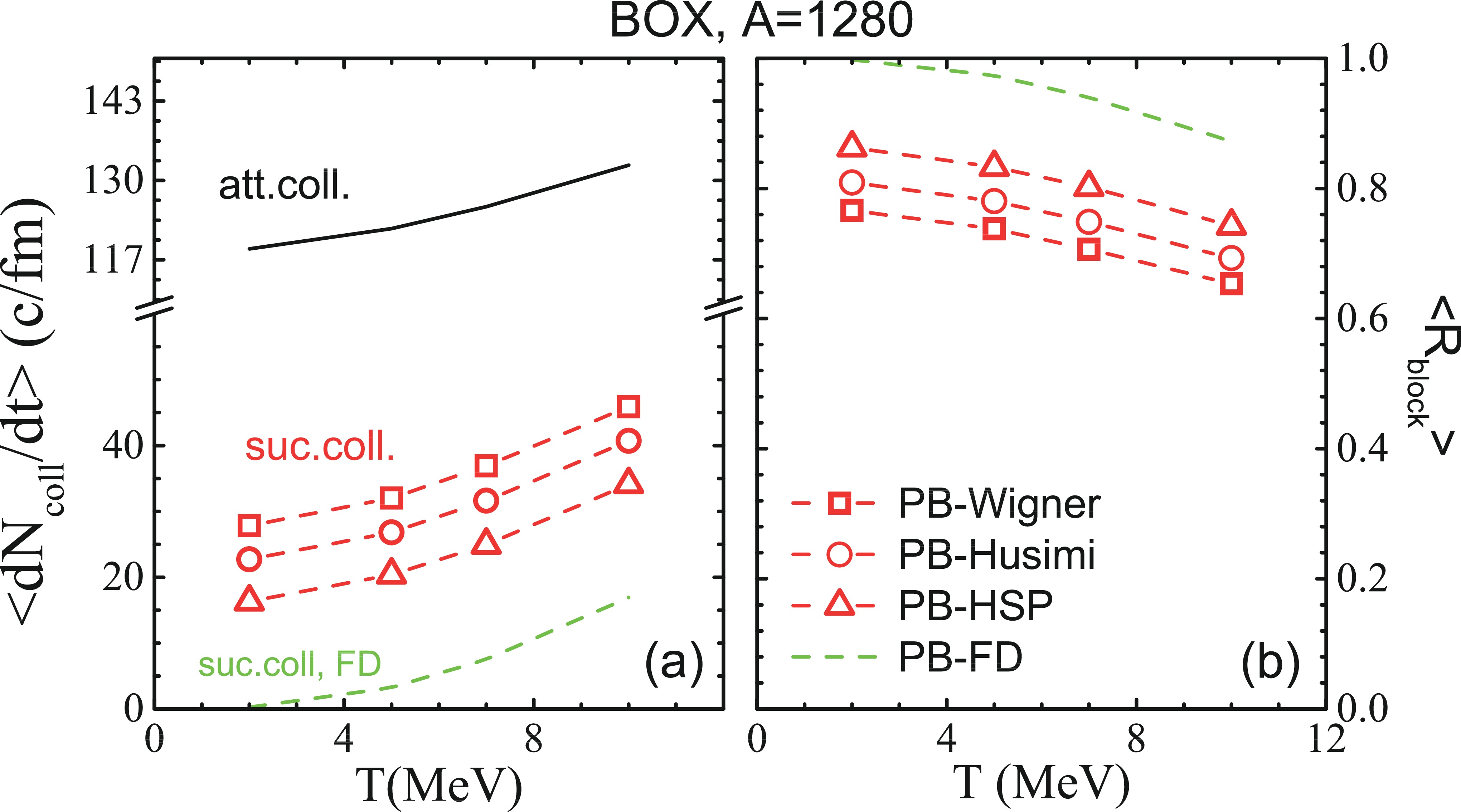 $\left\langle\dfrac{{\rm d}N^{\rm att.}_{\rm coll.}}{{\rm d}t}\right\rangle$ and successful collision rate$\left\langle\dfrac{{\rm d}N^{\rm suc.}_{\rm coll.}}{{\rm d}t}\right\rangle$ as functions of temperature. The red lines with different symbols are from different Pauli blocking algorithms. Panel (b): Averaged blocking ratio$\langle R_{\rm block}\rangle$ for different Pauli blocking (see text for more details).$ R_{\rm block} = 1-\frac{{\rm d}N^{\rm suc.}_{\rm coll.}}{{\rm d}t}\Bigg/\frac{{\rm d}N^{\rm att.}_{\rm coll.}}{{\rm d}t}. $