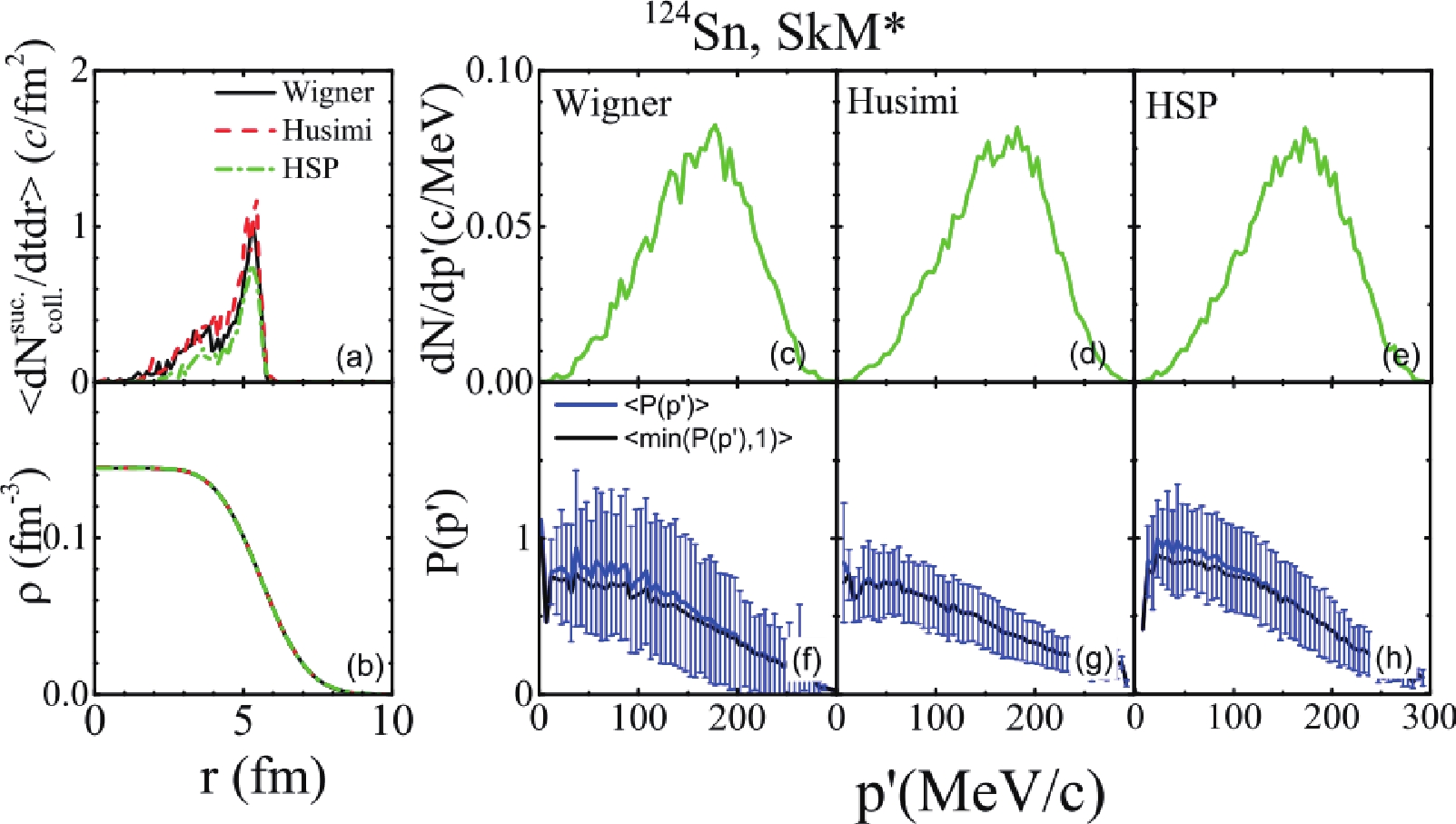 $^{124}$ Sn. Panel (b): Density distribution of$^{124}$ Sn. Panels (c), (d), and (e): Momentum distribution of scattered nucleons. Panels (f), (g), and (h): Occupation probability. They correspond to different Pauli blocking algorithms, i.e., PB-Wigner, PB-Husimi, and PB-HSP, respectively (see the text for details).In addition, most of the successful