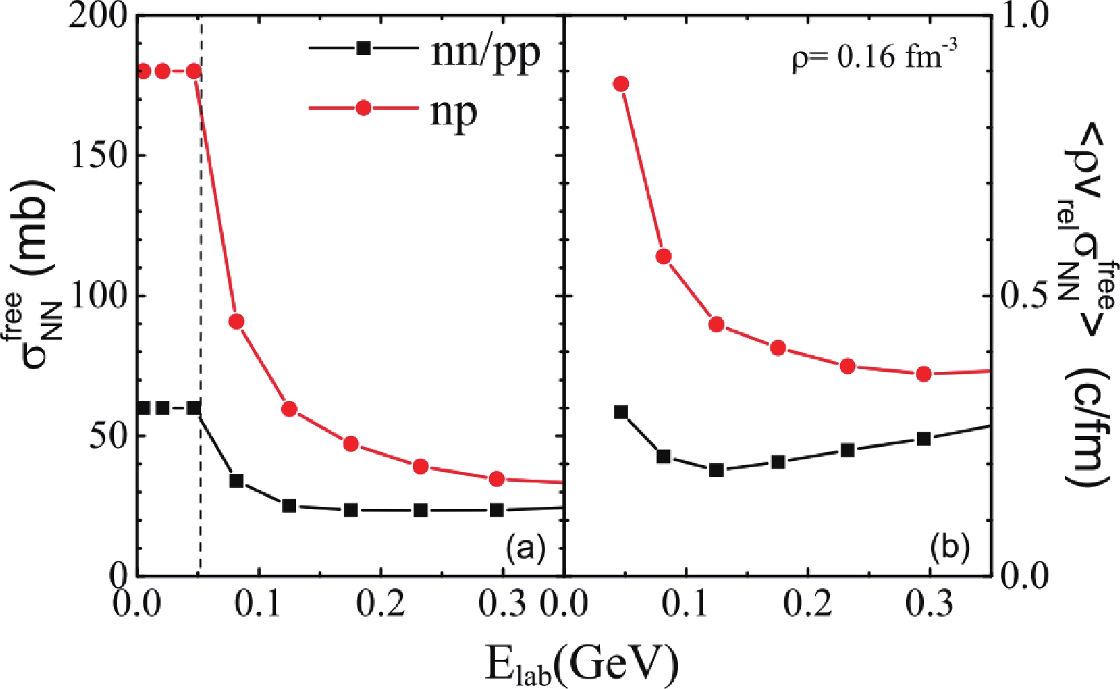 Figure 4. (color online) Panel (a): Cross section of nn/pp and np used in the ImQMD model. Panel (b): Mean attempted collision rate obtained with the free