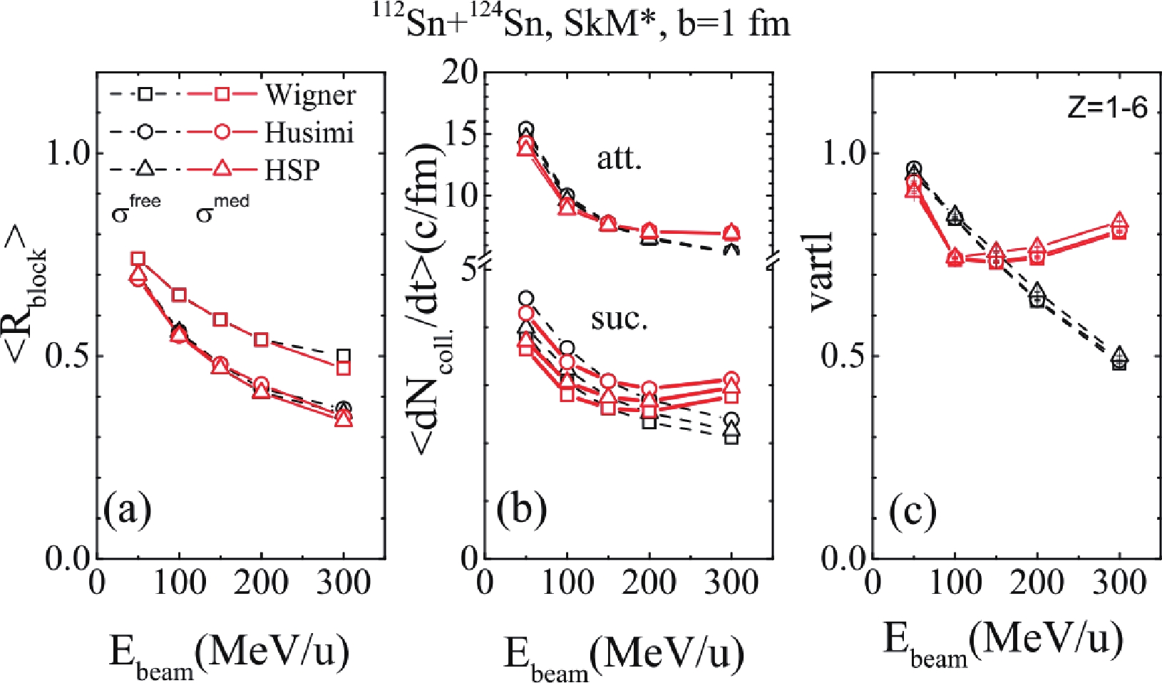 $ NN $ cross sections on stopping power, we simply take$\sigma^{\rm med}_{\rm QMD}$ as$\sigma^{\rm med}_{\rm QMD} = $ $ (1+\eta(E_{\rm beam})\rho/\rho_0)\sigma^{\rm free}$ in the code. For$E_{\rm beam}\leqslant 100$ MeV,$ \eta $ is set as -0.2. At$E_{\rm beam} = $ 150, 200, and 300 MeV,$ \eta = $ 0.0, 0.2, and 0.8, respectively. The red lines with symbols in panels (a), (b), and (c) are the results obtained with$\sigma^{\rm med}_{\rm QMD}$ . As illustrated in Fig. 5(a), the values of$\langle R_{\rm block}\rangle$ weakly depend on the correction of the in-medium$ NN $ cross sections. However, as shown in panel (b), the in-medium$ NN $ cross sections reduce the attempted and successful collision rates by$ \sim $ 7% at$E_{\rm beam}\leqslant 100$ MeV and enhance the attempted and successful collision rates by$ >7 $ % at$E_{\rm beam} > 100$ MeV. Consequently, as in panel (c), the values of$ vartl $ are suppressed at$E_{\rm beam}\leqslant 100$ MeV/u, and enhanced at$E_{\rm beam} > 100$ MeV/u.However, one should bear in mind that even the disappeared sensitivity is found among the results obtained with the three PB methods in HIC simulations, the improvements to the PB method are still necessary. The reasons are as follows: 1) all PB methods underestimate the Pauli blocking ratio by approximately 13%-25% in nuclear matter calculations, in which analytical values are used to evaluate the accuracy of the PB method. For a finite nucleus at T=0 MeV, the successful collision rates are not blocked to zero. This means that the three PB methods are not good enough. 2) For the Pauli blocking ratios in HICs, we need to know the analytical values of Pauli blocking. Currently, we do not know the analytical values, and thus do not know how much they deviate from the true values and whether the deviations are too large to neglect. A reliable extraction of the in-medium