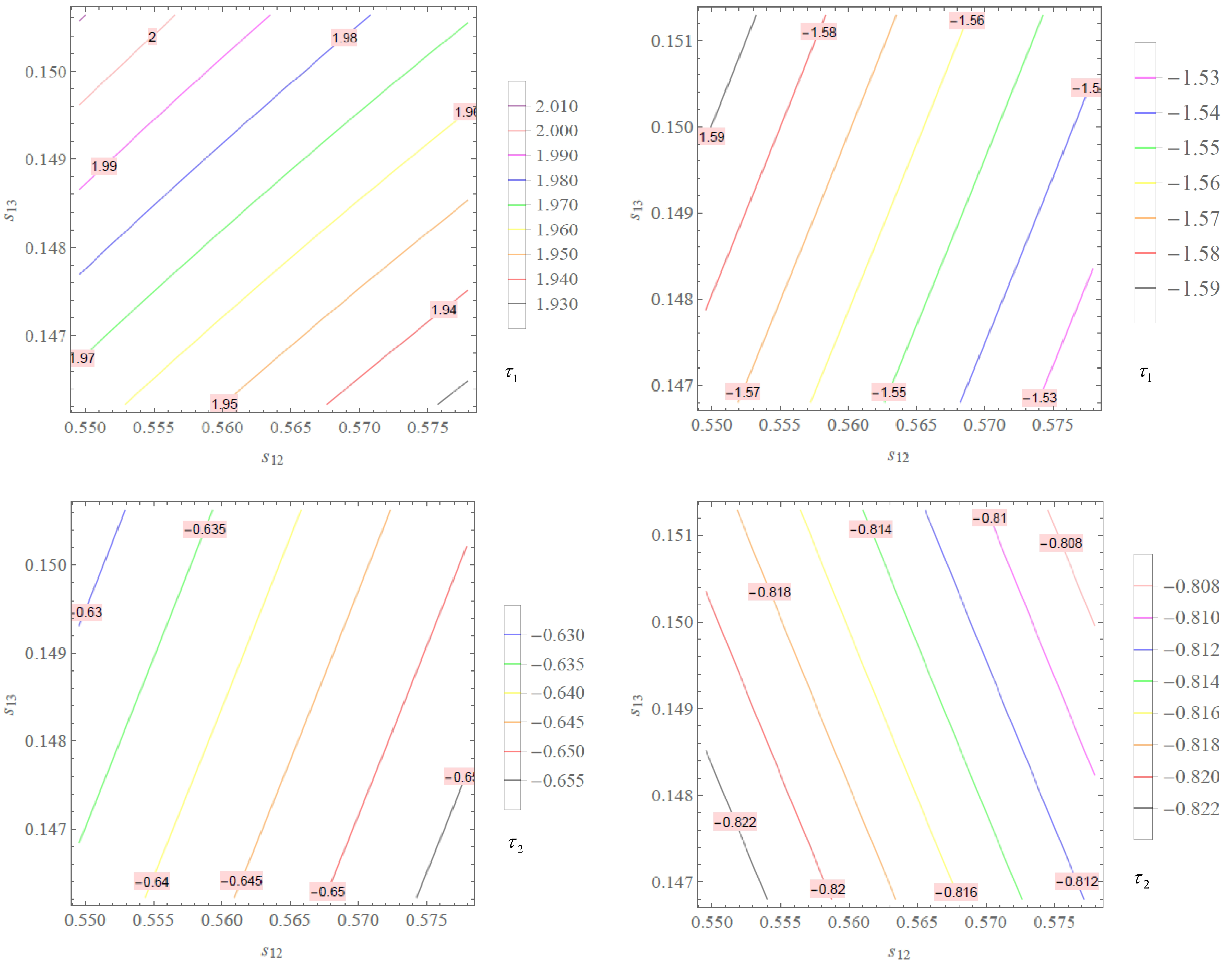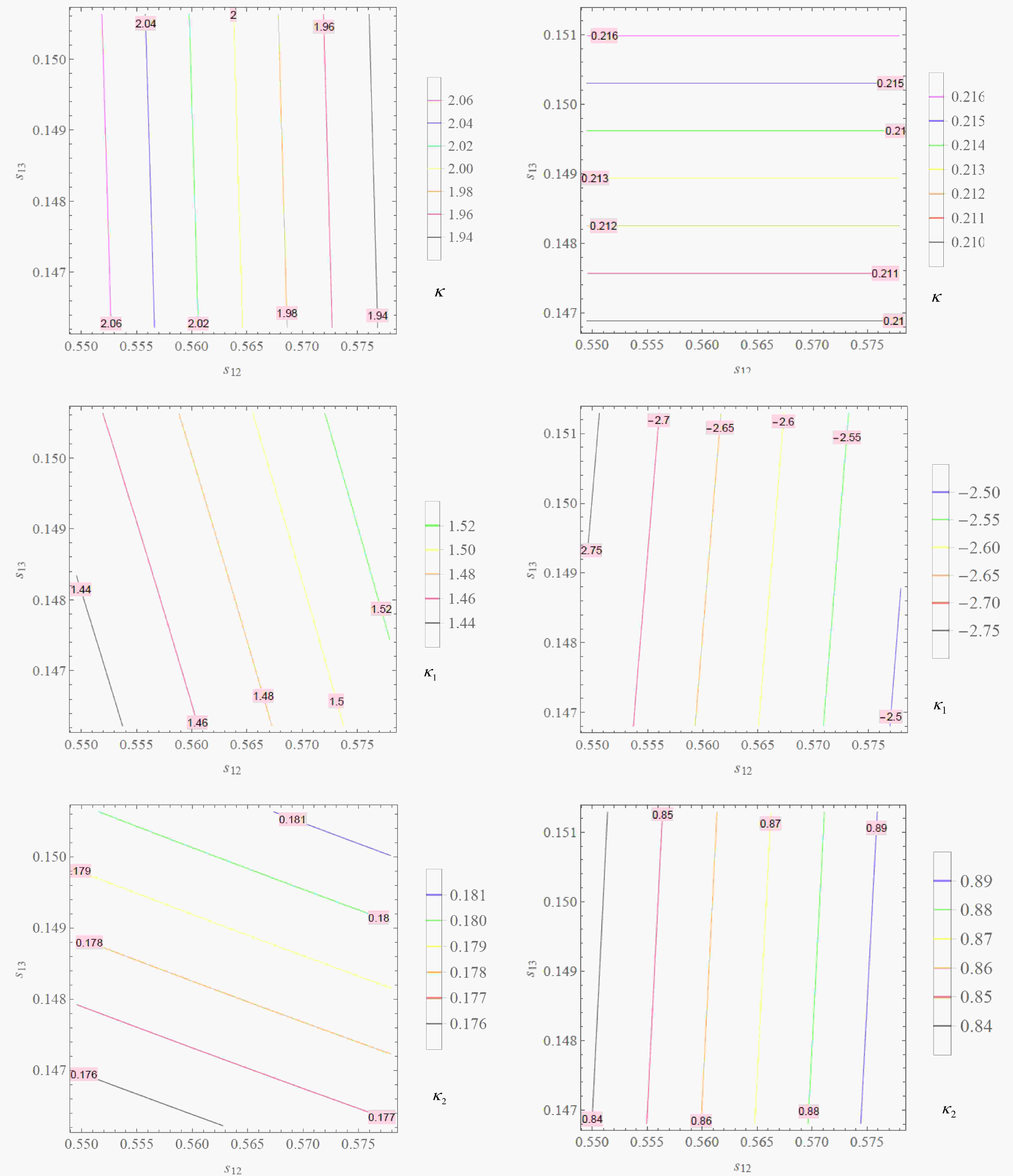 $ \begin{aligned}[b] &\kappa_2 \in \left\{ \begin{array}{l} (0.176, 0.181) \; \;{\rm{for}}\;{\rm{NH}}, \\ (0.84, 0.89) \;\;{\rm{for}}\;{\rm{IH}}, \end{array} \right. \\ &\tau_1 \in \left\{ \begin{array}{l} (1.93, 2.01) \; \;{\rm{for}}\;{\rm{NH}}, \\ (-1.59, -1.53) \; \;{\rm{for}}\;{\rm{IH}}, \end{array} \right. \,\, \\&\tau_2 \in \left\{ \begin{array}{l} (-0.655, -0.630) \; \;{\rm{for}}\;{\rm{NH}}, \\ (-0.822, -0.808) \; \;{\rm{for}}\;{\rm{IH}}. \end{array} \right. \end{aligned} $
