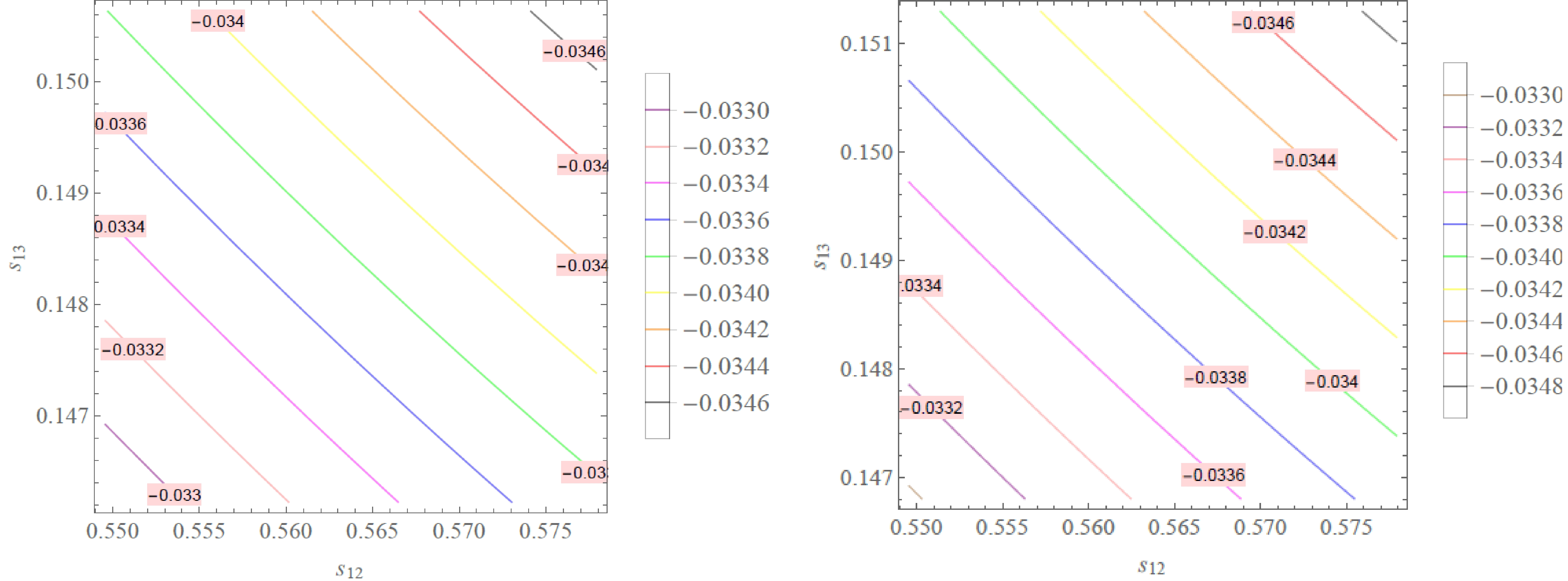 Figure 3.  (color online) $ J_{\mathrm{\rm CP}} $ as a function of $ s_{12} $ and $ s_{13} $ with $ s_{12}\in (0.550, 0.578) $ and $ s_{13}\in (0.146, 0.151) $ for NH (left panel) and $ s_{13}\in (0.147, 0.151) $ for IH (right panel).