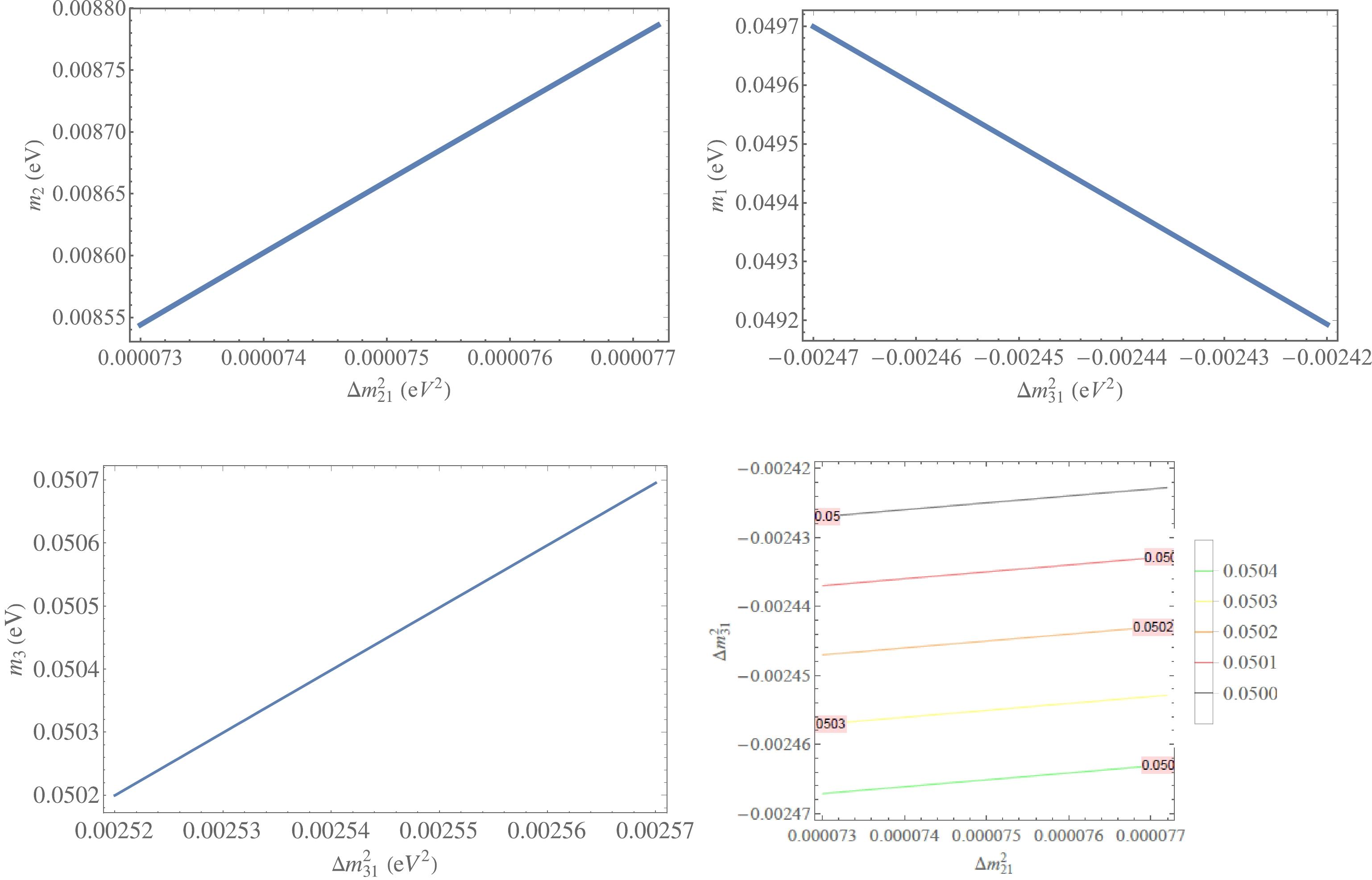 Figure 5.  (color online) $ m_{2}\, (m_3) $ as a function of $ \Delta m^2_{21} \, (\Delta m^2_{31}) $ for NH (left panel) and $ m_1 $ as a function of $ \Delta m^2_{31} $ and $ m_{2} $ as a function of $ \Delta m^2_{21} $ and $ \Delta m^2_{31} $ for IH (right panel) with $ \Delta m^2_{21}\in (7.30, 7.72)\times 10^{-5} \,\mathrm{eV}^2 $ and $ \Delta m^2_{31}\in (2.52, 2.57)\times 10^{-3} \,\mathrm{eV}^2 $ for NH and $ \Delta m^2_{31}\in (-2.47, -2.42)\times 10^{-3} \,\mathrm{eV}^2 $ for IH.