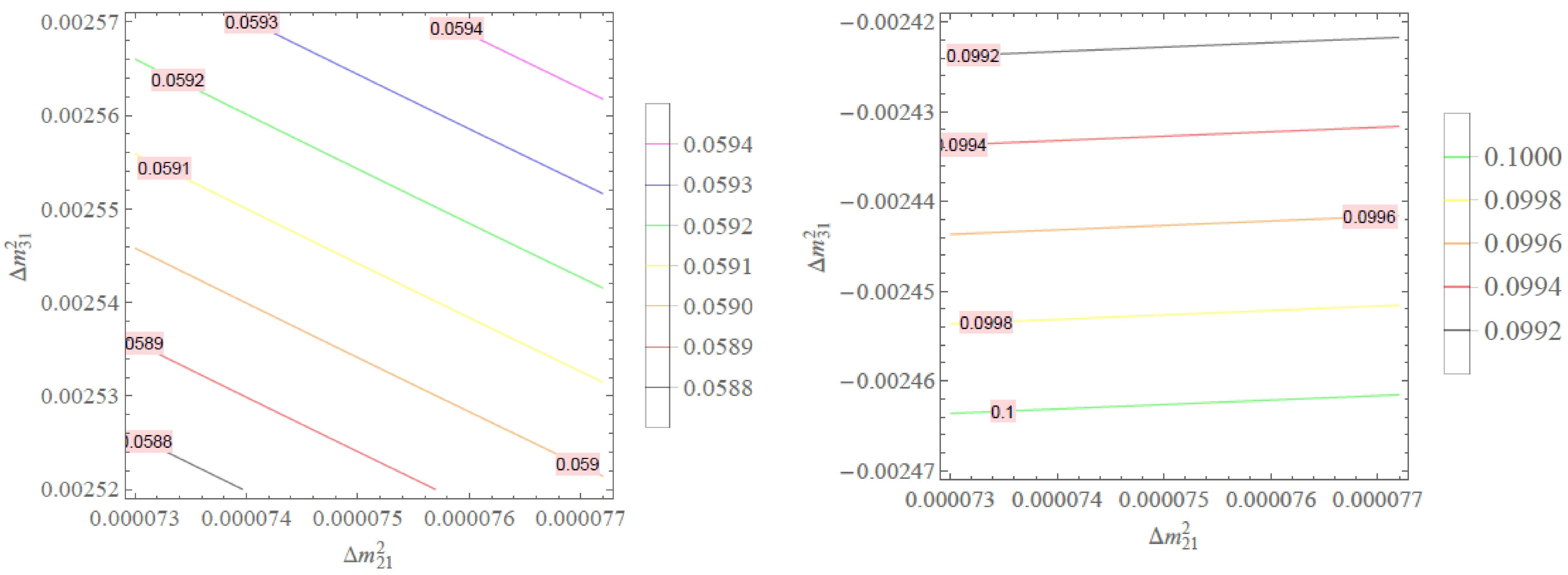 Figure 6.  (color online) $ \sum\nolimits_\nu m_{\nu} $ as a function of $ \Delta m^2_{21} $ and $ \Delta m^2_{31} $ with $ \Delta m^2_{21}\in (7.30, 7.72)\times 10^{-5} \,\mathrm{eV}^2 $ and $ \Delta m^2_{31}\in (2.52, 2.57)\times 10^{-3} \,\mathrm{eV}^2 $ for NH (left panel) and $ \Delta m^2_{31}\in (-2.47, -2.42)\times 10^{-3} \,\mathrm{eV}^2 $ for IH (right panel).