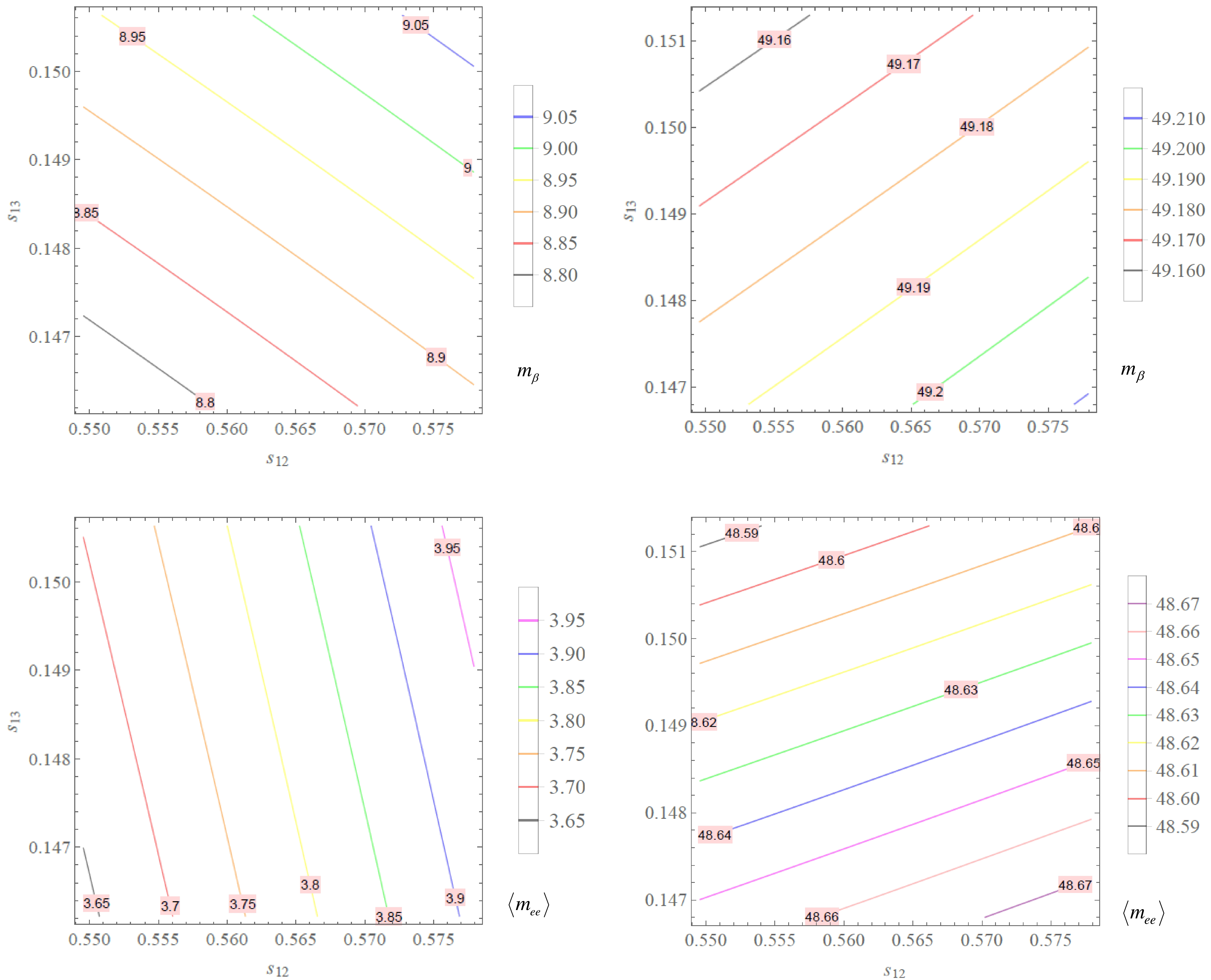 Expressions (33) and (34) imply that $ m_{\beta } $ and $ \langle m_{ee}\rangle $ depend on four experimental parameters $ \Delta m_{21}^2, \Delta m_{31}^2, s_{12} $, and $ s_{13} $. At the best-fit points of the two neutrino mass-squared differences, two neutrino effective masses $ \langle m_{ee}\rangle $ and $ m_{\beta} $ depend on two parameters $ s_{12} $ and $ s_{13} $, which is plotted in Fig. 7 with $ s_{12}\in (0.550, 0.578) $ and $ s_{13}\in (0.146, 0.151) $ for NH and $ s_{13}\in $ (0.147, 0.151) for IH. This shows that our model predicts the range of the effective neutrino mass parameters as follows: