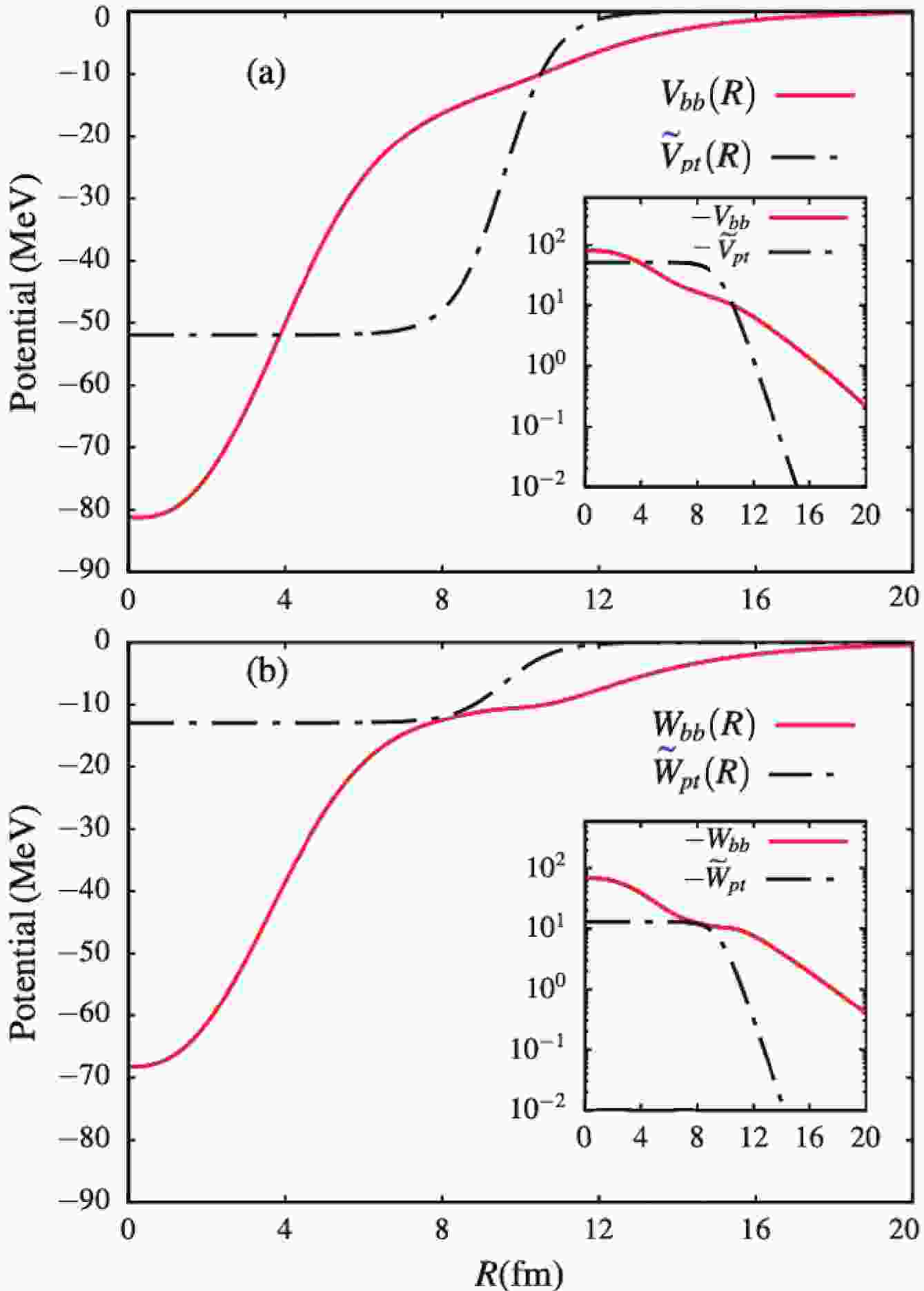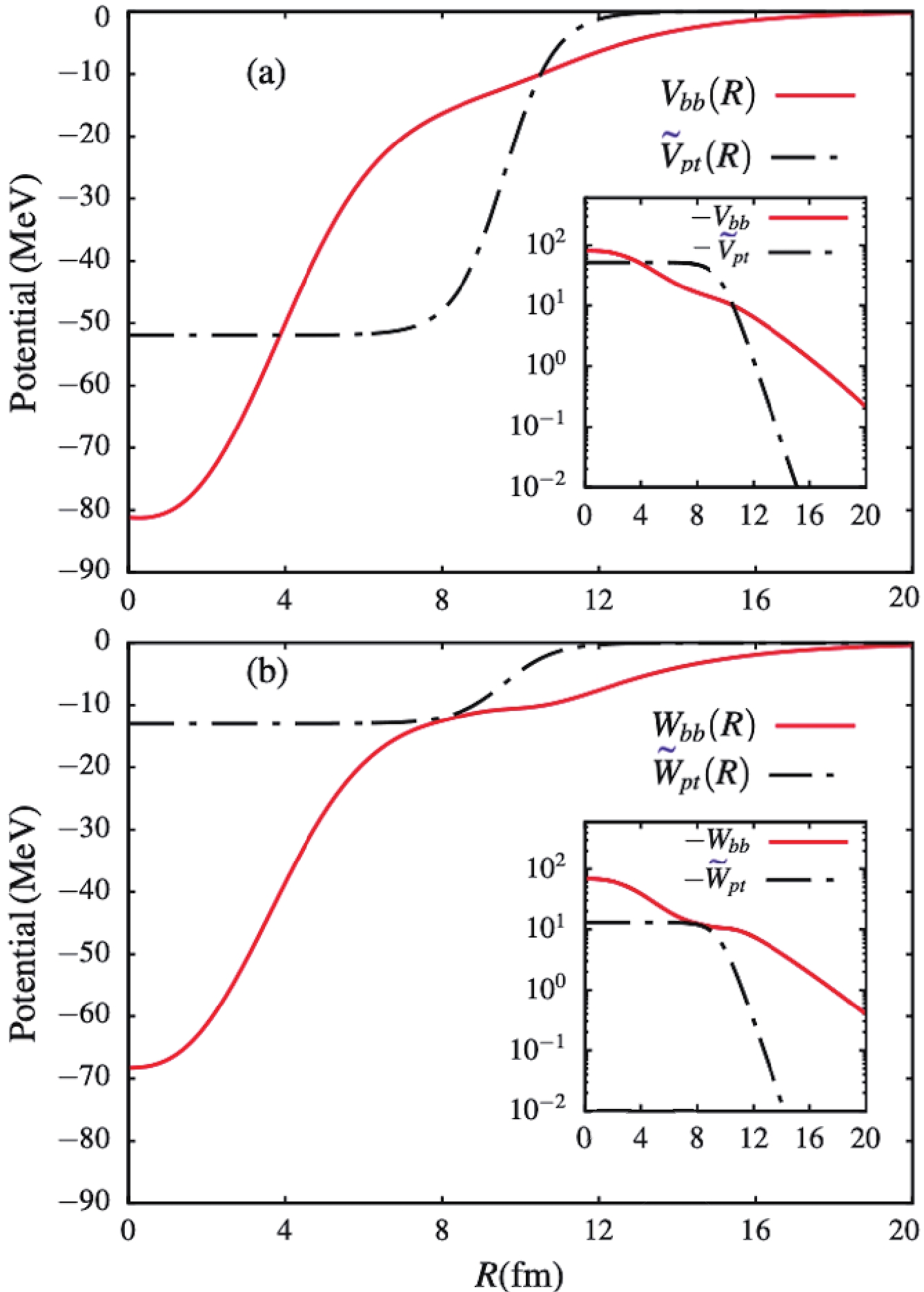 $ U_{\beta\beta}^{LJ}(R) $ , in Eq. (1), contain the elastic scattering matrix elements,$ {U}^{LJ}_{bb}(R) $ , and the diagonal continuum–continuum elements,$ U^{LJ}_{\alpha\alpha}(R) $ [$ U_{\beta\beta}^{LJ}(R) = {U}^{LJ}_{bb}(R)+U^{LJ}_{\alpha\alpha}(R) $ ]. The nuclear potential in the elastic scattering channel (which is added to the monopole Coulomb potential$ Z_pZ_te^2/R $ ) is obtained using two approaches:$ {\bf{(i)}} $ In the first approach, the real and imaginary parts of the projectile–target potential,$ U^{(N)}_{bb}(R)\equiv V_{bb}(R)+ $ $ {\rm{i}} W_{bb}(R) $ , are obtained by folding the interactions between the fragments and the target, with the square of the ground-state projectile wave function,$ |\phi_{b}({\boldsymbol{r}})|^2 $ , such that$ V_{bb}(R) $ and$ W_{bb}(R) $ are given by$ \left[\begin{array}{c}V_{bb}(R)\\W_{bb}(R) \end{array}\right] = \int {\rm d}^3 {\boldsymbol{r}}|\phi_{b}({\boldsymbol{r}})|^2 \left[\begin{array}{c} V_{ct}({\boldsymbol{R}}_{ct})+V_{nt}({\boldsymbol{R}}_{nt})\\ W_{ct}({\boldsymbol{R}}_{ct})+W_{nt}({\boldsymbol{R}}_{nt}) \end{array}\right], $