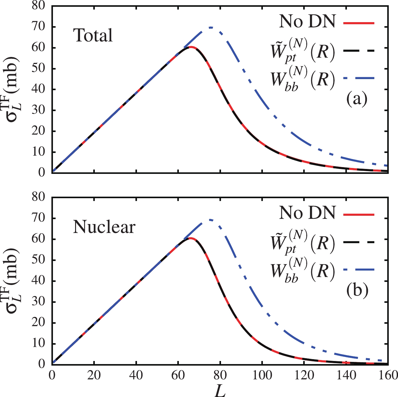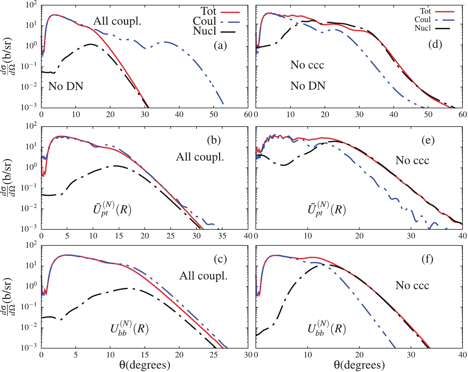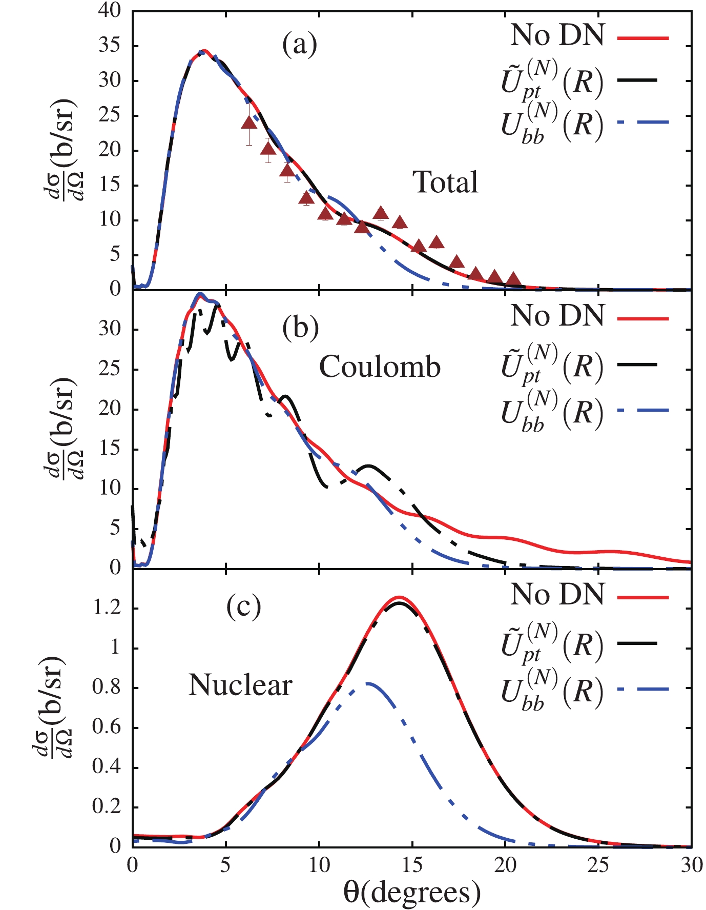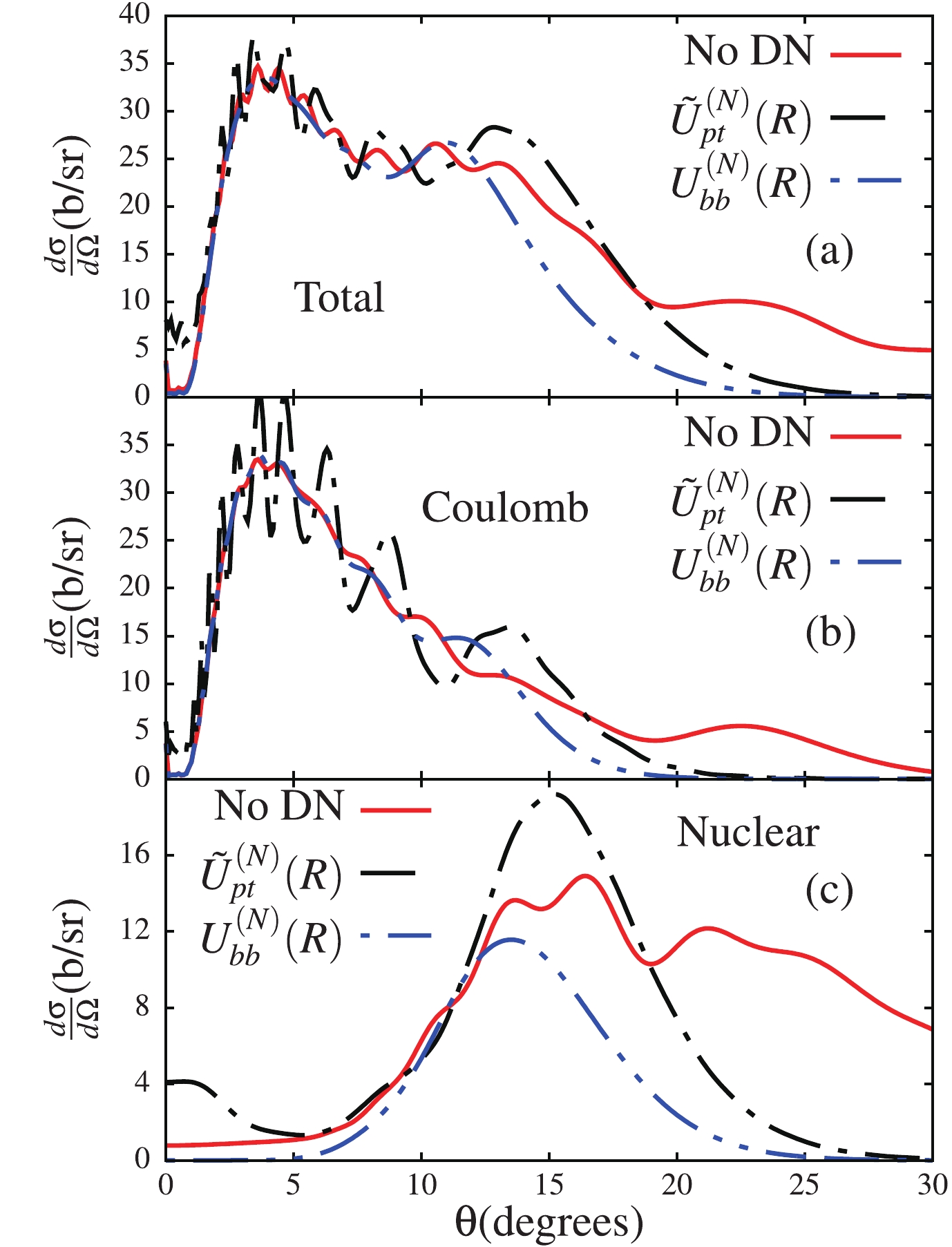 $\widetilde{U}^{(N)}_{pt}$ and$U_{bb}^{(N)}$ in the elastic scattering channel, and for the case labeled “No DN”, when there is no nuclear potential in the elastic scattering channel (meaning that$\widetilde{U}^{(N)}_{pt}=U_{bb}^{(N)}=0$ ). All the different couplings, including continuum–continuum couplings are taken into account. The experimental data in panel (a) were taken from Ref. [23].With regard to the relevance of the potentials