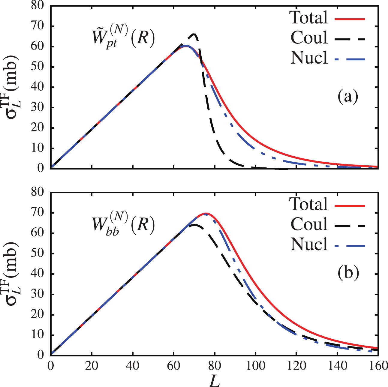 $ \widetilde{U}^{(N)}_{pt} $ and$ U^{(N)}_{bb} $ on the fusion cross-section, we analyze the total fusion cross-sections corresponding to the total, Coulomb and nuclear breakups. We should note that, in the Coulomb breakup, the fusion process is exclusively stimulated by the imaginary potential in the elastic scattering channel, namely$ \widetilde{W}^{(N)}_{pt} $ and$ W^{(N)}_{bb} $ . Since in this case$ \small{ {W_{\beta\beta^{\prime}}^{LL^{\prime}J}(R) = \langle{\cal{Y}}_{\beta}^{LJ} ({\boldsymbol{r}},\Omega_{\boldsymbol{R}})| W_{ct}+ W_{nt}| {\cal{Y}}_{\beta^{\prime}}^{L^{\prime}J}({\boldsymbol{r}}, \Omega_{\boldsymbol{R}})\rangle} = 0 } $ , the resulting fusion cross-section will have no dependence on the breakup channels. The partial L-distribution total fusion cross-sections are shown in Fig. 5. By looking at panel (a) for the$ \widetilde{W}^{(N)}_{pt} $ potential, one sees all three fusion cross-sections are similar at$ L\leqslant 60 $ with peaks at$ L\sim 60 - 70 $ . In the Coulomb breakup case, where$ W_{ct} = W_{nt} = 0 $ , the fusion cross-section rapidly drops to zero whereas fusion cross-sections corresponding to the total and nuclear breakups are extended to larger L. This extension certainly comes from the contribution of the off-diagonal$ W_{ct} $ and$ W_{nt} $ . This is confirmed in panel (b), where the fusion cross-section stimulated by$ W_{ct} $ and$ W_{nt} $ in the Coulomb breakup is now extended to larger values of L. To better understand these results, it could be interesting to consider incident energy below and around the Coulomb barrier. The results in panel (b) contain the effect of the long tail of the projectile ground-state wave function, which contributes to the fusion cross-section apart from the imaginary parts of the nuclear potentials. This effect is better identified in Fig. 6, where the fusion cross-section due to$ W_{bb}^{(N)} $ potential is larger at large angular momenta. One should be mindful of this in an actual analysis of fusion cross-sections (for more discussion, see Ref. [41]). -