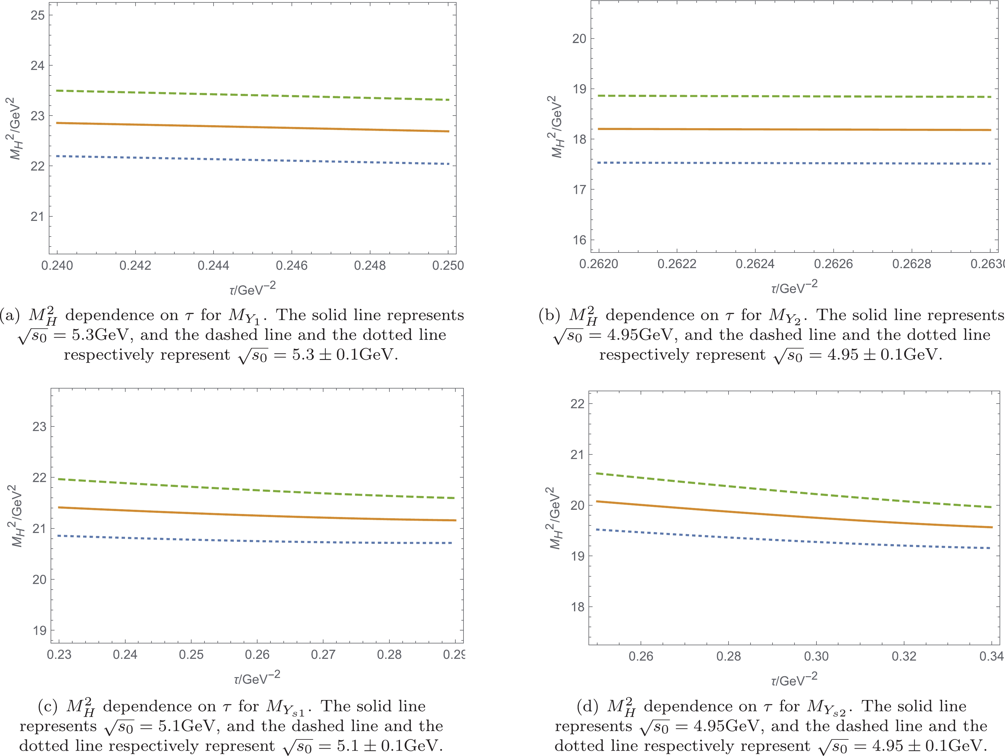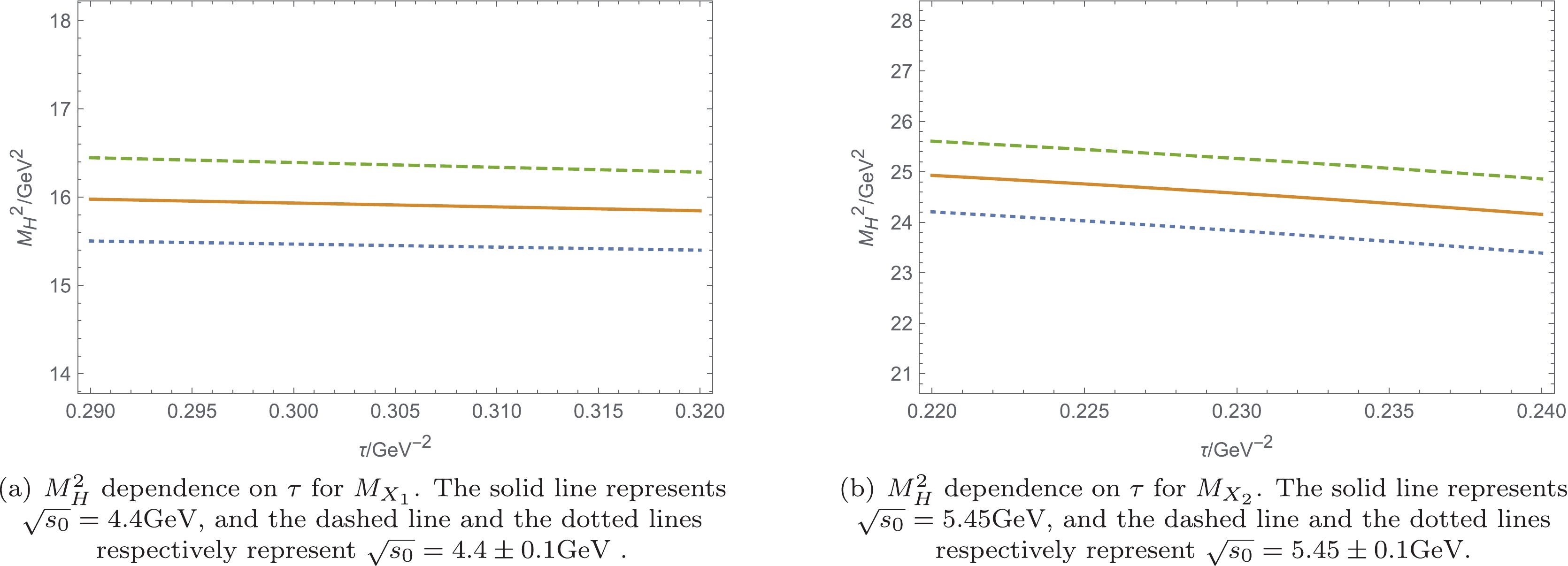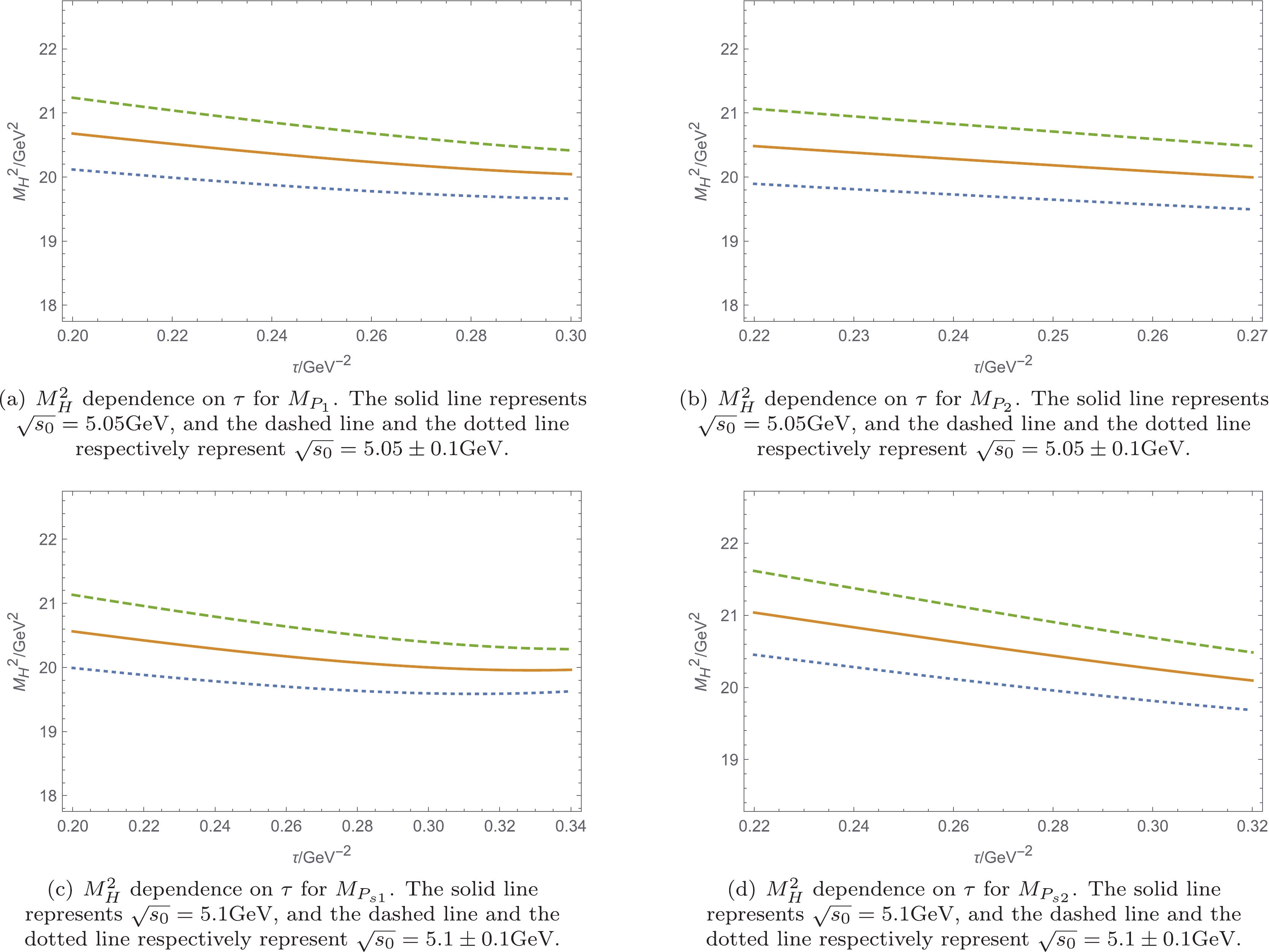 $ s_0 $ is also very important in QCDSR methods. It is often assumed that the threshold satisfies$ \sqrt{s_0} = M_H+\Delta_s $ , with$ \Delta_s\approx 0.5$ GeV. This is especially the case in molecular state QCDSR calculations [36, 37].The approximation