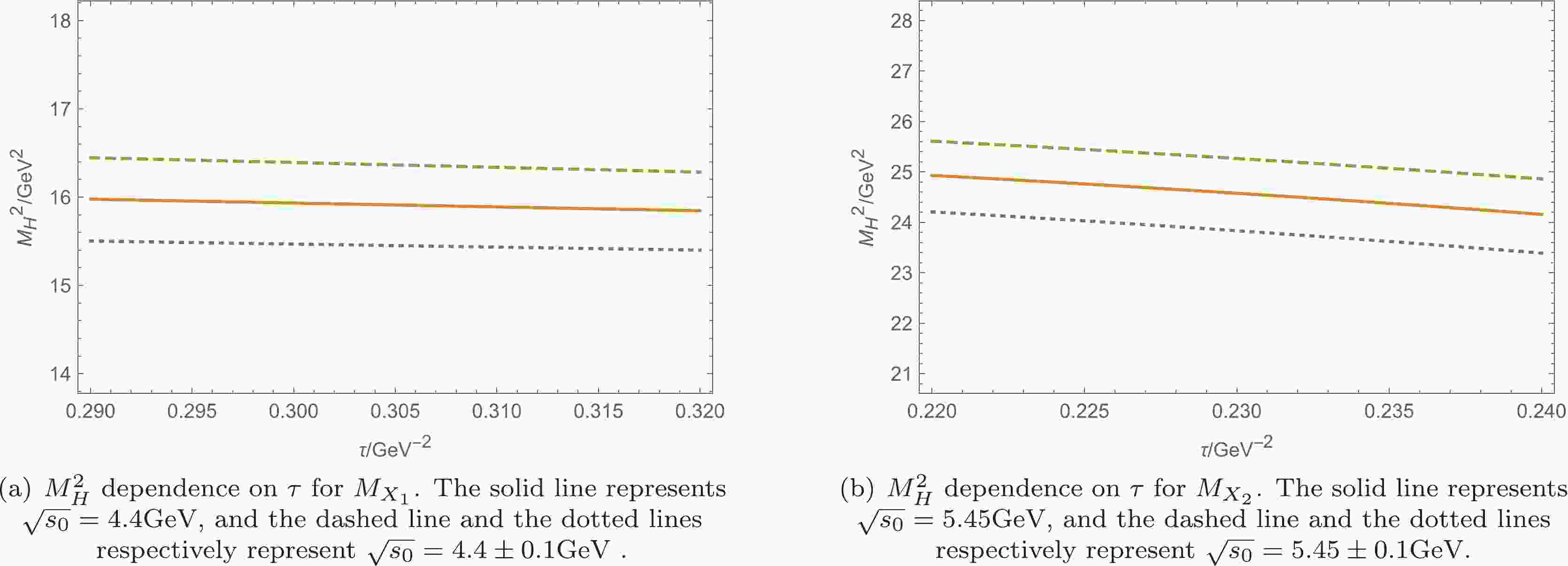 $ \tau = 1/M^2 $ , and M is the Borel mass. The master equation (10) is the foundation of our analysis. By taking the τ logarithmic derivative of Eq. (10), we obtain$ M_H^2 = \frac{\int_{s_{ \rm{min}}}^{\infty}{\rm d}s \ s \rho_H^{ \rm{(OPE)}} \left ( s \right ){\rm e}^{-s\tau}}{\int_{s_{ \rm{min}}}^{\infty}{\rm d}s \ \rho_H^{ \rm{(OPE)}} \left ( s \right ){\rm e}^{-s\tau}}. $
