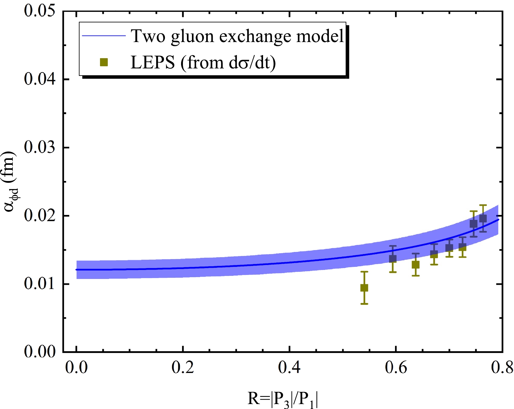 $ |\alpha_{\phi p} |\simeq2.37 $ was obtained by analyzing the QCD van der Waals potential [13], and in 2021, the real part of the scattering length of ϕ-p was found to be$ 0.85\pm0.34 $ fm via a$ pp $ collision by the ALICE Collaboration [16]. Note that these results go beyond the scattering length of the ϕ-p extracted from vector meson photoproduction data. Moreover, the scattering length of ϕ-p obtained by the VMD model was extracted from single data of vector meson photoproduction [1, 3, 4, 13]. Considering that the extraction of the ϕ-p scattering length from a single experimental data point may have an uncertainty, it is necessary to provide the distribution of the ϕ-p scattering length with energy at the threshold. Therefore, in this study, the two gluon exchange model [12] and pomeron model [17, 18] are established to predict the cross section of ϕ photoproduction. With the VMD model, the scattering length$ |\alpha_{\phi p}| $ is related to the photoproduction cross section and expressed as a function of R. Combined with the$ |\alpha_{\phi p}| $ extracted directly from the experimental data [2, 19, 20], the value of$ |\alpha_{\phi p}| $ at the near threshold R can be obtained. Here, R is the ratio of the final momentum$ |{\bf p}_3| $ to the initial momentum$ |{\bf p}_1| $ , which is directly proportional to the center of mass energy W.At present, research on the scattering length of vector mesons interacting with deuteron or helium nuclei composed of multiple nucleons is still limited. Considering the validity of the VMD model in describing the photoproduction process of vector meson and nucleus coherence [21–25], this study analyzes and calculates the scattering length of ϕ-deuteron (d). Fortunately, in 2007, the SLEP Collaboration [3] newly measured coherent ϕ photoproduction from deuterons at E=