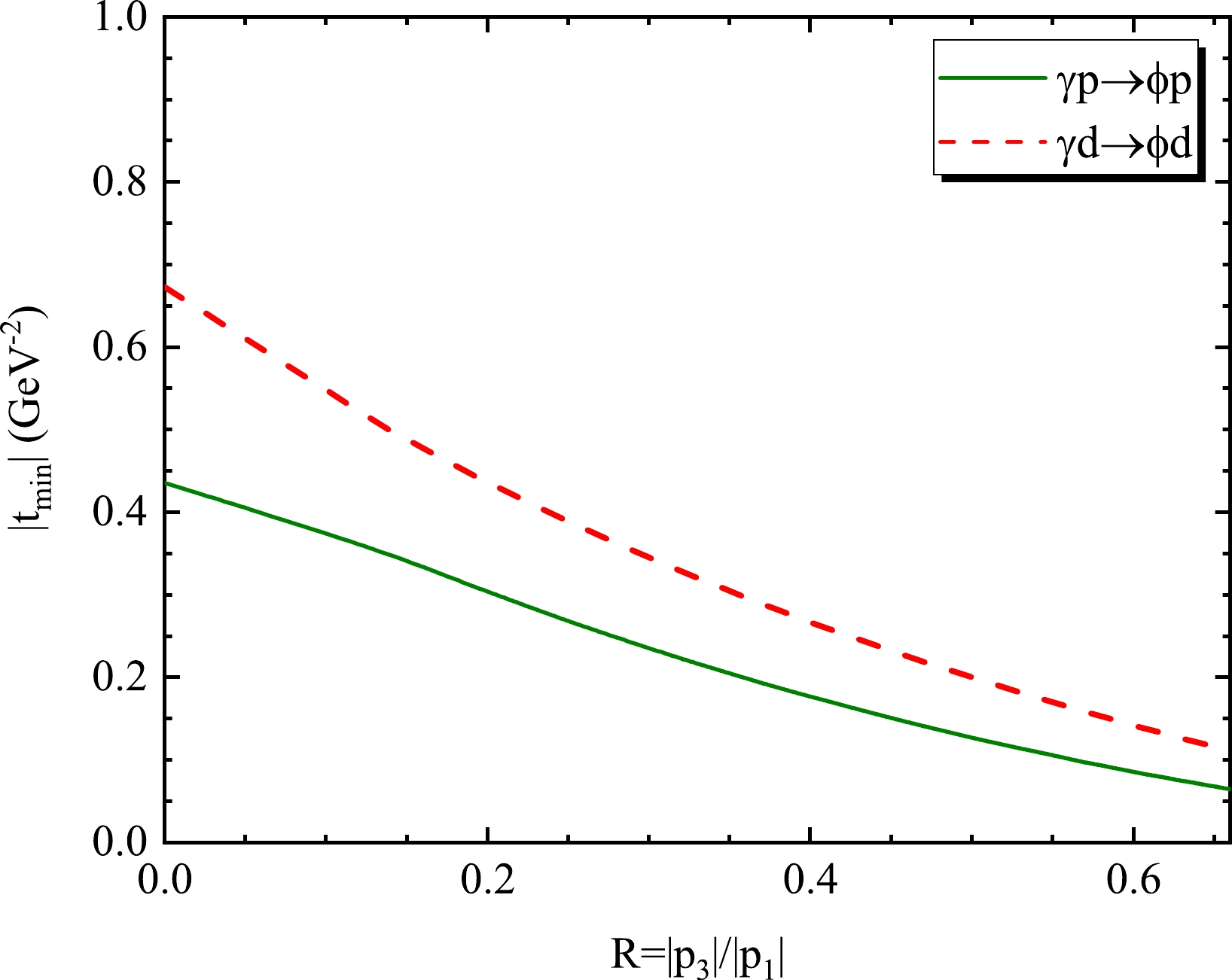 $ |\alpha_{\phi d}| $ is relatively smaller than$ |\alpha_{\phi p}| $ As shown in Figs. 4 and 10, the differential cross sections of ϕ-d and ϕ-p photoproduction belong to the same order of magnitude, and there is a slight distinction between them. However, the influence of$|t_{\rm min}|$ on the differential cross section is enormous owing to the diverse nucleons or nuclei interacting with ϕ. Figure 12 comprehensively demonstrates this difference.$|t_{\rm min}|$ of ϕ-d is larger than that of ϕ-p at$ R\in[0,0.66] $ . Furthermore, consider the slope of the differential cross section of ϕ-d to be steeper. Therefore,$ |\alpha_{\phi d}| $ $ < $ $ |\alpha_{\phi p}| $ is adequately explained. -