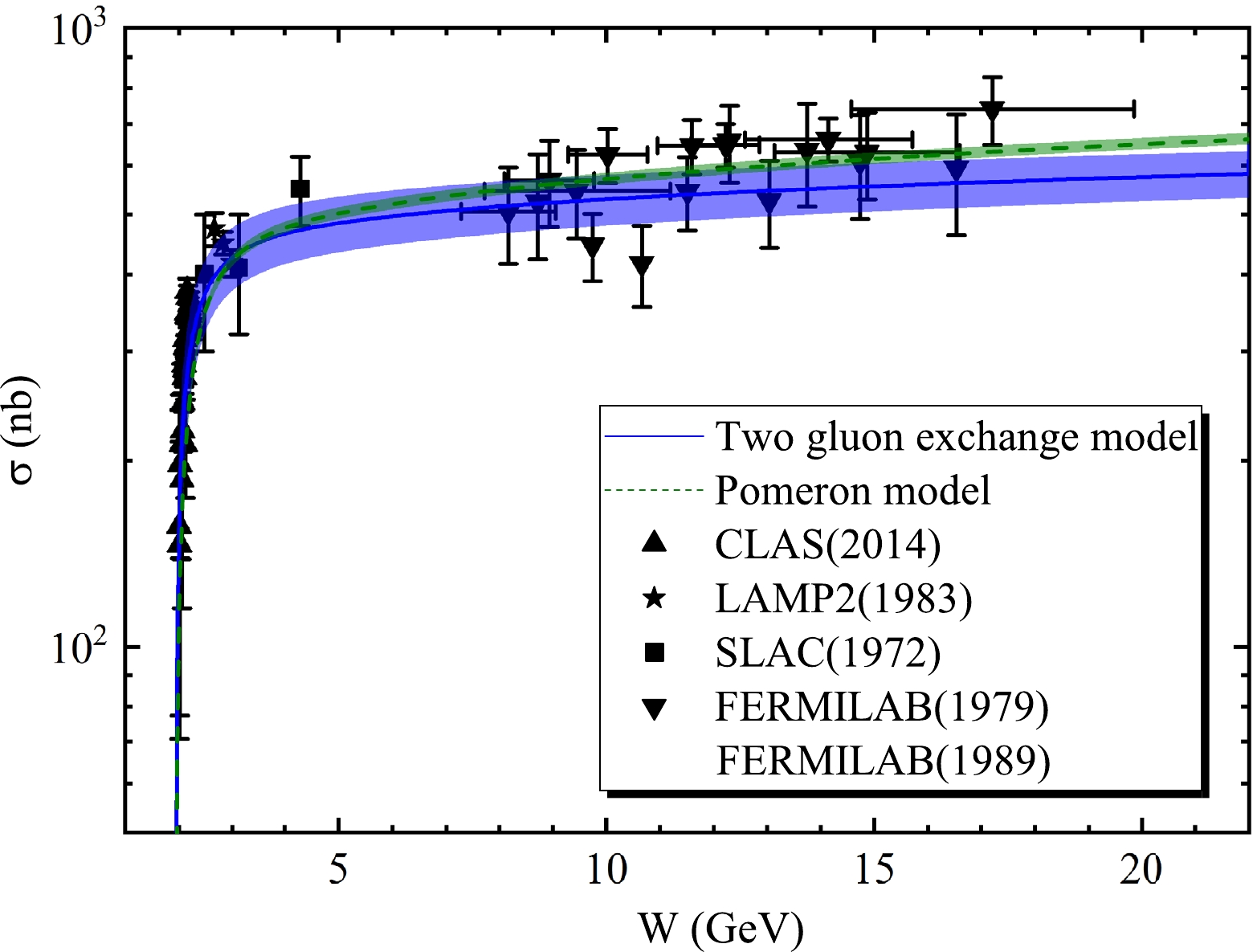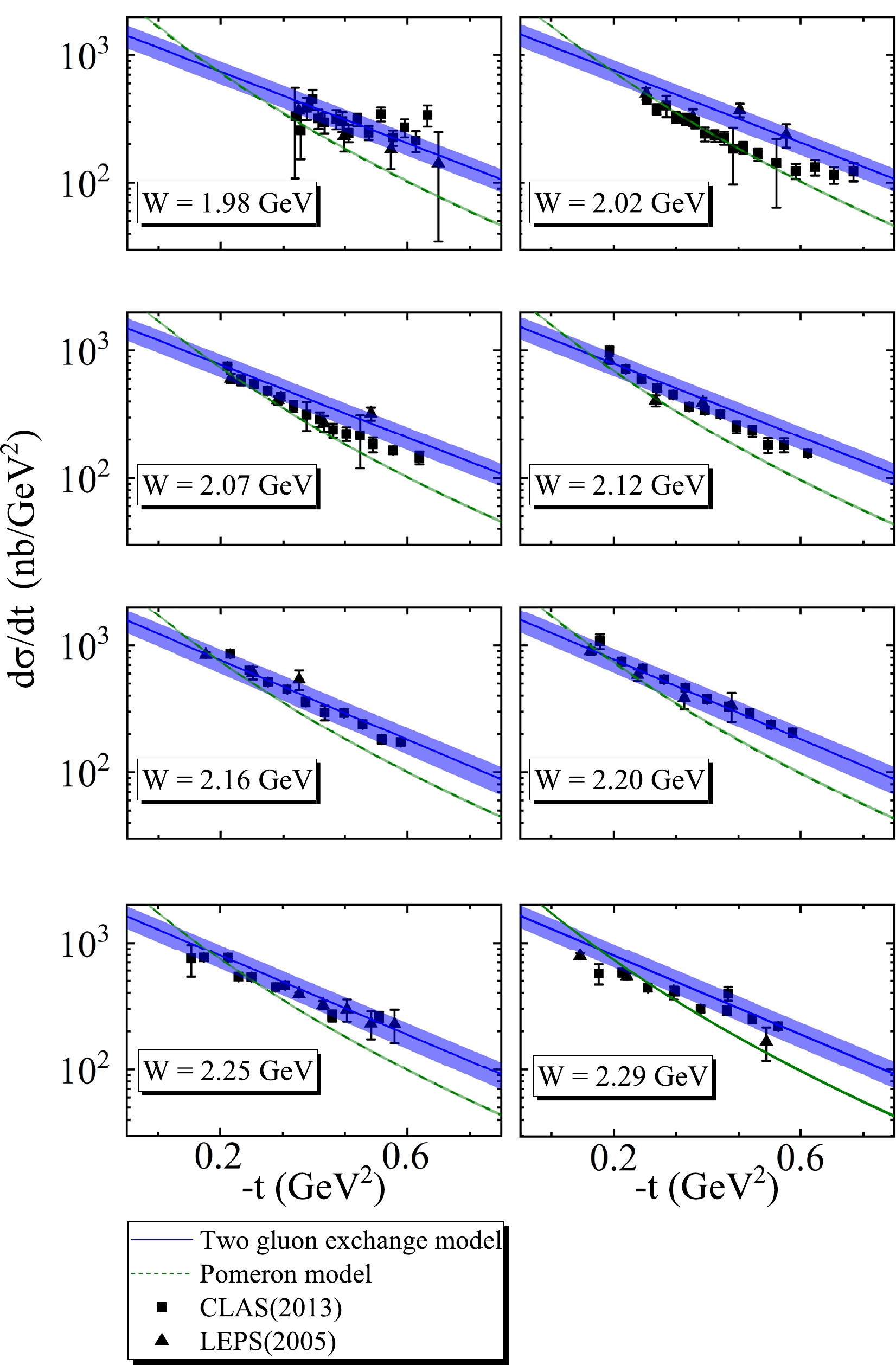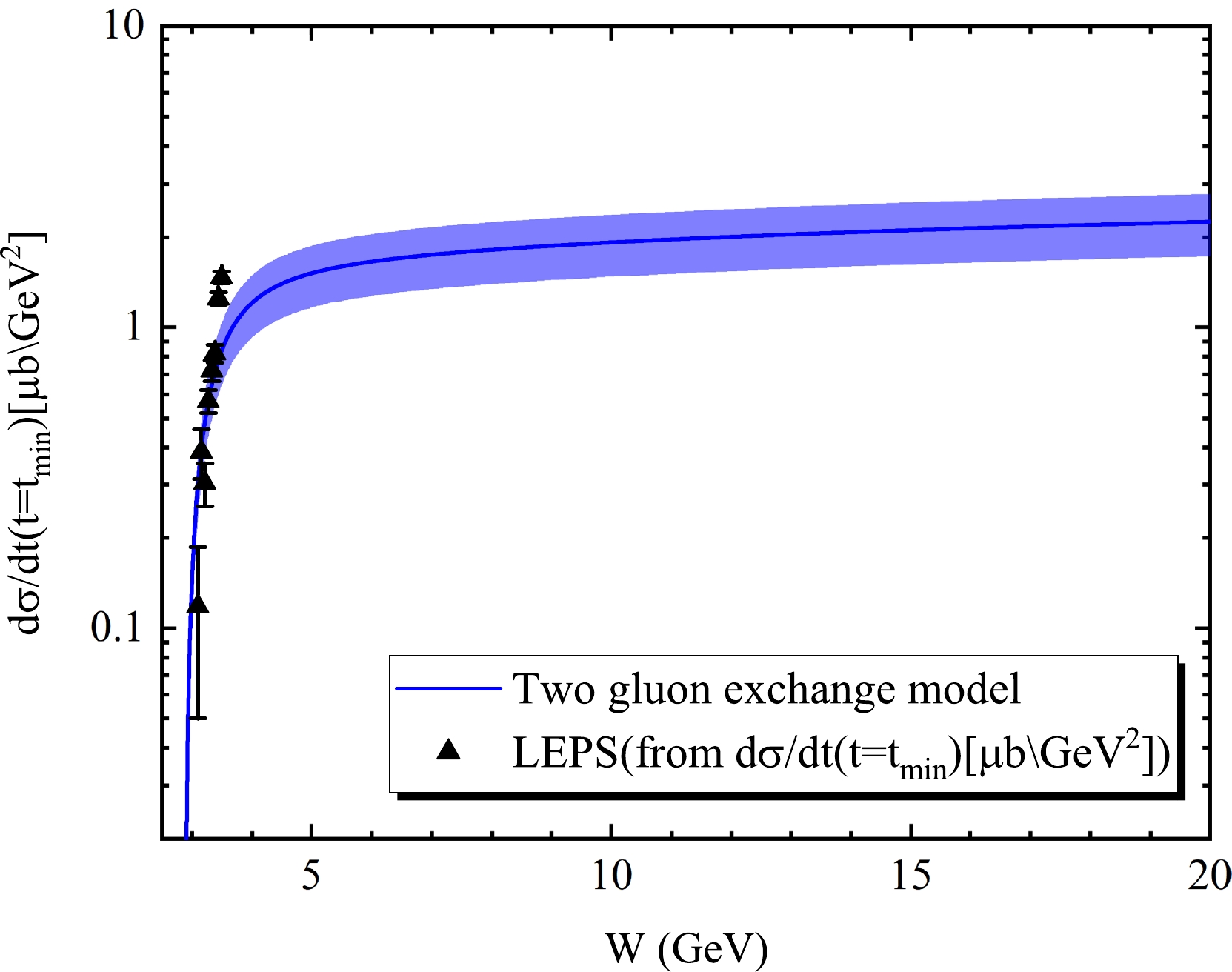 $ \alpha_{s}=0.701 $ is from Ref. [28],$ m_{s} $ is the mass of the strange quark,$ m_{\phi}=1.019 $ GeV is the mass of the meson ϕ, and$ b_{0} $ is the slope.$ xg(x,m_{\phi}^{2})=A_{0}x^{A_{1}}(1-x)^{A_{2}} $ is the parameterized gluon distribution function, and$ A_{0} $ ,$ A_{1} $ , and$ A_{2} $ are free parameters. The total cross section of ϕ photoproduction can be obtained by integrating Eq. (11) from$t_{\rm min}(W)\rightarrow t_{\rm max}(W)$ $ \begin{equation} \sigma^{\gamma p \rightarrow \phi p}=\int_{t_{\rm min}(W)}^{t_{\rm max}(W)}\frac{{\rm d} \sigma^{\gamma p \rightarrow \phi p}}{{\rm d} t}{\rm d} t. \end{equation} $