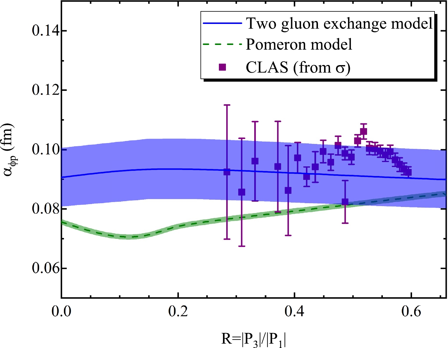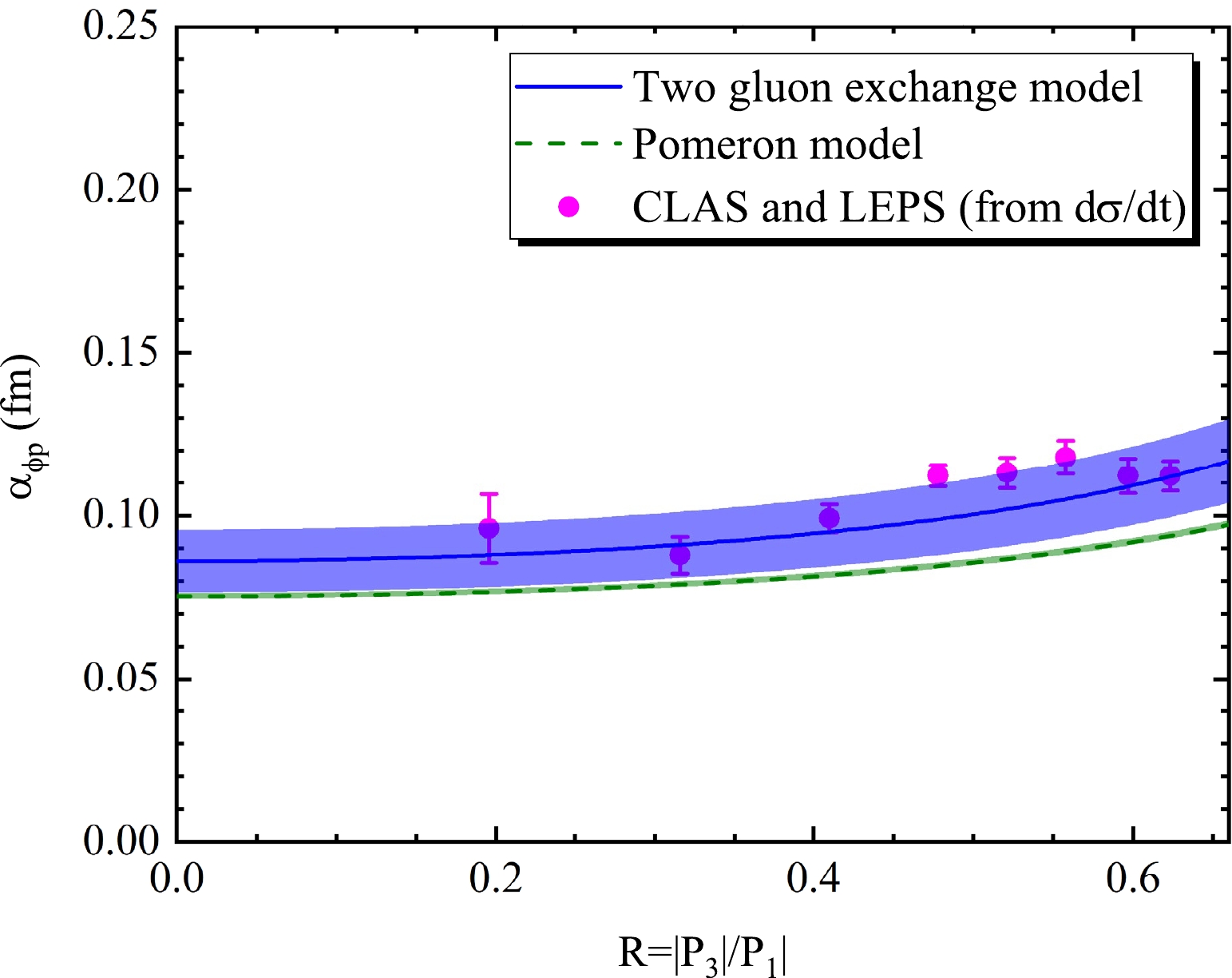 $ |\alpha_{\phi p}| $ can also be calculated from the total cross section of ϕ photoproduction. The$ |\alpha_{\phi p}| $ as a function of$ R\in[0,0.66] $ directly calculated from CLAS data [2] and based on the total cross sections predicted by the two models is shown in Fig. 6.$ \sqrt{\langle |\alpha^{2}_{\phi p}|\rangle}= 0.091\pm 0.010 $ fm based on the two gluon exchange model, and$ \sqrt{\langle |\alpha^{2}_{\phi p}|\rangle}=0.081\pm0.001 $ fm for the pomeron model.$ \sqrt{\langle |\alpha^{2}_{\phi p}|\rangle}=0.096\pm0.010 $ fm is obtained directly from the total experimental cross section of CLAS data [2]. Here, the same problem arises.$ |\alpha_{\phi p}| $ based on the pomeron model is obviously small and in poor agreement with that obtained directly from CLAS data [2]. This indicates that the pomeron model's overall prediction is insufficient. Therefore,$ |\alpha_{\phi p}| $ obtained by the pomeron model is ignored in the discussion below.The above discussion shows differences in the scattering length obtained from the total and differential cross sections of ϕ photoproduction at