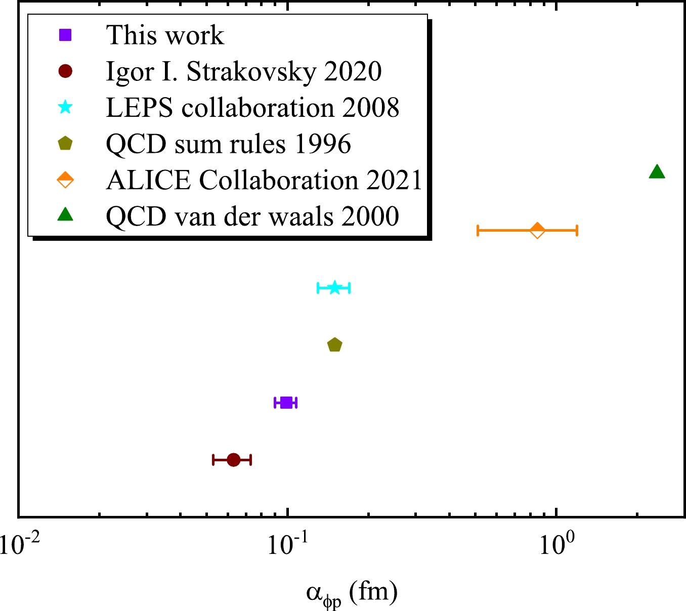 $ |\alpha_{\phi p}|=0.10\pm0.01 $ fm. The burgundy circle is$ |\alpha_{\phi p}|=0.063\pm0.01 $ fm, which was obtained by CLAS data analysis with the VMD model [2]. The LEPS laboratory [3] obtained$ |\alpha_{\phi p}|=0.15 $ fm, which is represented by a cyan pentagram. The dark yellow pentagon represents$ |-0.15| \pm 0.02 $ fm, obtained with QCD sum rules [4]. The olive-green triangle represents$ |\alpha_{\phi p} |\simeq2.37 $ fm, obtained by QCD van der Waals [13]. The orange diamond is the result of the ALICE Collaboration [16].In our previous studies [5, 6], the scattering lengths of