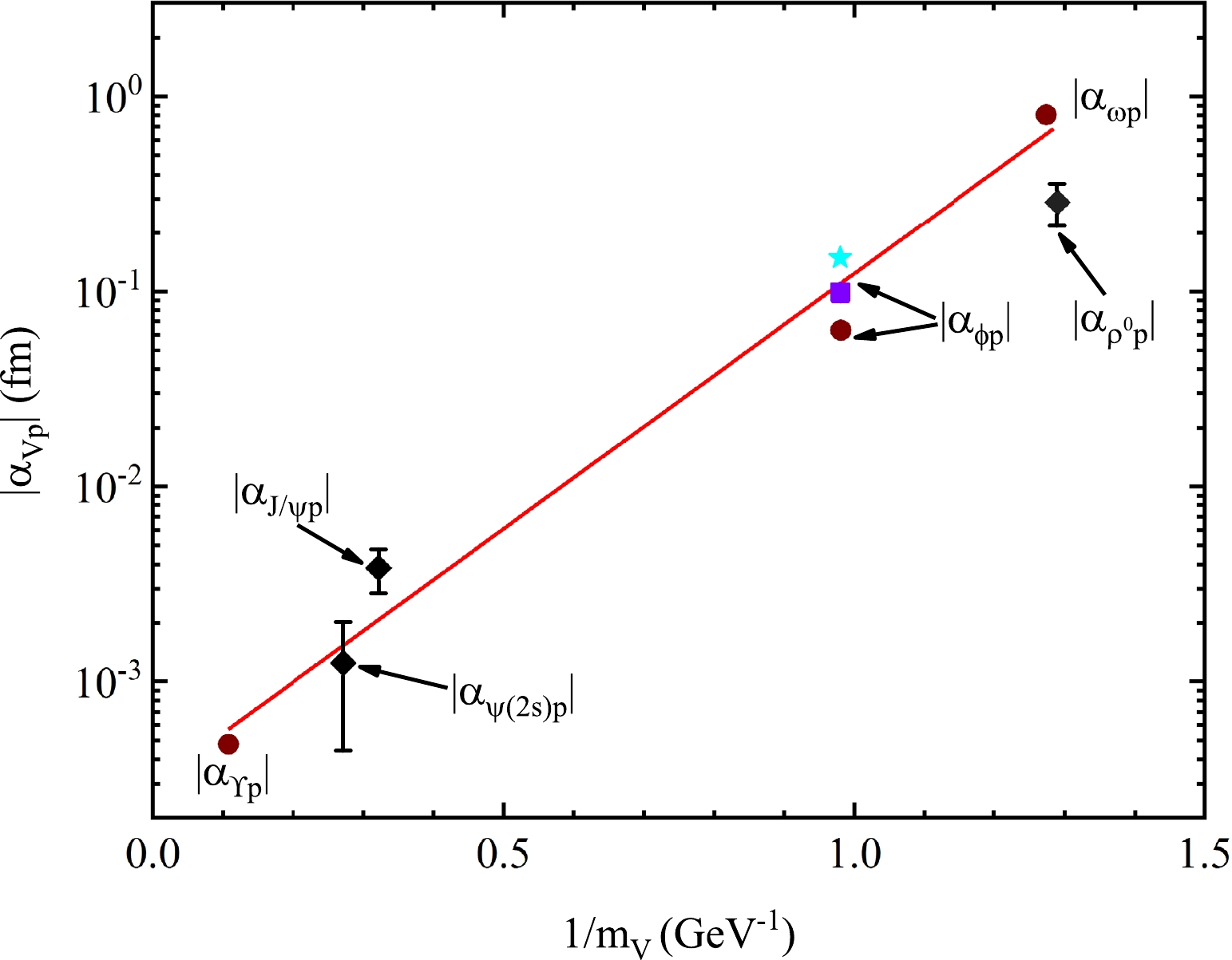 $ J/\psi $ -p,$ \psi(2S) $ -p, and ρ-p were systematically studied. In addition, relative vector meson scattering lengths have been calculated by other research groups [2–4, 7, 8]. The scattering lengths calculated by different groups for vector mesons with the proton interaction are shown in Fig. 8. The red line represents the proportional relationship between the scattering length$ |\alpha_{Vp}| $ and$ \exp{(1/m_{V})} $ .$|\alpha_{\phi p}|= 0.10\pm0.01$ fm from this study intersects this line, demonstrating that our analysis is reliable.
