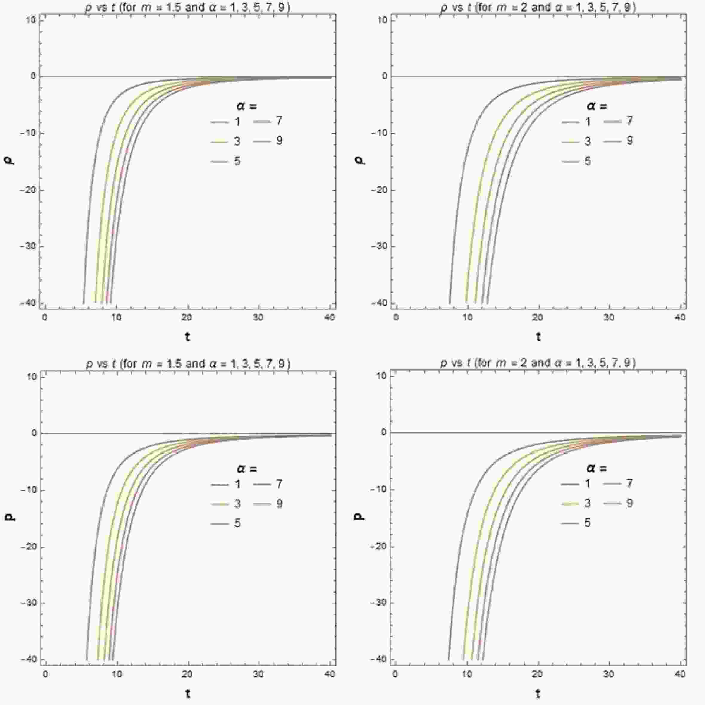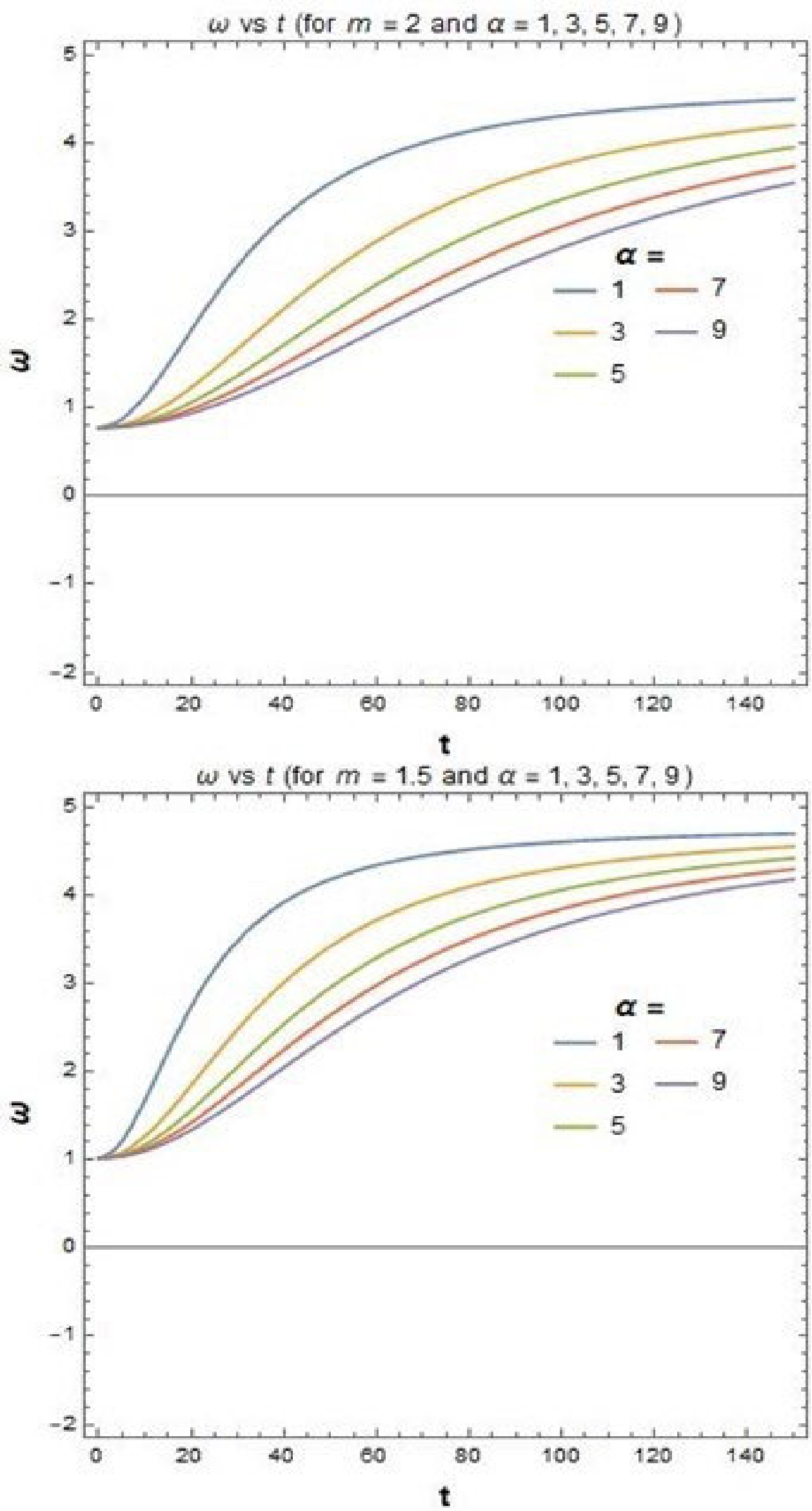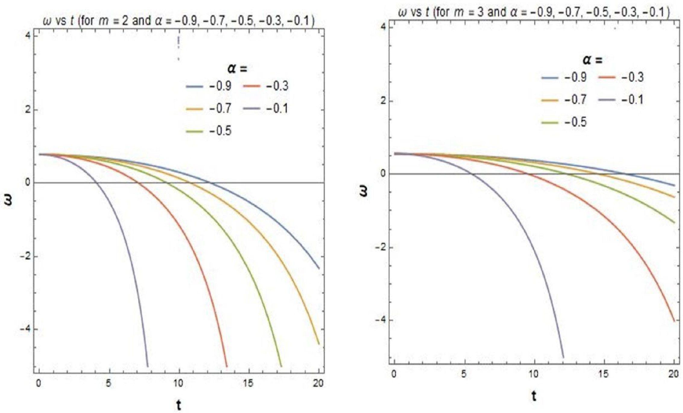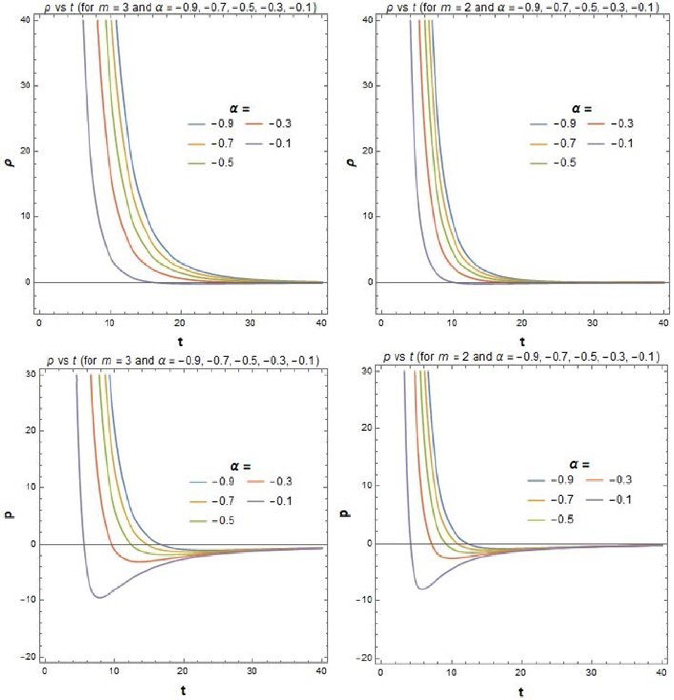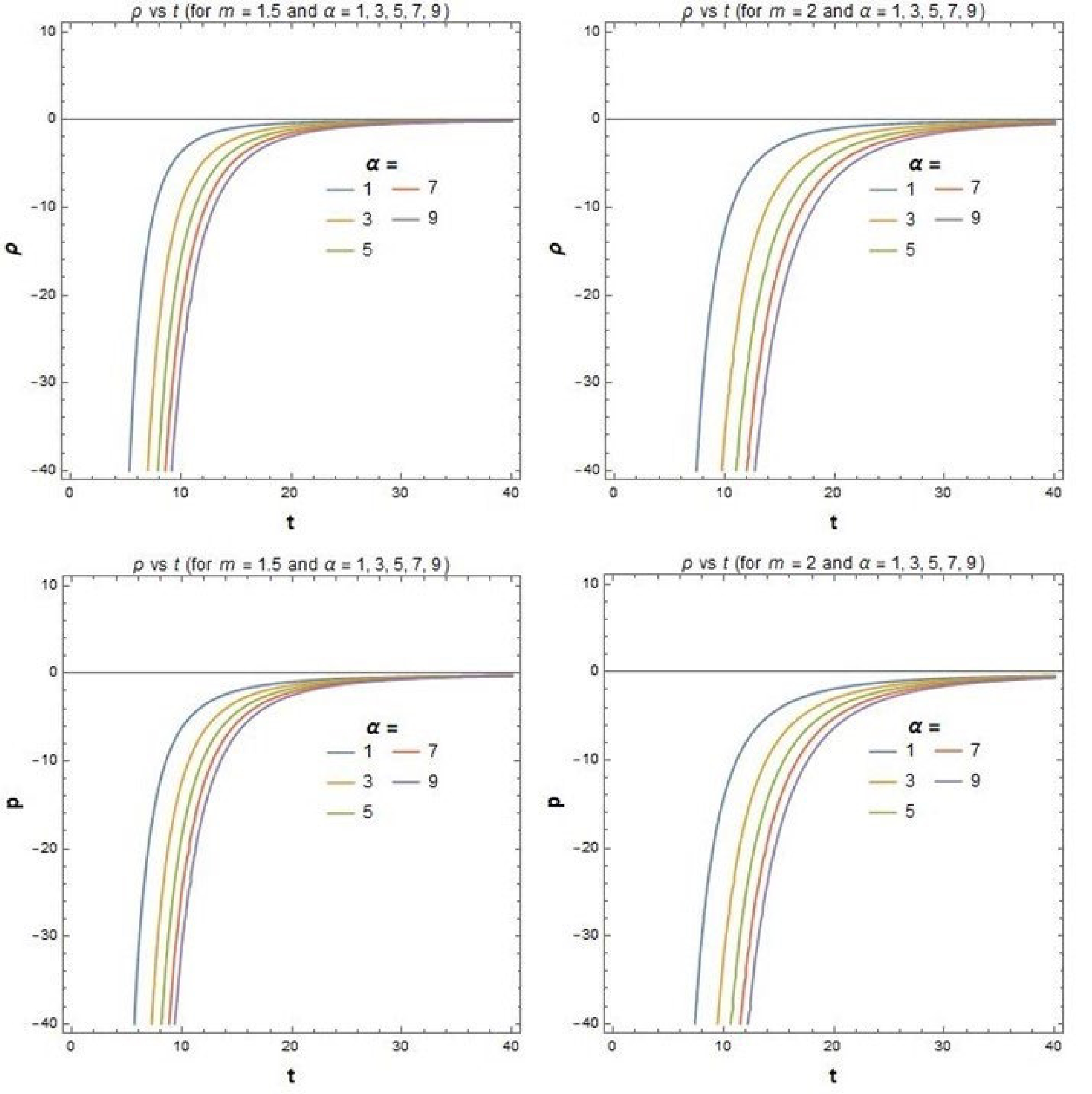 $ 0.75 $ . Therefore, we note that in the context of the dark energy regime, our result is in good agreement with observational data. Nowadays, people believe that dark energy is one of the reasons for the accelerating universe. So, our value of dark energy density may indicate that the universe is more accelerating. From Figs. 3 and 4, we also observe that our model is observationally verified for certain values of parameters. According to Fig. 3, the negativity of pressure can be achieved after a certain value of time, which may be responsible for the accelerating universe. The variation of EOS ($ {\omega} $ ) with time (t) in Fig. 4 shows that$ {\omega} $ approaches negative values, which corresponds to observational results [81] of the present universe.Also, we would like to put here the following two special aspects which emerge from the present investigation: (i) This model can open up an alternative window to explore the current cosmic acceleration without a stringent condition of invoking an exotic component as the dark energy. In other words, this theory seems interesting from a purely gravitational theory standpoint, rather than the cosmological context of dark energy whose very existence is still an issue of doubt [88] according to the latest analysis of data from the Planck consortium [86, 87]. However, the arbitrariness in the choice of different functional forms of
