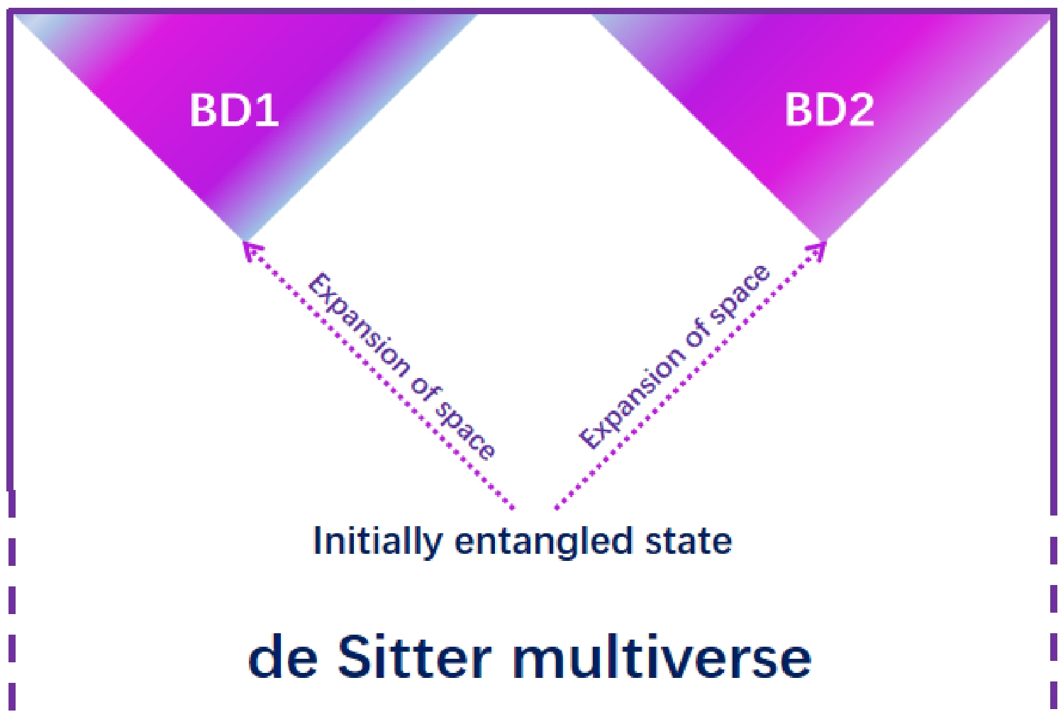 Quantum coherence, arising from the superposition principle of quantum states, is an important feature of the quantum world and is the basis of the fundamental phenomena of quantum interference [1]. Similar to quantum entanglement, quantum coherence is an important quantum resource that can be applied in quantum information processing, solid state physics, quantum optics, nanoscale thermodynamics, and biological systems [2–12]. Although quantum coherence is of great importance, it did not attract further attention until Baumgratz et al. proposed a rigorous resource theory framework for the quantization of coherence, such as the $ l_1 $ norm of coherence and relative entropy of coherence [13]. For complex multipartite systems, the$ l_1 $ norm of coherence is more directly calculated and is easier to obtain analytical expression for than the relative entropy of coherence. However, as the quantum information task becomes increasingly complex, we must deal with it using multipartite coherence.Observer-dependent quantum entanglement can be discussed in the background of an expanding universe [14–17]. The theory of inflationary cosmology and our current observations suggest that our universe may approach de Sitter space with a positive cosmological constant in the far past and far future, which is the unique maximally symmetric curved spacetime. Any two mutually separated R and L regions are eventually causally disconnected in de Sitter space [18], where the universe expands exponentially. This is most appropriately described by spanning open universe coordinates for two open charts in de Sitter space. The positive frequency mode functions of a free massive scalar field correspond to the Bunch-Davies vacuum (the Euclidean vacuum) that supports in both the R and L regions. Using these, entanglement entropy between two causally disconnected regions in de Sitter space has been studied in the Bunch-Davies vacuum and α-vacua [19–24]. Motivated by this, quantum steering, entanglement, and discord were also studied [25–29]. Because it has been shown that quantum entanglement between causally separated regions (beyond the size of the Hubble horizon) exists in de Sitter space, there may be observable effects of quantum correlations on the cosmic microwave background (CMB) in our expanding universe. The vacuum fluctuations in our expanding universe may be entangled with those in another part of the multiverse [19]. In other words, we can consider quantum entanglement between two causally disconnected de Sitter spaces (BD1 and BD2) as depicted in Fig. 1 [26, 30]. A quantum system comprises subsystems BD1 and BD2. Assume that the Universe is BD1 and we have no access to BD2. In fact, quantum entanglement of the reduced density matrix influences the shape of the spectrum on large scales, which is comparable to or greater than the curvature radius [20]. This may be the observational signature of the multiverse. In addition, quantum coherence may be determined by the observers in the process of bubble nucleation. It is well known that quantum coherence reflects the nonclassical world better than quantum entanglement, which is considered to be derived from the nonlocal superposition principle of quantum states. In other words, quantum entanglement is a special kind of quantum coherence (genuine coherence) [31–33]. In general, quantum entanglement and coherence show similar properties in a relativistic setting [34–40]. It is not clear whether multipartite coherence and quantum entanglement have similar properties in the multiverse. Therefore, demonstrating the observer's dependence on multipartite coherence in the multiverse is one of the aims of our study. Another goal of our study is to better understand the multiverse through multipartite coherence. According to the string landscape and inflationary cosmology, our universe may not be the only one, but part of the multiverse [41–45]. In the structure of the multiverse model, there may be many causally disconnected de Sitter bubbles (de Sitter universes). Until recently, the multiverse was merely untestable philosophical conjecture. However, in the multiverse, quantum coherence between N causally separated universes may generate detectable signatures. Some of their quantum states far from the Bunch-Davies vacuum may be entangled with another universes [19]. Then, we introduce N observers who determine quantum coherence between N causally disconnected de Sitter spaces. We assume n observers inside de Sitter universes and aim to discover how the inner n observers detect the signature of quantum coherence with other $ N-n $ de Sitter universes.In this paper, we discuss quantum coherence of the N-partite Greenberger-Horne-Zeilinger (GHZ) and W states of massive scalar fields in de Sitter universes. We assume that $ N-n $ observers are in their respective static universes, whereas n observers are in their expanding universes. Here, an observer corresponds to a universe. We calculate N-partite coherence and obtain its analytical expression in the de Sitter background. We find that with an increase in the curvature, N-partite coherence increases monotonically, whereas quantum correlation decreases monotonically as the curvature increases in de Sitter universes [25–28]. Therefore, we can gain a deeper understanding of the multiverse from the perspective of quantum resources. Although this research may involve quantities that cannot be directly detected in the multiverse, it provides profound insights into the fundamental nature of quantum systems in different spacetime backgrounds.Interestingly, quantum coherence of the N-partite GHZ state in de Sitter universes has nonlocal and local coherence that can exist in subsystems, whereas quantum coherence of the N-partite GHZ state in Rindler spacetime is genuinely global and cannot exist in any subsystems. We quantify nonlocal coherence in terms of the correlated coherence of the multipartite systems in t