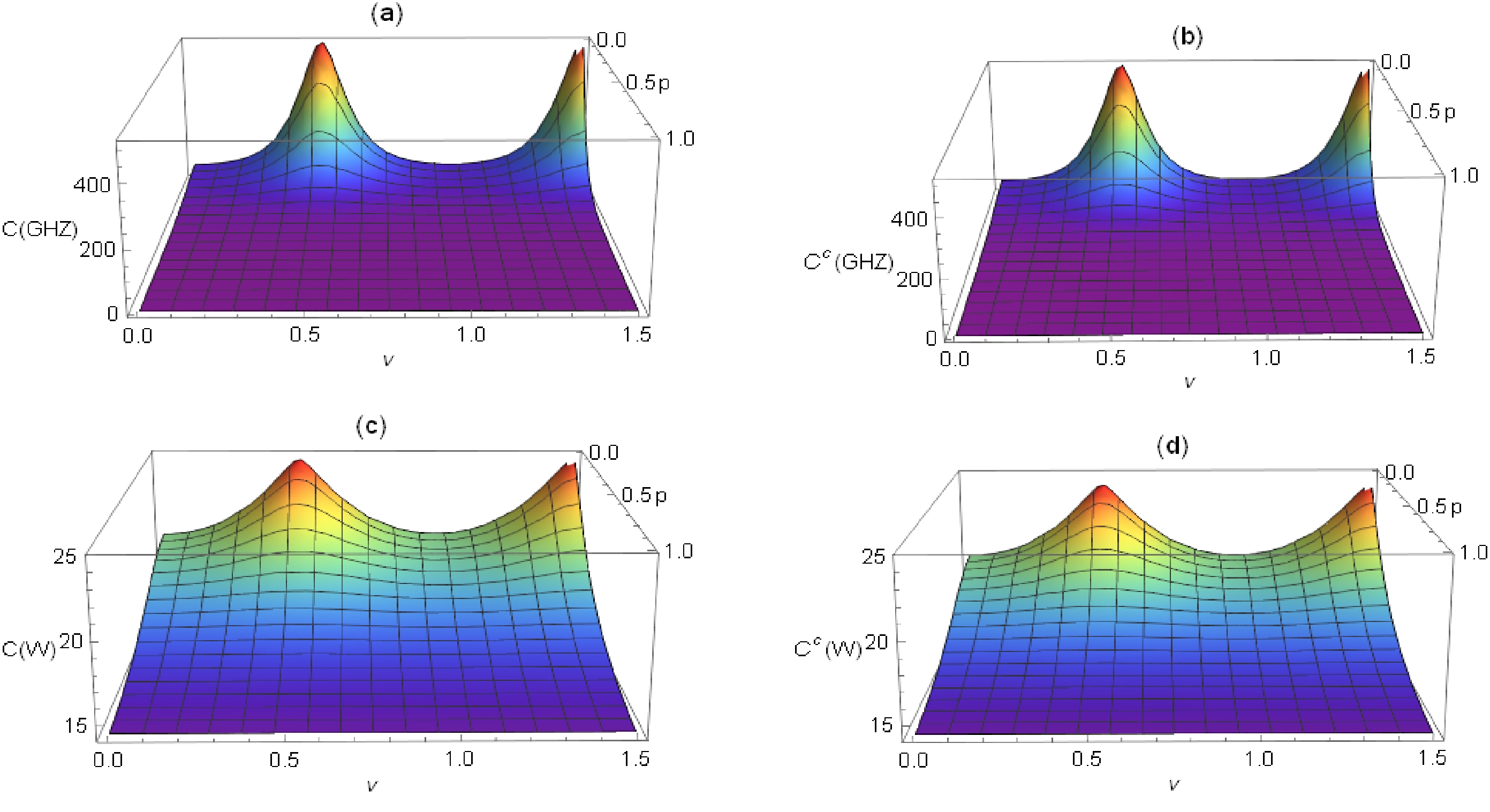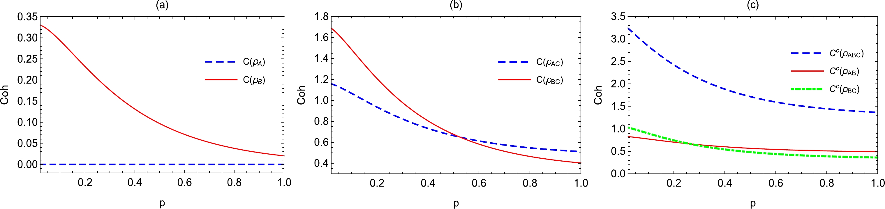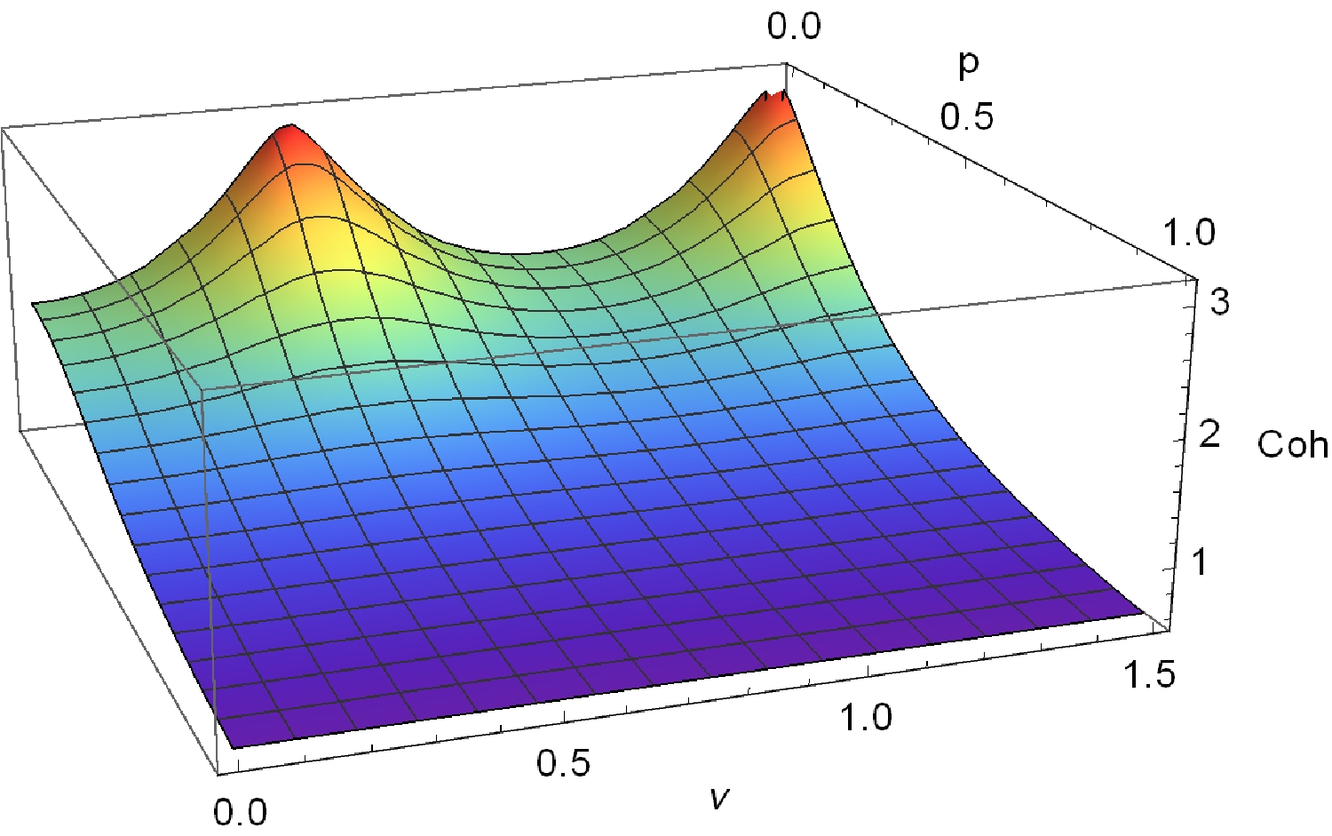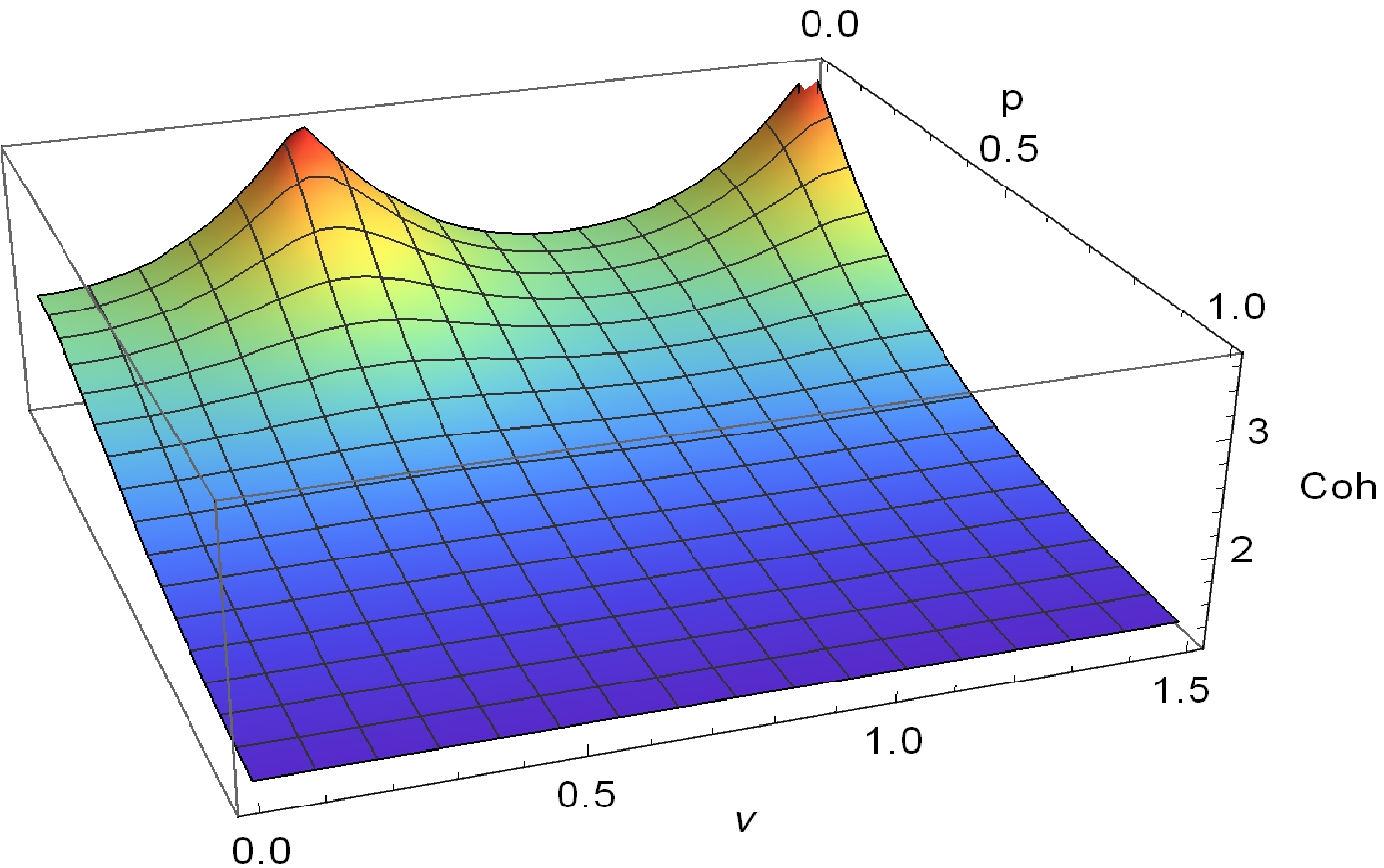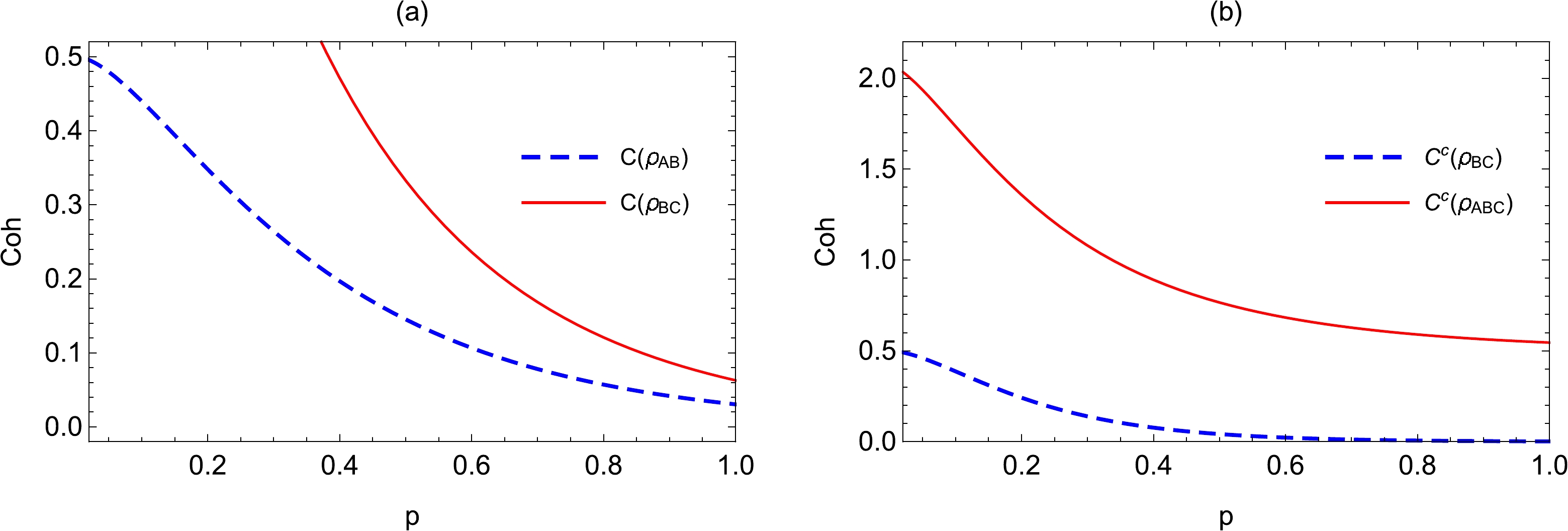In this section, we assume that Alice, Bob, and Charlie initially share the W state $ \begin{split} |W\rangle=\,& \frac{1}{\sqrt{3}}[|0\rangle_{A, {\rm{BD}}_{1}}|0\rangle_{B, {\rm{BD}}_{2}}|1\rangle_{C, {\rm{BD}}_{3}} +|0\rangle_{A, {\rm{BD}}_{1}}|1\rangle_{B, {\rm{BD}}_{2}}|0\rangle_{C, {\rm{BD}}_{3}} \\ & + |1\rangle_{A, {\rm{BD}}_{1}}|0\rangle_{B, {\rm{BD}}_{2}}|0\rangle_{C, {\rm{BD}}_{3}}].\\[-1pt] \end{split} $  (42) Following the treatment for the GHZ state, the W state becomes $ \begin{aligned}[b] |W\rangle_{AB\bar{B}C\bar{C}}=\;&\frac{(1-|\gamma_{p}|^{2})^{\frac{3}{2}}}{\sqrt{6}}\sum\limits_{n,m=0}^{\infty}\gamma_{p}^{n}\gamma_{p}^{m}\big[\sqrt{m+1}|0\rangle_{A} |n\rangle_{B} |n\rangle_{\bar{B}}(| m\rangle_{C}|m+1\rangle_{\bar{C}}\\&+|(m+1)\rangle_{C}|m\rangle_{\bar{C}} )+\sqrt{n+1}|0\rangle_{A}(|n\rangle_{B}|n+1\rangle_{\bar{B}}+|n+1\rangle_{B}+|n\rangle_{\bar{B}})\\ &\otimes|m\rangle_{C}|m\rangle_{\bar{C}}+\sqrt{2}(1-|\gamma_{p}|^{2})^{-\frac{1}{2}}|1\rangle_{A} |n\rangle_{B}|n\rangle_{\bar{B}} |m\rangle_{C}|m\rangle_{\bar{C}}\big]. \end{aligned} $  (43) The reduced density matrix after tracing over the modes $ \bar{B} $ and$ \bar{C} $ can be expressed as$ \rho_{ABC}=\frac{1}{3}\sum\limits_{n,m=0}^{\infty}\gamma_{p}^{2n}\gamma_{p}^{2m}\rho_{n,m} $  (44) $ \begin{aligned} \rho_{n,m}=&|0\rangle_{A}\langle0|\otimes(1-|\gamma_{p}|^{2})|n\rangle_{B}\langle n| \otimes \frac{(1-|\gamma_{p}|^{2})^{2}}{2}[(m+1)(|m\rangle_{C}\langle m|+|m+1\rangle_{C}\langle m+1|) +\sqrt{m+2}\sqrt{m+1}(\gamma_{p}^{*}|m\rangle_{C}\langle m+2|\\ &+\gamma_{p}|m+2\rangle_{C}\langle m|)] + |0\rangle_{A}\langle0|\otimes\frac{(1-|\gamma_{p}|^{2})^{2}}{2} [(n+1)(|n\rangle_{B}\langle n|+|n+1\rangle_{B}\langle n+1|)+\sqrt{n+1}\sqrt{n+2} (\gamma_{p}^{*}|n\rangle_{B}\\ & \langle n+2|+\gamma_{p}|n+2\rangle_{B}\langle n|)](1-|\gamma_{p}|^{2})\otimes|m\rangle_{C}\langle m| + [|0\rangle_{A}\langle0|\otimes\frac{(1-|\gamma_{p}|^{2})^{\frac{3}{2}}}{\sqrt{2}}\sqrt{n+1}[|n\rangle_{B}\langle n+1|+\gamma_{p}|n+1\rangle_{B}\langle n|]\\ &\otimes\frac{(1-|\gamma_{p}|^{2})^{\frac{3}{2}}}{\sqrt{2}}\sqrt{m+1}[\gamma_{p}^{*}|m\rangle_{C}\langle m+1|+|m+1\rangle_{C}\langle m|]+h.c.] +[|0\rangle_{A}\langle1||n\rangle_{B}\langle n|\otimes\frac{(1-|\gamma_{p}|^{2})^{\frac{3}{2}}}{\sqrt{2}}\sqrt{m+1}[\gamma_{p}^{*}|m\rangle_{C}\\ &\langle m+1|+|m+1\rangle_{C}\langle m|]+h.c.]+[|1\rangle_{A}\langle0| \otimes\frac{(1-|\gamma_{p}|^{2})^{\frac{3}{2}}}{\sqrt{2}}\sqrt{n+1}[|n\rangle_{B}\langle n+1| +\gamma_{p}|n+1\rangle_{B}\langle n|]\otimes|m\rangle_{C}\langle m|+h.c.] \\ &+ (1-|\gamma_{p}|^{2})^{2}{[|1\rangle_{A}\langle1||n\rangle_{B}\langle n||m\rangle_{C}\langle m|]}. \end{aligned} $  (45) Employing Eq. (27), the coherence of the W state becomes $ \begin{aligned}[b] C(\rho_{ABC})=&\frac{1}{3}\{2(1-|\gamma_{p}|^{2})^{2}\sum\limits_{n=0}^{\infty}|\gamma_{p}|^{2n+1}\sqrt{n+2}\sqrt{n+1}\\ &+2\sqrt{2}(1-|\gamma_{p}|^{2})^{\frac{3}{2}}\sum\limits_{m=0}^{\infty}|\gamma_{p}|^{2m}\sqrt{m+1}(|\gamma_{p}|+1)\\ &+(1-|\gamma_{p}|^{2})^{3}[\sum\limits_{m=0}^{\infty}|\gamma_{p}|^{2m}\sqrt{m+1}(|\gamma_{p}|+1)]^{2}\}. \end{aligned} $  (46) As shown in Fig. 4, quantum coherence of the W state decreases monotonically with an increase in the curvature parameter p, which indicates that quantum coherence increases monotonically with increasing curvature. From Fig. 4, we also find that quantum coherence of the W state is most severely affected by the curvature effect of de Sitter space for $ \nu\rightarrow1/2 $ (conformally coupled massless limit) and$ \nu\rightarrow3/2 $ (minimally coupled massless limit). In addition, quantum coherence of the W state is larger than that of the GHZ state, which means that quantum coherence of the W state is more suitable for processing quantum information tasks in the multiverse.  Figure 4. (color online) Quantum coherence $ C(\rho_{ABC}) $ of the W state as a function of the mass parameter ν and curvature parameter p.We obtain the density matrix $ \rho_{BC} $ ,$ \rho_{AC} $ , and$ \rho_{AB} $ after tracing over the modes A, B, and C from the state$ \rho_{ABC} $ , respectively.$ \begin{split} \qquad\;\; \rho_{BC}=&\frac{1}{3}[[(1-|\gamma_{p}|^{2})\sum\limits_{n=0}^{\infty}\gamma_{p}^{2n}|n\rangle_{B}\langle n|\otimes\frac{(1-|\gamma_{p}|^{2})^{2}}{2}\sum\limits_{m=0}^{\infty}\gamma_{p}^{2m}[(m+1)(|m\rangle_{C}\langle m|+|m+1\rangle_{C}\langle m+1|)+\sqrt{m+1}\sqrt{m+2}\\ &(\gamma_{p}|m+2\rangle_{C} \langle m|+\gamma_{p}^{*}|m\rangle_{C}\langle m+2|)]+h.c.] +[\frac{(1-|\gamma_{p}|^{2})^{\frac{3}{2}}}{\sqrt{2}}\sum\limits_{n=0}^{\infty}\gamma_{p}^{2n}\sqrt{n+1} (|n\rangle_{B}\langle n+1|+\gamma_{p}|n+1\rangle_{B}\langle n|) \otimes \frac{(1-|\gamma_{p}|^{2})^{\frac{3}{2}}}{\sqrt{2}}\\ &\sum\limits_{m=0}^{\infty}\gamma_{p}^{2m}\sqrt{m+1} (|m+1\rangle_{C}\langle m|+\gamma_{p}^{*}|m\rangle_{C}\langle m+1|)+ h.c.] +(1-|\gamma_{p}|^{2})\sum\limits_{n=0}^{\infty}\gamma_{p}^{2n}|n\rangle_{B}\langle n|\otimes(1-|\gamma_{p}|^{2})\sum\limits_{m=0}^{\infty}\gamma_{p}^{2m}|m\rangle_{C}\langle m|], \end{split} $  (47) $ \begin{split} \qquad\; \rho_{AC}=&\frac{1}{3}[|0\rangle_{A}\langle0|\otimes\frac{(1-|\gamma_{p}|^{2})^{2}}{2}\sum\limits_{m=0}^{\infty}\gamma_{p}^{2m}[(m+1)(|m\rangle_{B}\langle m|+|m+1\rangle_{B}\langle m+1|) +\sqrt{m+1}\sqrt{m+2}(\gamma_{p}|m+2\rangle_{B} \langle m|+\gamma_{p}^{*}|m\rangle_{B}\langle m+2|)]\\ &+|0\rangle_{A}\langle1| \otimes\frac{(1-|\gamma_{p}|^{2})^{\frac{3}{2}}}{\sqrt{2}}\sum\limits_{m=0}^{\infty}\gamma_{p}^{2m}\sqrt{m+1} (|m+1\rangle_{B}\langle m|+\gamma_{p}^{*}|m\rangle_{B}\langle m+1|) +|1\rangle_{A}\langle0|\otimes\frac{(1-|\gamma_{p}|^{2})^{\frac{3}{2}}}{\sqrt{2}}\sum\limits_{m=0}^{\infty}\gamma_{p}^{2m}\sqrt{m+1} (|m+1\rangle_{B}\langle m|\\ &+\gamma_{p}^{*}|m\rangle_{B}\langle m+1|) +|0\rangle_{A}\langle0|\otimes (1-|\gamma_{p}|^{2})\sum\limits_{m=0}^{\infty}\gamma_{p}^{2m}|m\rangle_{B}\langle m|+|1\rangle_{A}\langle1|\otimes(1-|\gamma_{p}|^{2})\sum\limits_{m=0}^{\infty}\gamma_{p}^{2m}|m\rangle