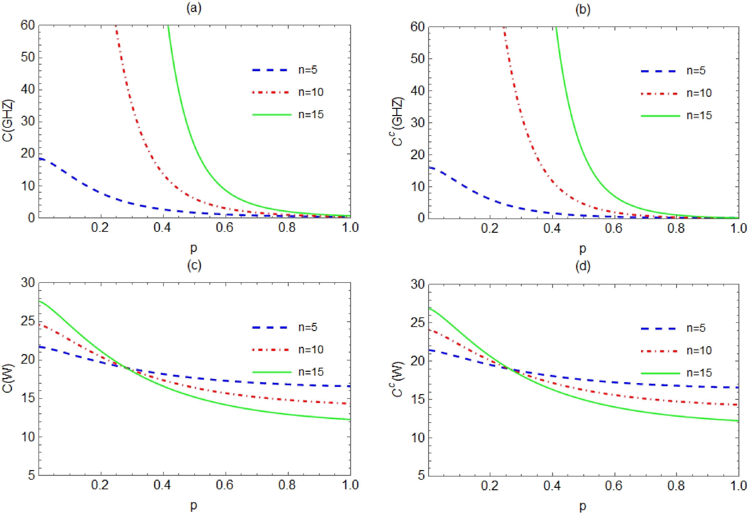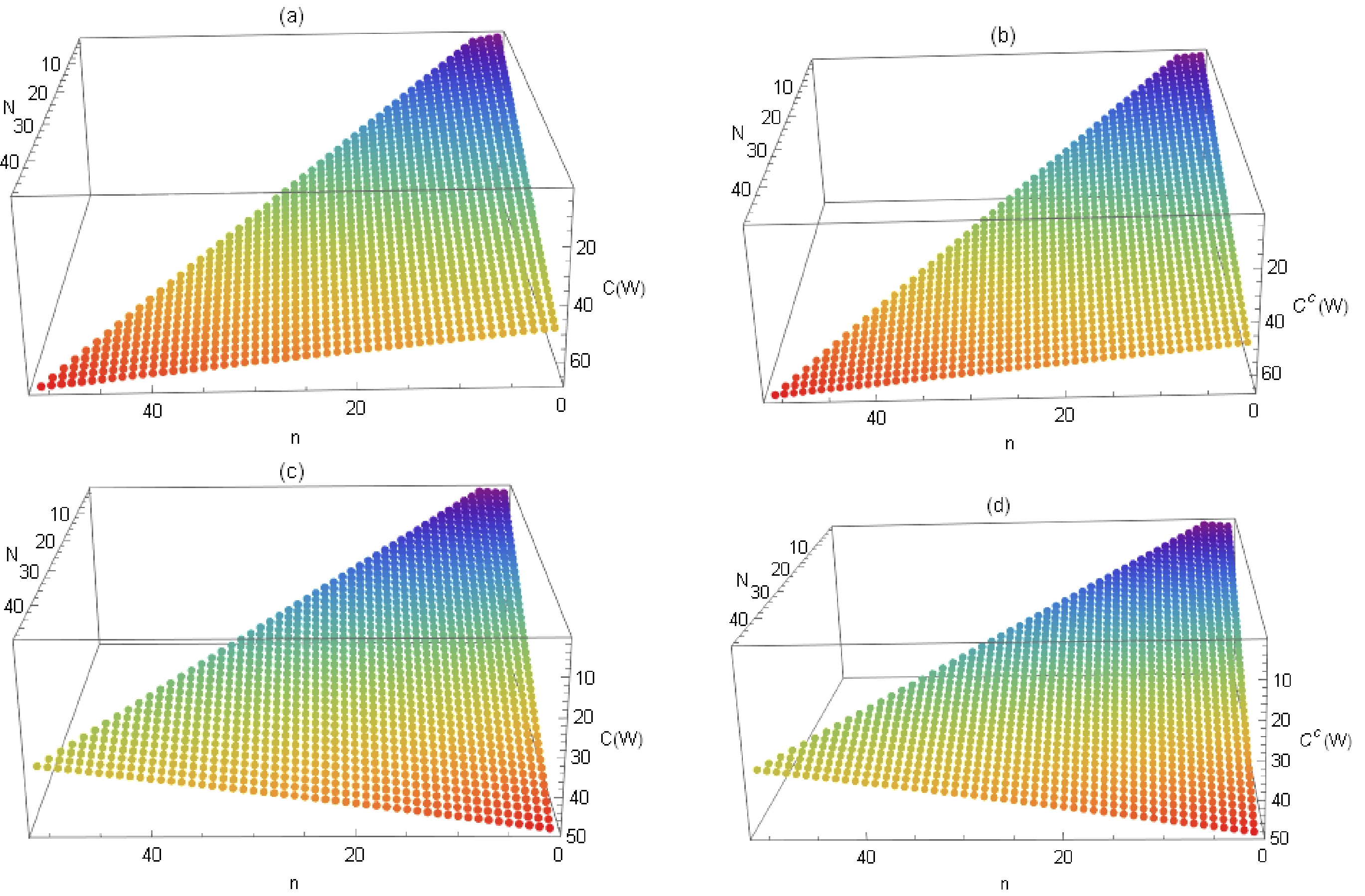 In this section, we discuss the extension of the tripartite systems to N-partite systems (N $ \geq 3 $ ). The N-partite GHZ and N-partite W states can be written as$ \begin{split} |GHZ\rangle_{123\cdot\cdot\cdot N}=\;& \frac{1}{\sqrt{2}}(|0\rangle_{{\rm{BD}}, 1}|0\rangle_{{\rm{BD}}, 2}...|0\rangle_{{\rm{BD}}, (N-1)}|0\rangle_{{\rm{BD}}, N} \\ &+ |1\rangle_{{\rm{BD}}, 1}|1\rangle_{{\rm{BD}}, 2}...|1\rangle_{{\rm{BD}}, (N-1)}|1\rangle_{{\rm{BD}}, N}), \end{split} $  (61) $ \begin{aligned}[b] |W\rangle_{123\cdot\cdot\cdot N}=&\frac{1}{N}(|1\rangle_{{\rm{BD}}, 1}|0\rangle_{{\rm{BD}}, 2}..|0\rangle_{{\rm{BD}}, (N-1)}|0\rangle_{{\rm{BD}}, N}\\ &+|0_{{\rm{BD}}, 1}|1\rangle_{{\rm{BD}}, 2}...|0_{{\rm{BD}}, (N-1)}|0\rangle_{{\rm{BD}}, N}+\cdot\cdot\cdot\\ &+|0_{{\rm{BD}},1}|0\rangle_{{\rm{BD}}, 2}...|0\rangle_{{\rm{BD}}, (N-1)}|1\rangle_{{\rm{BD}}, N}), \end{aligned} $  (62) where the mode i ( $ i=1, 2, ..., N $ )) is observed by observer$ O_i $ in de Sitter space$ {\rm{BD}}_{i} $ . Now, we assume that n ($ 2\leq n\leq N-1 $ ) observers are in the different L regions of the expanded de Sitter spaces and$ N-n $ observers are in the global charts of the other de Sitter spaces. Through a series of calculations, we obtain N-partite coherence of the GHZ and W states as$ \begin{split} \qquad C({\rm GHZ})=&\frac{1}{2}\bigg\{2\bigg[\frac{(1 - |\gamma_{p}|^{2})^{\frac{3}{2}}}{\sqrt{2}}\sum\limits_{m=0}^{\infty} |\gamma_{p}|^{2m}\sqrt{m + 1}(|\gamma_{p}|+1)\bigg]^{n}\\ &+\bigg[1+(1-|\gamma_{p}|^{2})^{2}\sum\limits_{m=0}^{\infty} |\gamma_{p}|^{2m+1}\\ & \sqrt{m+1}\sqrt{m+2}\bigg]^{n}-1\bigg\}, \end{split} $  (63) $ \begin{aligned}[b] C(W)=&\frac{1}{N}\bigg\{n(1-|\gamma_{p}|^{2})^{2}\sum\limits_{m=0}^{\infty}\sqrt{m+1}\sqrt{m+2}|\gamma_{p}|^{2m+1}\\ & +2n(N-n)\frac{(1-|\gamma_{p}|^{2})^{\frac{3}{2}}}{\sqrt{2}}\sum\limits_{m=0}^{\infty} |\gamma_{p}|^{2m}\sqrt{m+1}\\ &(|\gamma_{p}|+1)+n(n-1)[\frac{(1-|\gamma_{p}|^{2})^{\frac{3}{2}}}{\sqrt{2}}\sum\limits_{m=0}^{\infty} |\gamma_{p}|^{2m}\\ &\sqrt{m+1}(|\gamma_{p}|+1)]^{2}+(N-n)(N-n-1)\bigg\}. \end{aligned} $  (64) After tedious but straightforward calculations, the correlated coherence of the GHZ and W states reads as $ \begin{split} C^{c}( GHZ)=&\frac{1}{2}\bigg\{2\bigg[\frac{(1-|\gamma_{p}|^{2})^{\frac{3}{2}}}{\sqrt{2}}\sum\limits_{m=0}^{\infty} |\gamma_{p}|^{2m}\sqrt{m+1}(|\gamma_{p}|+1)\bigg]^{n}\\&+\bigg[ 1+(1-|\gamma_{p}|^{2})^{2}\sum\limits_{m=0}^{\infty} |\gamma_{p}|^{2m+1}\sqrt{m+1}\sqrt{m+2}\bigg]^{n}-1\\&-n(1-|\gamma_{p}|^{2})^{2}\sum\limits_{m=0}^{\infty} |\gamma_{p}|^{2m+1}\sqrt{m+1}\sqrt{m+2}\bigg\}, \end{split} $  (65) $ \begin{split} C^{c}(W)=&\frac{1}{N}\bigg[2n(N-n)\frac{(1-|\gamma_{p}|^{2})^{\frac{3}{2}}}{\sqrt{2}}\sum\limits_{m=0}^{\infty} |\gamma_{p}|^{2m}\sqrt{m+1}(|\gamma_{p}|+1)\\& + n(n-1)[\frac{(1-|\gamma_{p}|^{2})^{\frac{3}{2}}}{\sqrt{2}}\sum\limits_{m=0}^{\infty} |\gamma_{p}|^{2m}\sqrt{m+1}(|\gamma_{p}|+1)]^{2}\\& +(N-n)(N-n-1)\bigg]. \end{split} $  (66) As shown in Eqs. (63)−(66), N-partite (correlated) coherence of the GHZ state depends only on the n observers who are in the different L regions of the expanded de Sitter spaces, whereas N-partite (correlated) coherence of the W state depends not only on the n observers but also on the initial N observers. From Fig. 6, we find that the curvature effect enhances N-partite (correlated) coherence. Therefore, the curvature effect is beneficial to N-partite (correlated) coherence in the multiverse consisting of many de Sitter spaces. As shown in Fig. 7 (a)−(b), N-partite (correlated) coherence of the GHZ state increases monotonically with increasing n for any curvature parameter p. Fig. 7 (c)−(d) show that with an increase in n, N-partite (correlated) coherence of the W state increases monotonically for a smaller curvature parameter p, whereas it decreases monotonically for a larger curvature parameter p in the multiverse. From Fig. 8, we find that N-partite (correlated) coherence of the W state increases monotonically with increasing N for any p and n, whereas N-partite (correlated) coherence of the GHZ state is independent of N. We can also see that N-partite (correlated) coherence of the W state increases or decreases monotonically with increasing n depending on the curvature parameter p.   Figure 6. (color online) N-partite coherence and correlated coherence of the GHZ and W states as functions of the mass parameter ν and curvature parameter p for fixed n=10 and N=20.   Figure 7. (color online) N-partite coherence and correlated coherence of the GHZ and W states as functions of the curvature parameter p for fixed $ \nu= 3/2 $ , N = 20 and different n.  Figure 8. (color online) N-partite coherence and correlated coherence of the W state as functions of n and N for $ p=0.1 $ (a) and (b),$ p=0.6 $ (c) and (d). The parameter ν is fixed as$ \nu=3/2 $ .Next, we study the distribution relationship of coherence for N-partite systems in the multiverse. For the N-partite W state, the distribution relationship of the correlated coherence can be written as $ \begin{aligned}[b] & \frac{n(n-1)}{2}C^{c}(\rho_{O} \rho_{O} )+n(N-n)C^{c}(\rho_{O}\rho_{X} )\\ &\quad+\frac{(N-n)(N-n-1)}{2} C^{c}(\rho_{X}\rho_{X})=C^{c}(W). \end{aligned} $  (67) Here, $ C^{c}(\rho_{O}\rho_{O} )=\frac{2}{N}[\frac{(1-|\gamma_{p}|^{2})^{\frac{3}{2}}}{\sqrt{2}}\sum\limits_{m=0}^{\infty} |\gamma_{p}|^{2m}\sqrt{m+1}(|\gamma_{p}|+1)]^{2} $  denotes the bipartite correlated coherence of the modes corresponding to two observers in the L regions of the expanded de Sitter spaces; $ C^{c}(\rho_{O}\rho_{X})= \frac{2}{N}\frac{(1-|\gamma_{p}|^{2})^{\frac{3}{2}}}{\sqrt{2}}\sum\limits_{m=0}^{\infty} |\gamma_{p}|^{2m}\sqrt{m+1}(|\gamma_{p}|+1) $  denotes the bipartite correlated coherence of the modes corresponding to two observers who are in the L region of the expanded de Sitter space and the global chart of de Sitter space, respectively; $ C^{c}(\rho_{X}\rho_{X})= {2}/{N} $ denotes the bipartite correlated coherence of the modes c