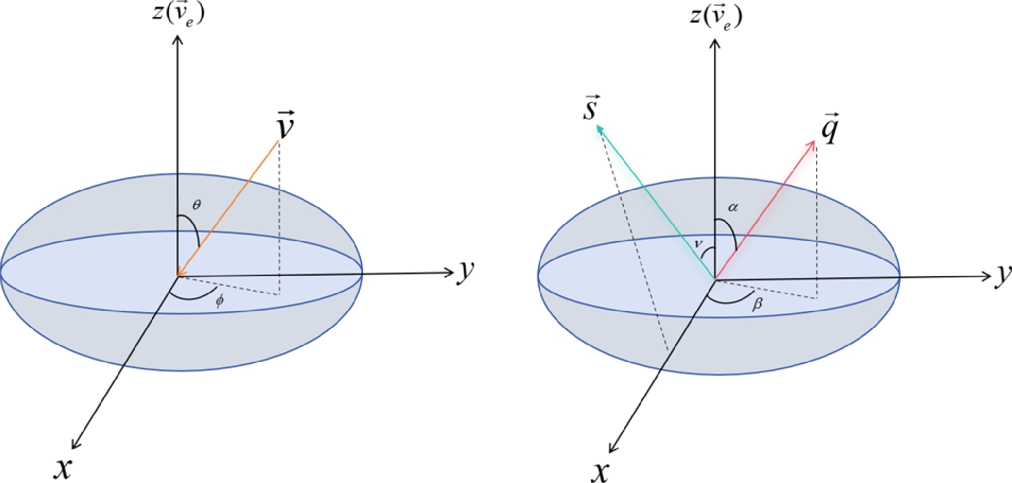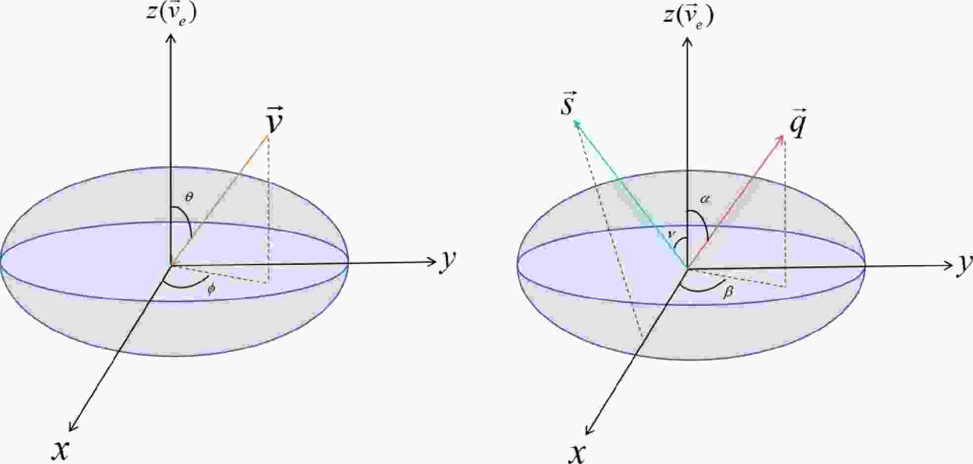 $ \vec{v} $ denote the incoming velocity of DM particle at the detector, and$ \vec{v}^\prime $ represents the outgoing velocity of the DM. As illustrated in Fig. 1, the unit vector$ \hat{v} $ is defined as$ (\sin \theta \cos \phi, \sin \theta \sin \phi, \cos \theta) $ . The unit vector of transferred momentum is denoted as$ \hat{q} $ and provided by$ (\sin \alpha \cos \beta,~ \sin \alpha \sin \beta,~ \cos \alpha) $ . To facilitate the discussion and explicitly showcase the angle dependence, let us begin by considering a specific scenario where$ \alpha=\theta={\pi}/{2} $ and$ \phi=0 $ . This simplification enables us to treat the inelastic collision between DM and nucleus as occurring on a two-dimensional plane. However, it is crucial to note that the entire scattering process can still be reconstructed in a three-dimensional plane. The conservation of energy and momentum leads to the following relationships: