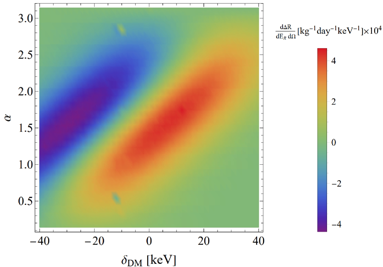 Figure 2. (color online) Differential rate of scattering events, especially the purely polarization-dependent component, is plotted against the polar recoil angle α for various mass splittings. The recoil energy