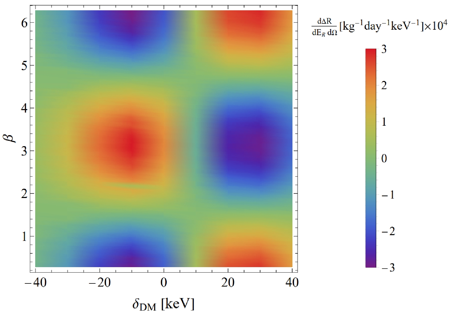 Figure 3. (color online) Polarization-dependent component of the differential scattering event rate is plotted with respect to the polar recoil angle β for various mass splittings. The recoil energy