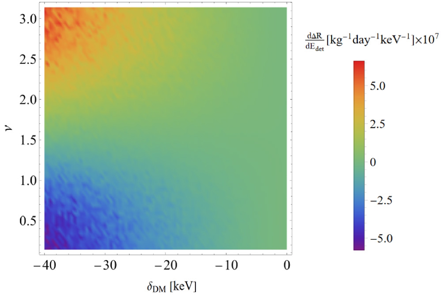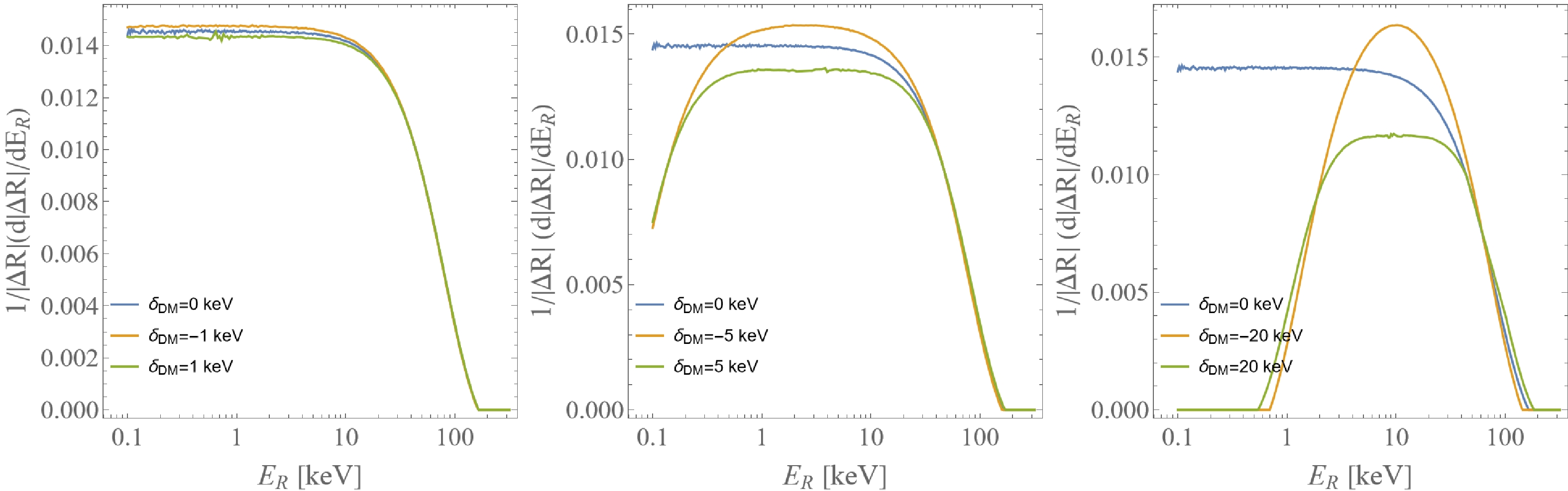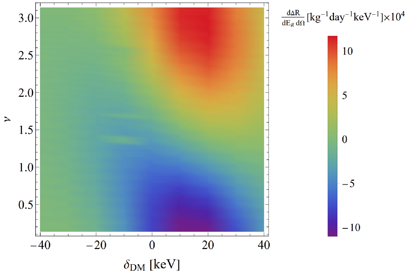 $ E_{R}-\delta_{{\rm{DM}}} $ plane. Across the entire plane distribution, an increase in$ \delta_{{\rm{DM}}} $ leads to a higher value of$ \bar{v} $ . Hence, the phase space integral approaches its maximum value, allowing an earlier observation of the maximum local scattering rate at a low-energy position. When$ \delta_{{\rm{DM}}} $ is negative,$ \bar{v} $ decreases accordingly, indicating that a higher energy is required to reach the maximum local scattering rate. However, simultaneously,$ v_{\min} $ decreases, leading to an increased phase space integral. Consequently, we observe a higher abundance of DM at low-energy positions in the opposite direction of polarization. Remarkably, in contrast to elastic scattering, the event rate does not decrease as the recoil energy increases. This phenomenon can be attributed to the enhanced$ \delta_{{\rm{DM}}} $ .