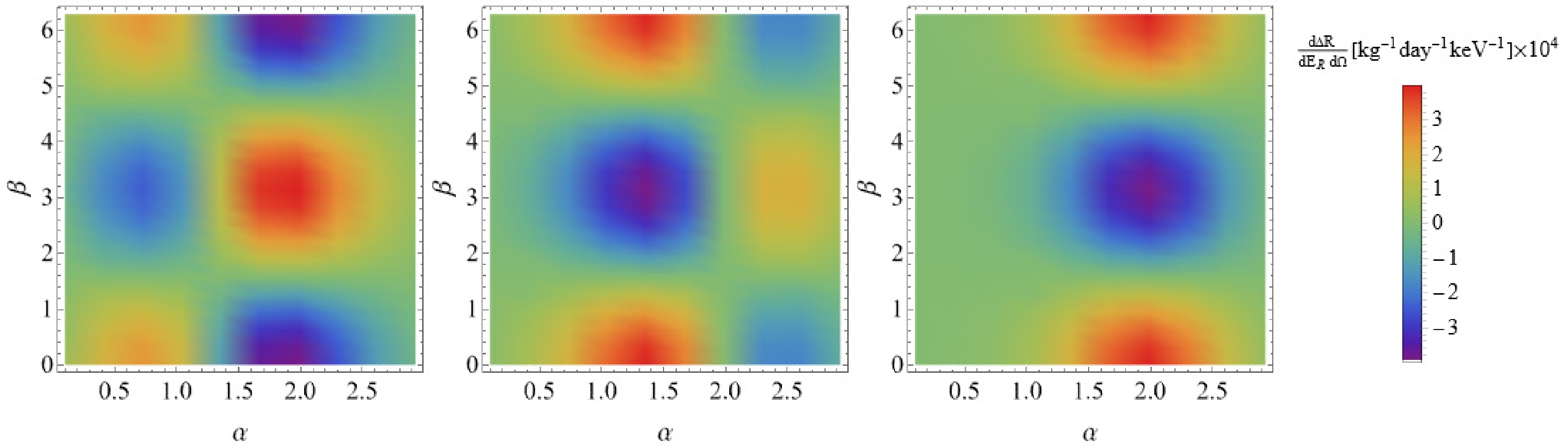 Figure 5. (color online) Purely polarisation dependent part of the differential rate of scattering events plotted against the polar recoil angle α with the azimuthal angle β. The recoil energy