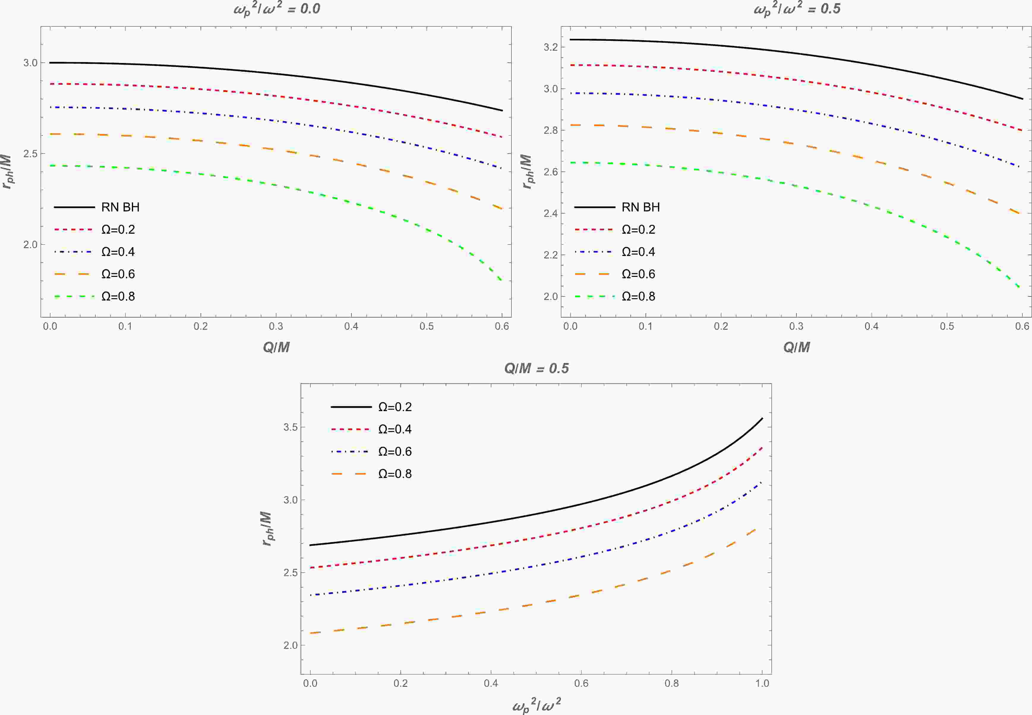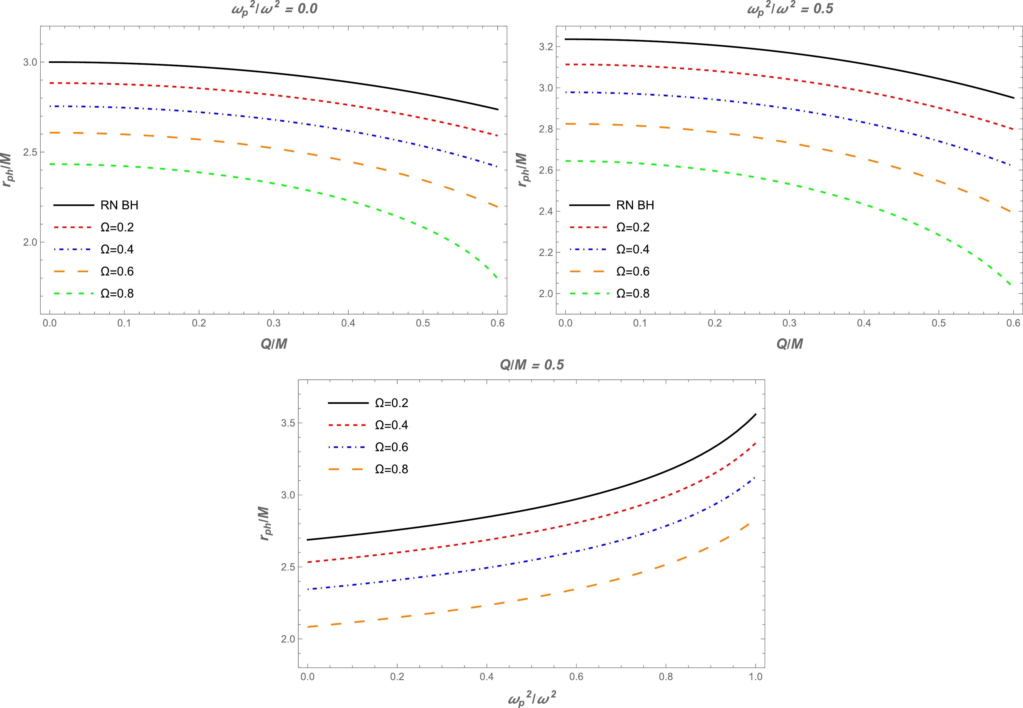 $ Q $ for different values of parameter$ \Omega $ . The plasma frequencies are$ \omega^2_{\rm p}/\omega^2=0.0 $ (vacuum case) and$ \omega^2_{\rm p}/\omega^2=0.5 $ for the left and right plots, respectively. Bottom panel: Dependence of the radius of the photon sphere on the plasma frequency for different values of parameter$ \Omega $ . BH charge is$ Q/M=0.5 $ . -