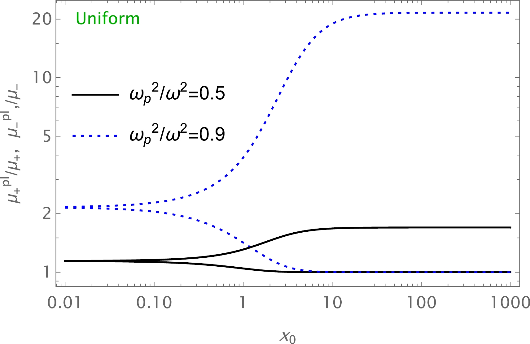 $ \mu^{\rm pl}_{\rm tot} $ can be expressed as follows:$ \mu^\mathrm{pl}_\mathrm{tot}=\mu^\mathrm{pl}_++\mu^\mathrm{pl}_-=\dfrac{x^2_\mathrm{uni}+2}{x_\mathrm{uni}\sqrt{x^2_\mathrm{uni}+4}}\ , $