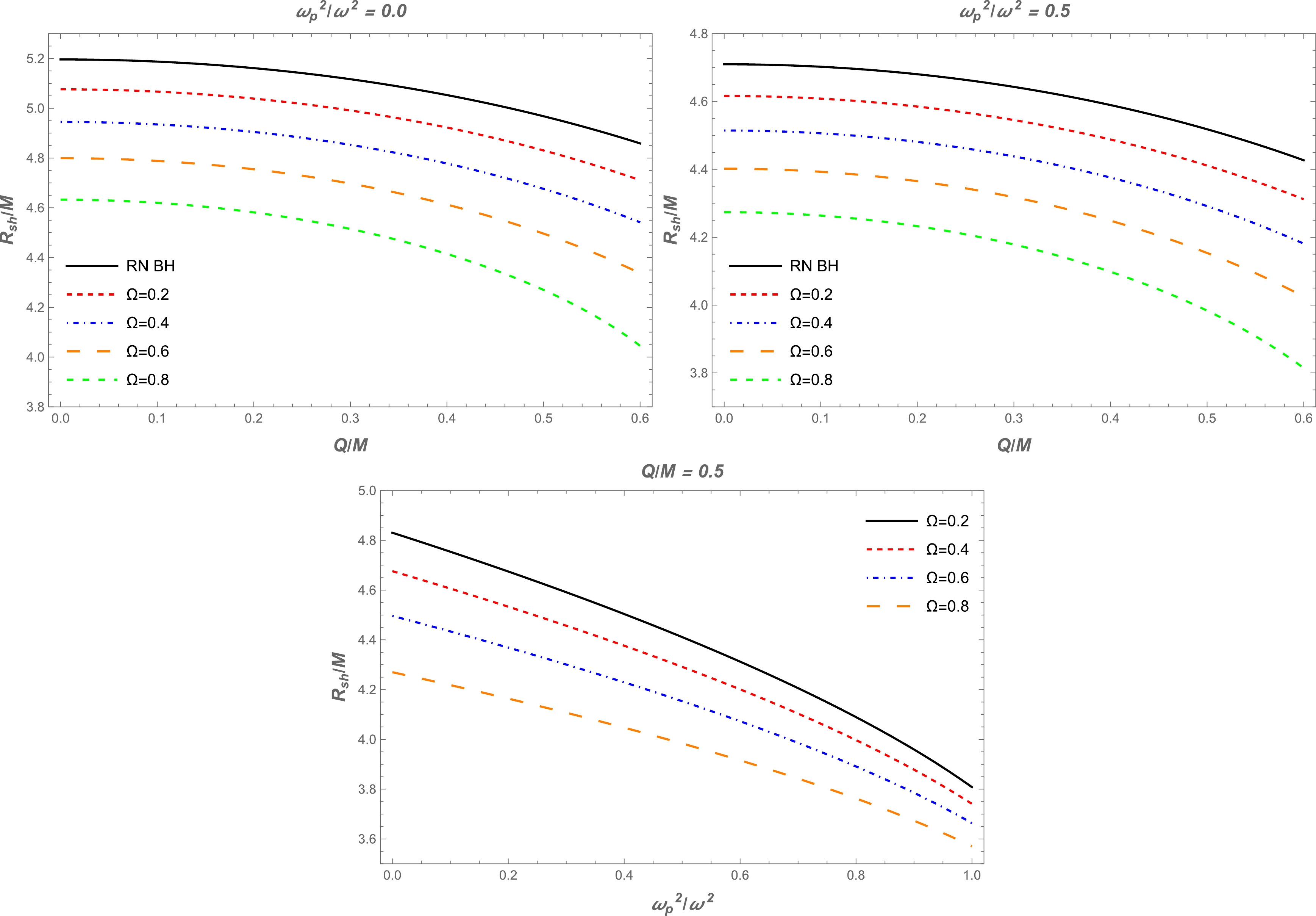 $ Q $ for different values of parameter$ \Omega $ . The plasma frequencies are$ \omega^2_{\rm p}/\omega^2=0.0 $ (vacuum case) and$ \omega^2_{\rm p}/\omega^2=0.5 $ for the left and right plots, respectively. Bottom panel: Fependence of the radius of the BH shadow from the plasma frequency for different values of parameter$ \Omega $ . The charge of the BH is$ Q/M=0.5 $ .$ d_{\rm sh}=\frac{D\theta}{M}\ . $