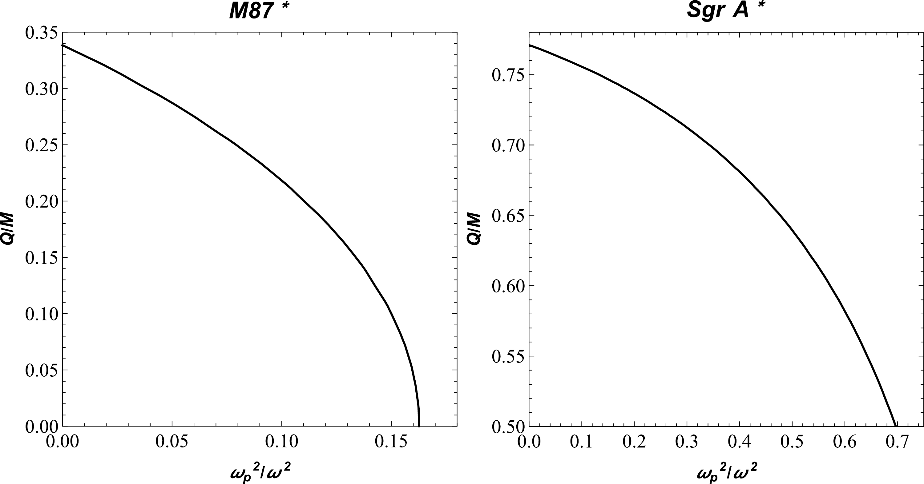 $d_{\rm sh}=2R_{\rm sh}$ , we can easily get the expression for the diameter of the BH shadow. Thus, the diameter of the BH shadow$d^{\rm M87*}_{\rm sh}=(11 \pm 1.5)M$ for M87* and$d^{\rm Sgr*}_{\rm sh}=(9.5 \pm 1.4)M$ for Sgr A*. From observational EHT data, we can find the lower limits on the quantities$ Q $ and$ \omega^2_{\rm p}/\omega^2 $ for the supermassive BHs at the centers of the galaxies Sgr A* and M87*. This is demonstrated numerically in Fig. 3. -