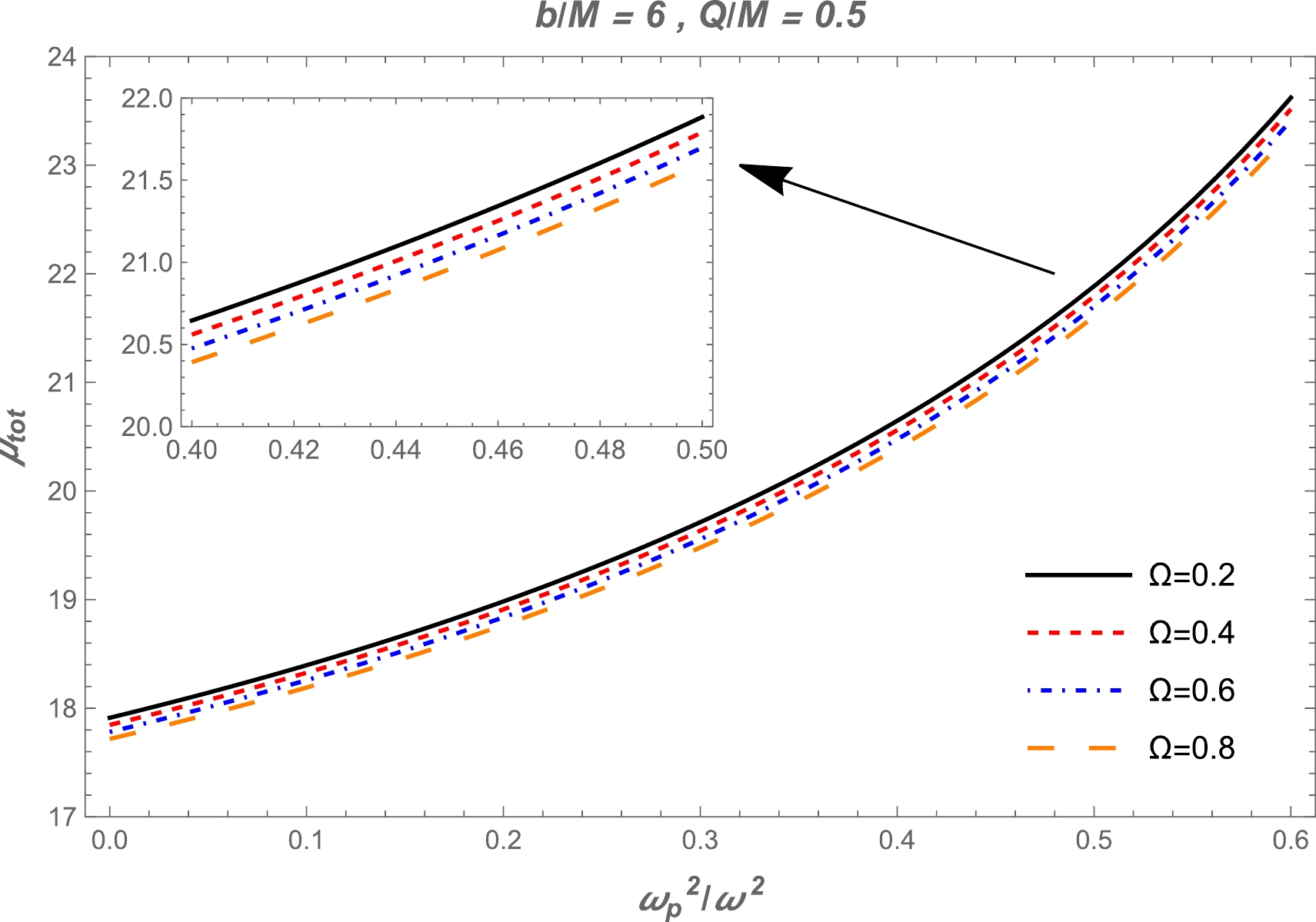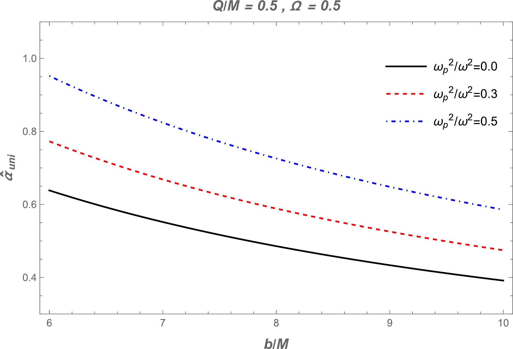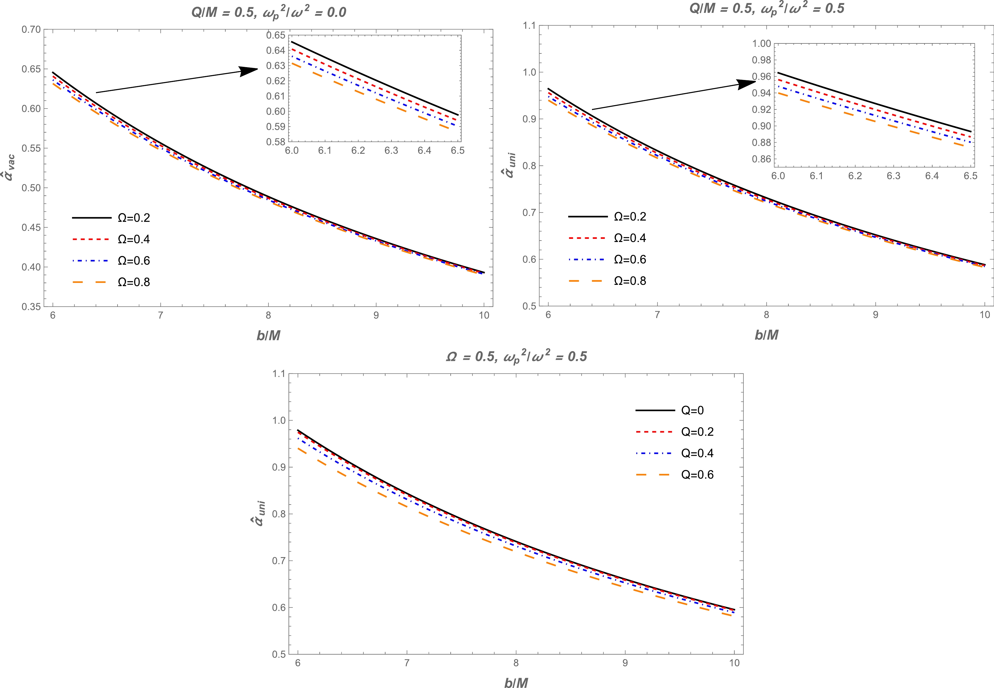 $\alpha_{\rm vac}$ on the impact parameter$ b $ for different values of parameter$ \Omega $ ; here,$ Q/M=0.5 $ and$ \omega^2_{\rm p} / \omega^2=0 $ . Dependence of the deflection angle$ \hat{\alpha}_{\text{uni}} $ on the impact parameter$ b $ for the different values of the parameter$ \Omega $ (top right panel) and BH charge (bottom panel). -