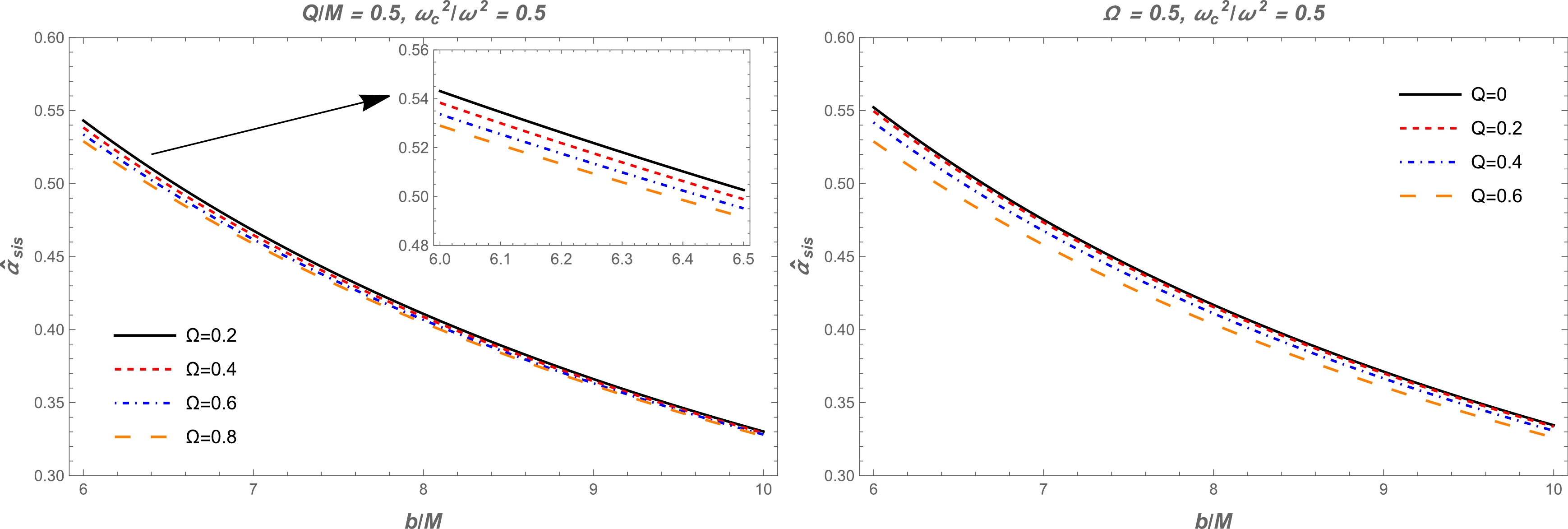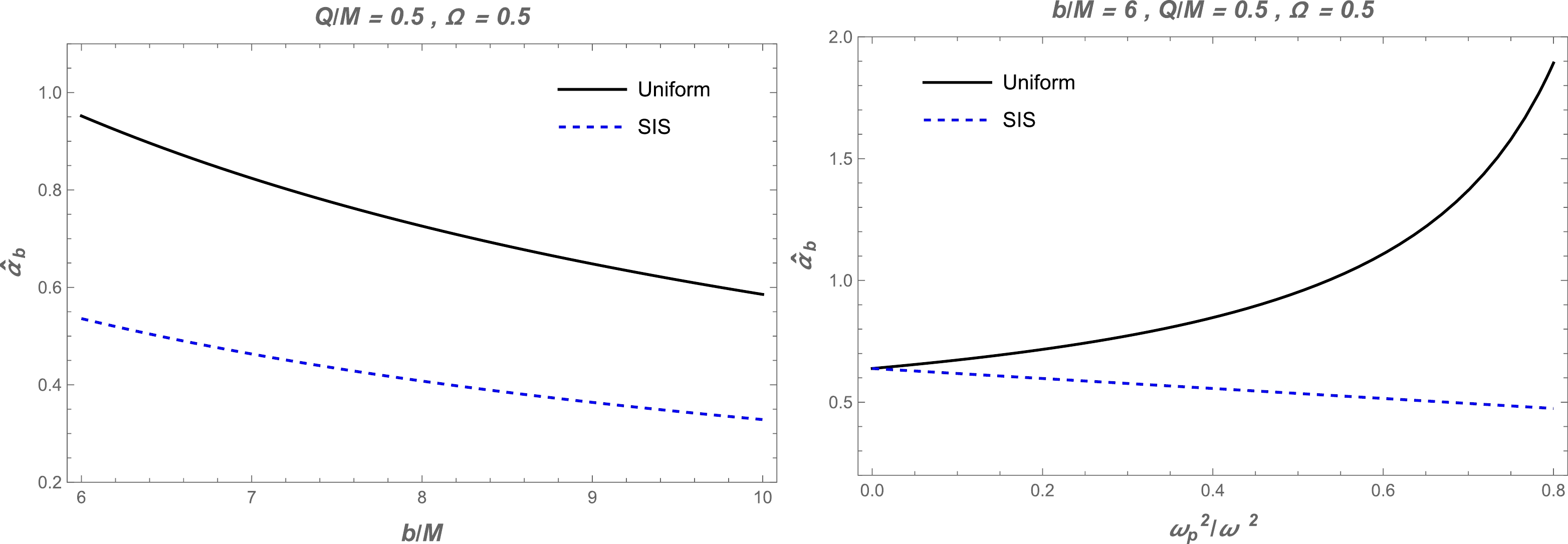 $ \hat{\alpha }_{\text{b}} $ on the impact parameter$ b $ . The other parameters are$ Q/M=0.5 $ &$ \Omega=0.5 $ . Right panel: Deflection angle$ \hat{\alpha }_{b} $ as a function of the plasma parameters. The other parameters are$ b/M=6 $ ,$ Q/M=0.5 $ , and$ \Omega=0.5 $ . -