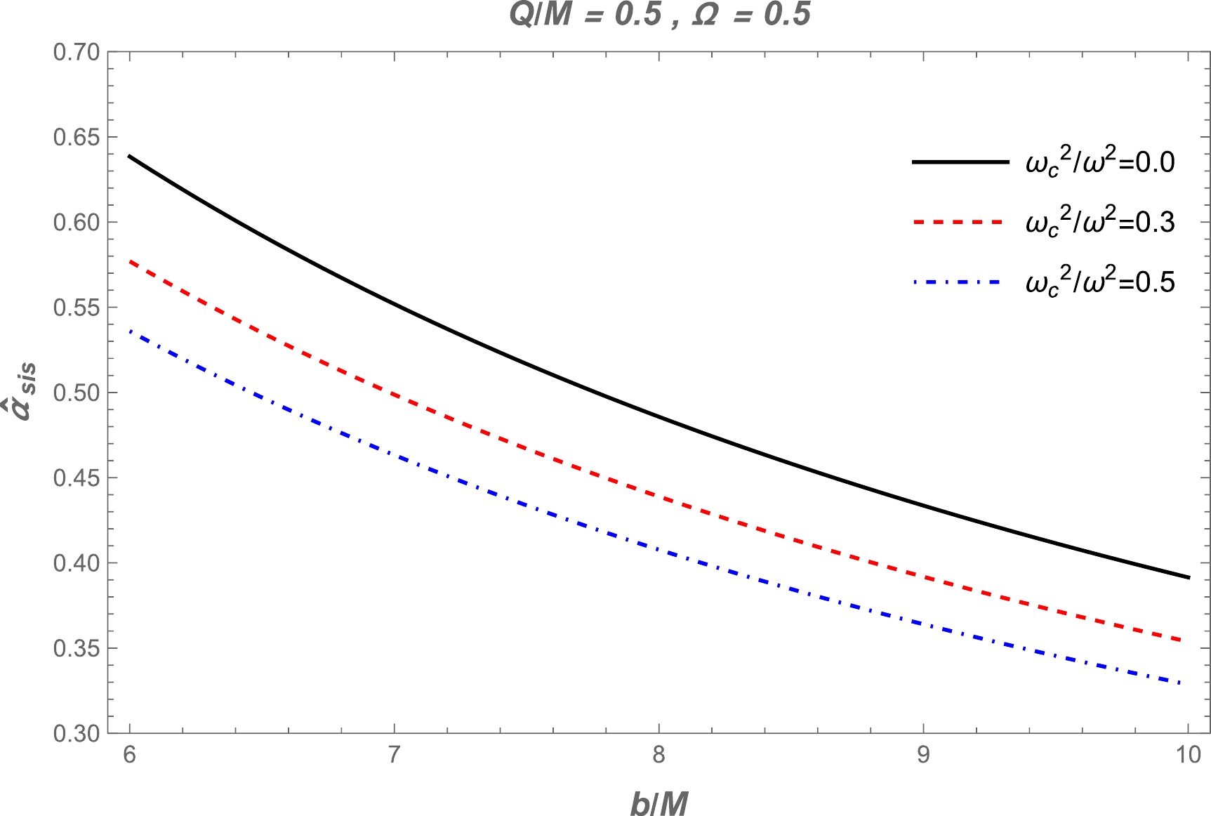 $ \alpha_{\rm sh} $ of the BH can be defined as [96, 97]$ \begin{aligned}[b] \sin^2 \alpha_{\text{sh}}=\;&\frac{\gamma^2(r_{\text{ph}})}{\gamma^2(r_{\text{o}})}, \\=\;&\frac{r_{\text{ph}}^2\left[\dfrac{1}{f(r_{\text{ph}})}-\dfrac{\omega^2_{\rm p}(r_{\text{ph}})}{\omega^2_0}\right]}{r_{\text{o}}^2\left[\dfrac{1}{f(r_{\text{o}})}-\dfrac{\omega^2_{\rm p}(r_{\text{o}})}{\omega^2_0}\right]}, \end{aligned} $