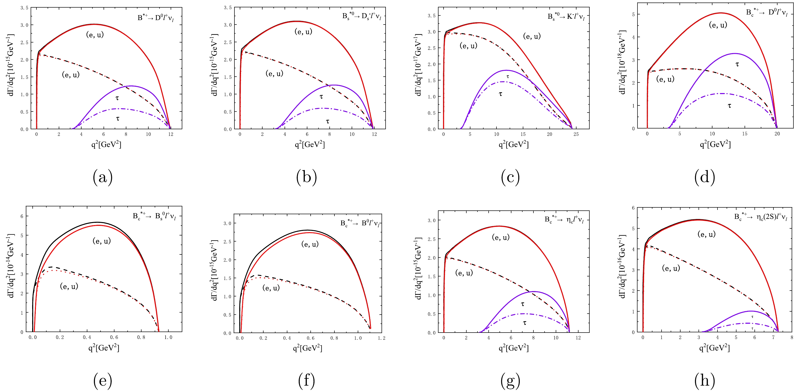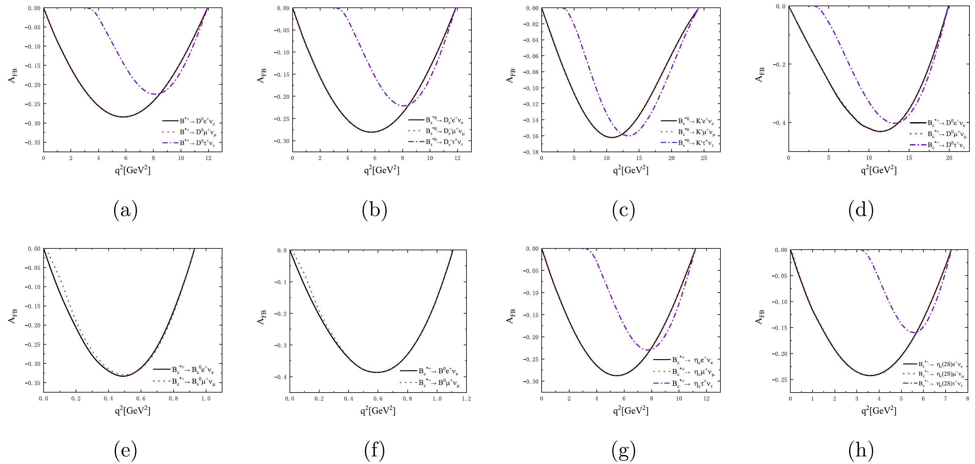 As the flavor changing processes in the Standard Model, the semileptonic heavy flavor meson decays are crucial for extracting the Cabibbo-Kobayashi-Maskawa (CKM) matrix elements. The form factors involving the dynamic information are essential in these semileptonic decays. Based on the form factors and helicity amplitudes provided in the previous section, the branching ratios of the semileptonic $ B^{*+} $ ,$ B_{s}^{*0} $ , and$ B_{c}^{*+} $ decays are presented in Table 7. We also define two other physical observables, that is the forward-backward asymmetry$ A_{FB} $ and the longitudinal polarization fraction$ f_{L} $ , to study the impact of lepton mass and provide a more detailed physical picture for the semileptonic decays. The corresponding results are listed in Tables 8 and 9, respectively. The theoretical uncertainties in our calculations are caused by the decay widths of the initial mesons and the decay constants of the initial and final state mesons, respectively. Further details are discussed below:Channels This work BS [45] WSB [7] $ B^{*+} \to \bar{D}^{0}e^{+}{\nu}_{e} $   $ (5.19^{+1.36+0.17+0.19}_{-0.89-0.02-0.04})\times10^{-8} $   $ 3.29\times10^{-8} $   $ 2.29\times10^{-8} $   $ B^{*+} \to \bar{D}^{0}\mu^{+}{\nu}_{\mu} $   $ (5.16^{+1.35+0.17+0.18}_{-0.89-0.02-0.04})\times10^{-8} $   $ 3.27\times10^{-8} $   $ 2.29\times10^{-8} $   $ B^{*+} \to \bar{D}^{0}\tau^{+}{\nu}_{\tau} $   $ (1.30^{+0.34+0.04+0.04}_{-0.22-0.01-0.00})\times10^{-8} $   $ 0.82\times10^{-8} $   $ 0.68\times10^{-8} $   $ B_{s}^{*0} \to D_{s}^{-}e^{+}{\nu}_{e} $   $ (3.25^{+0.77+0.01+0.11}_{-0.52-0.11-0.01})\times10^{-7} $   $ 2.04\times10^{-7} $   $ 1.39\times10^{-7} $   $ B_{s}^{*0} \to D_{s}^{-}\mu^{+}{\nu}_{\mu} $   $ (3.23^{+0.77+0.01+0.11}_{-0.52-0.11-0.01})\times10^{-7} $   $ 2.03\times10^{-7} $   $ 1.39\times10^{-7} $   $ B_{s}^{*0} \to D_{s}^{-}\tau^{+}{\nu}_{\tau} $   $ (8.09^{+1.92+0.03+0.21}_{-1.30-0.24-0.03})\times10^{-8} $   $ 5.35\times10^{-8} $   $ 4.08\times10^{-8} $   $ B_{s}^{*0} \to K^{-}e^{+}{\nu}_{e} $   $ (6.06^{+1.43+0.56+0.31}_{-0.98-0.44-0.17})\times10^{-9} $   − $ 1.67\times10^{-9} $   $ B_{s}^{*0} \to K^{-}\mu^{+}{\nu}_{\mu} $   $ (6.03^{+1.43+0.56+0.30}_{-0.97-0.44-0.17})\times10^{-9} $   − $ 1.67\times10^{-9} $   $ B_{s}^{*0} \to K^{-}\tau^{+}{\nu}_{\tau} $   $ (2.56^{+0.61+0.18+0.45}_{-0.41-0.13-0.08})\times10^{-9} $   − $ 1.07\times10^{-9} $   $ B_{c}^{*+} \to D^{0} e^{+}{\nu}_{e} $   $ (1.36^{+0.35+0.13+0.20}_{-0.23-0.13-0.15})\times10^{-9} $   $ 1.60\times10^{-9} $   $ B_{c}^{*+} \to D^{0} \mu^{+}{\nu}_{\mu} $   $ (1.36^{+0.35+0.13+0.20}_{-0.23-0.13-0.15})\times10^{-9} $   $ 1.60\times10^{-9} $   − $ B_{c}^{*+} \to D^{0} \tau^{+}{\nu}_{\tau} $   $ (0.65^{+0.17+0.07+0.08}_{-0.11-0.06-0.07})\times10^{-9} $   $ 1.08\times10^{-9} $   − $ B_{c}^{*+} \to B^{0}_{s} e^{+}{\nu}_{e} $   $ (7.51^{+1.92+0.17+0.10}_{-1.27-0.08-0.37})\times10^{-7} $   $ 9.43\times10^{-7} $   − $ B_{c}^{*+} \to B^{0}_{s} \mu^{+}{\nu}_{\mu} $   $ (7.06^{+1.80+0.14+0.06}_{-1.19-0.10-0.32})\times10^{-7} $   $ 8.96\times10^{-7} $   − $ B_{c}^{*+} \to B^{0} e^{+}{\nu}_{e} $   $ (4.37^{+1.11+0.14+0.27}_{-0.74-0.12-0.27})\times10^{-8} $   $ 5.78\times10^{-8} $   − $ B_{c}^{*+} \to B^{0} \mu^{+}{\nu}_{\mu} $   $ (4.15^{+1.06+0.11+0.24}_{-0.70-0.10-0.24})\times10^{-8} $   $ 5.57\times10^{-8} $   − $ B_{c}^{*+} \to \eta_{c} e^{+}{\nu}_{e} $   $ (4.48^{+1.14+0.28+0.40}_{-0.76-0.10-0.50})\times10^{-7} $   $ 4.20\times10^{-7} $   − $ B_{c}^{*+} \to \eta_{c} \mu^{+}{\nu}_{\mu} $   $ (4.45^{+1.14+0.27+0.39}_{-0.75-0.10-0.49})\times10^{-7} $   $ 4.19\times10^{-7} $   − $ B_{c}^{*+} \to \eta_{c} \tau^{+}{\nu}_{\tau} $   $ (1.03^{+0.26+0.07+0.07}_{-0.17-0.04-0.10})\times10^{-7} $   $ 1.26\times10^{-7} $   − $ B_{c}^{*+} \to \eta_{c}(2S) e^{+}{\nu}_{e} $   $ (5.65^{+1.44+0.02+0.59}_{-0.96-0.03-0.29})\times10^{-8} $   − − $ B_{c}^{*+} \to \eta_{c}(2S) \mu^{+}{\nu}_{\mu} $   $ (5.60^{+1.43+0.02+0.60}_{-0.95-0.03-0.29})\times10^{-8} $   − − $ B_{c}^{*+} \to \eta_{c}(2S) \tau^{+}{\nu}_{\tau} $   $ (4.92^{+1.26+0.11+0.12}_{-0.83-0.11-0.23})\times10^{-9} $   − − Table 7. Branching ratios of the semileptonic decays $ B^{*}_{u,s,c}\to P \ell^{+}{\nu}_{\ell} $ . For each entry, the first error is from the decay width of the initial meson, and the second and third errors are caused by the decay constants of the initial and final mesons, respectively.Channels $ B^{*+} \to \bar{D}^{0}e^{+}\nu_{e} $   $ B^{*+} \to \bar{D}^{0}\mu^{+}\nu_{\mu} $   $ B^{*+} \to \bar{D}^{0}\tau^{+}\nu_{\tau} $   $ A_{FB} $   $ -0.19^{+0.00+0.04+0.04}_{-0.01-0.04-0.04} $   $ -0.19^{+0.00+0.04+0.04}_{-0.01-0.04-0.04} $   $ -0.14^{+0.02+0.00+0.00}_{-0.04-0.00-0.00} $   Channel $ B_{s}^{*0} \to D^{-}_{s}e^{+}\nu_{e} $   $ B_{s}^{*0} \to D^{-}_{s}\mu^{+}\nu_{\mu} $   $ B_{s}^{*0} \to D^{-}_{s}\tau^{+}\nu_{\tau} $   $ A_{FB} $   $ -0.19^{+0.03+0.00+0.00}_{-0.04-0.00-0.00} $   $ -0.18^{+0.03+0.01+0.00}_{-0.04-0.01-0.00} $   $ -0.13^{+0.02+0.00+0.00}_{-0.03-0.00-0.00} $   Channels $ B_{s}^{*0} \to K^{-}e^{+}\nu_{e} $   $ B_{s}^{*0} \to K^{-}\mu^{+}\nu_{\mu} $   $ B_{s}^{*0} \to K^{+}\tau^{+}\nu_{\tau} $   $ A_{FB} $   $ -0.10^{+0.02+0.00+0.01}_{-0.02-0.00-0.01} $   $ -0.10^{+0.02+0.00+0.01}_{-0.02-0.00-0.01} $   $ -0.09^{+0.02+0.00+0.01}_{-0.02-0.00-0.01} $   Channels $ B_{c}^{*+} \to D^{0}e^{+}\nu_{e} $   $ B_{c}^{*+} \to D^{0}\mu^{+}\nu_{\mu} $   $ B_{c}^{*+} \to D^{0}\tau^{+}\nu_{\tau} $   $ A_{FB} $   $ -0.28^{+0.05+0.03+0.04}_{-0.07-0.02-0.03} $   $ -0.28^{+0.05+0.03+0.04}_{-0.07-0.02-0.03} $   $ -0.24^{+0.04+0.02+0.03}_{-0.06-0.02-0.02} $   Channels $ B_{c}^{*+} \to \eta_{c}e^{+}\nu_{e} $   $ B_{c}^{*+} \to \eta_{c}\mu^{+}\nu_{\mu} $   $ B_{c}^{*+} \to \eta_{c}\tau^{+}\nu_{\tau} $   $ A_{FB} $   $ -0.19^{+0.03+0.01+0.02}_{-0.05-0.01-0.01} $   $ -0.19^{+0.03+0.01+0.02}_{-0.05-0.01-0.01} $   $ -0.14^{+0.02+0.00+0.02}_{-0.04-0.01-0.01} $   Channels $ B_{c}^{*+} \to \eta_{c}(2S)e^{+}\nu_{e} $   $ B_{c}^{*+} \to \eta_{c}(2S)\m
